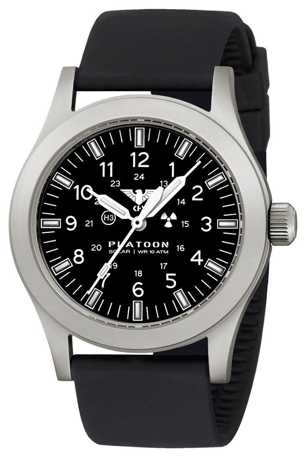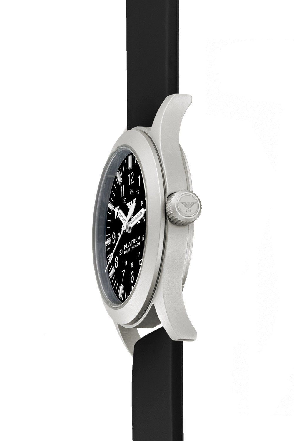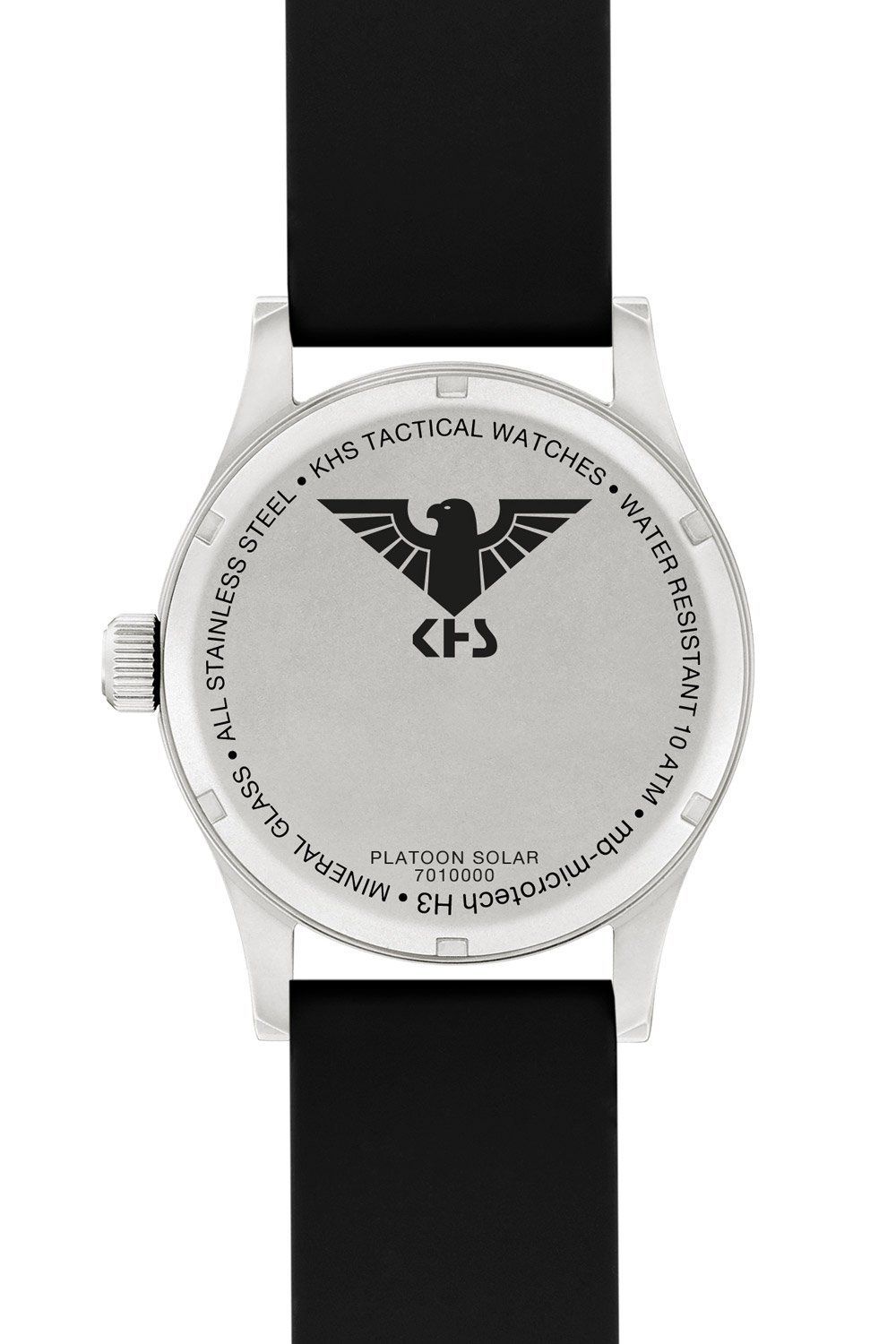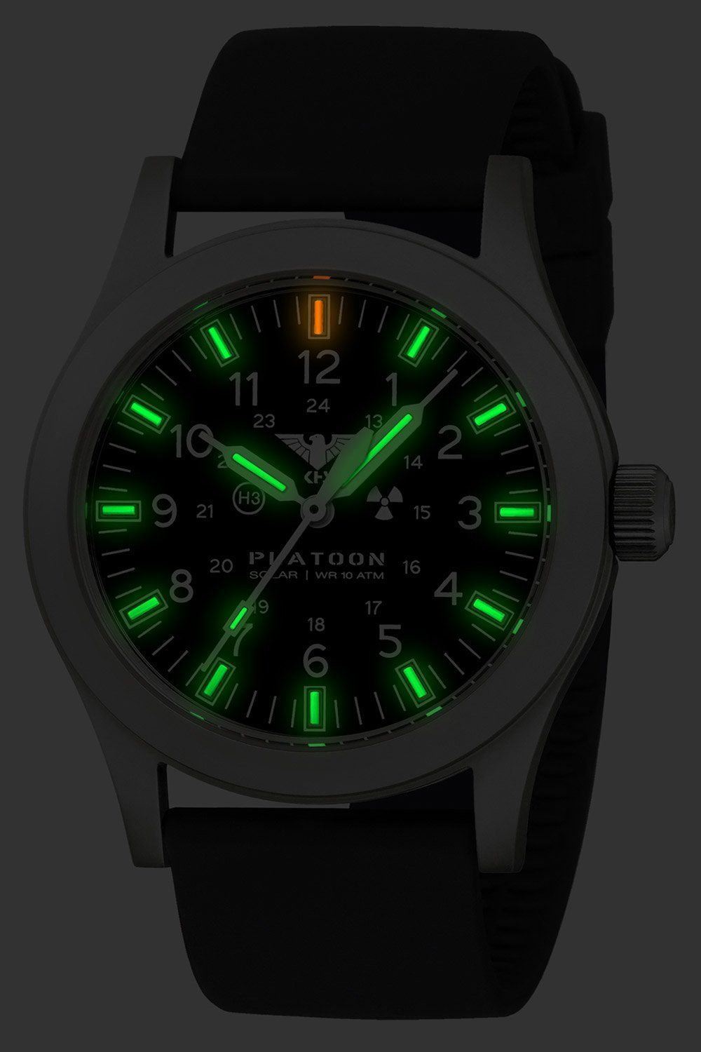 Einsatzuhr mit einem präzisen Solar-Quarzwerk, Gangreserve bis zu 4 Monate, matt-schwarzes Zifferblatt, Zeiger und Stundenmarkierungen mit H3 Field-Beleuchtung, sehr zuverlässige und gute Anzeige bei Dunkelheit durch grüne und orangefarbene Trigalights®, weiße Zahlen, zentraler Sekundenzeiger, Gehäuse aus mattem Edelstahl, verschraubter Gehäuseboden, extra gehärtetes Mineralglas, Armband aus schwarzem Silikon, matte Dornschließe mit Logogravur, wasserdicht bis 10 bar, Breite (ohne Krone) 42 mm,