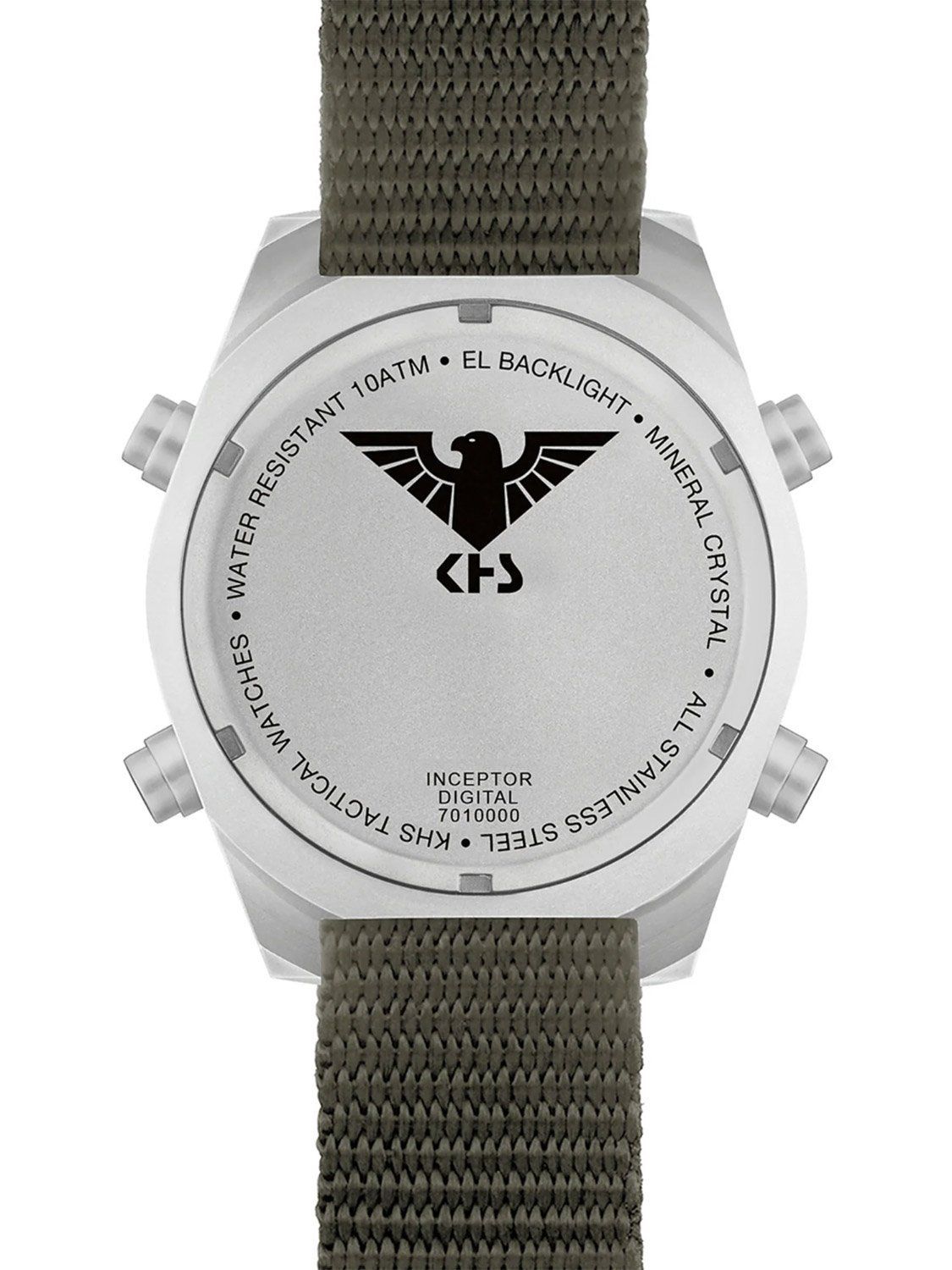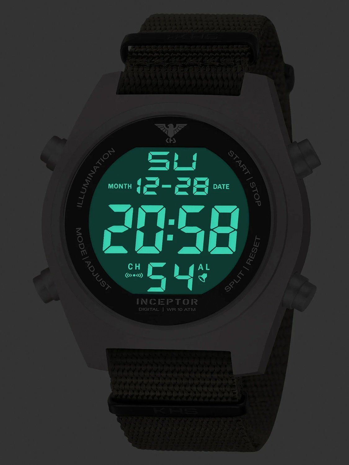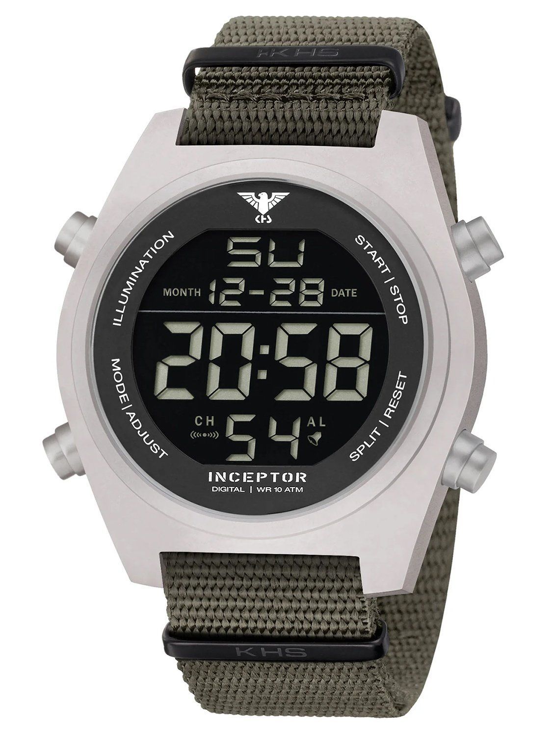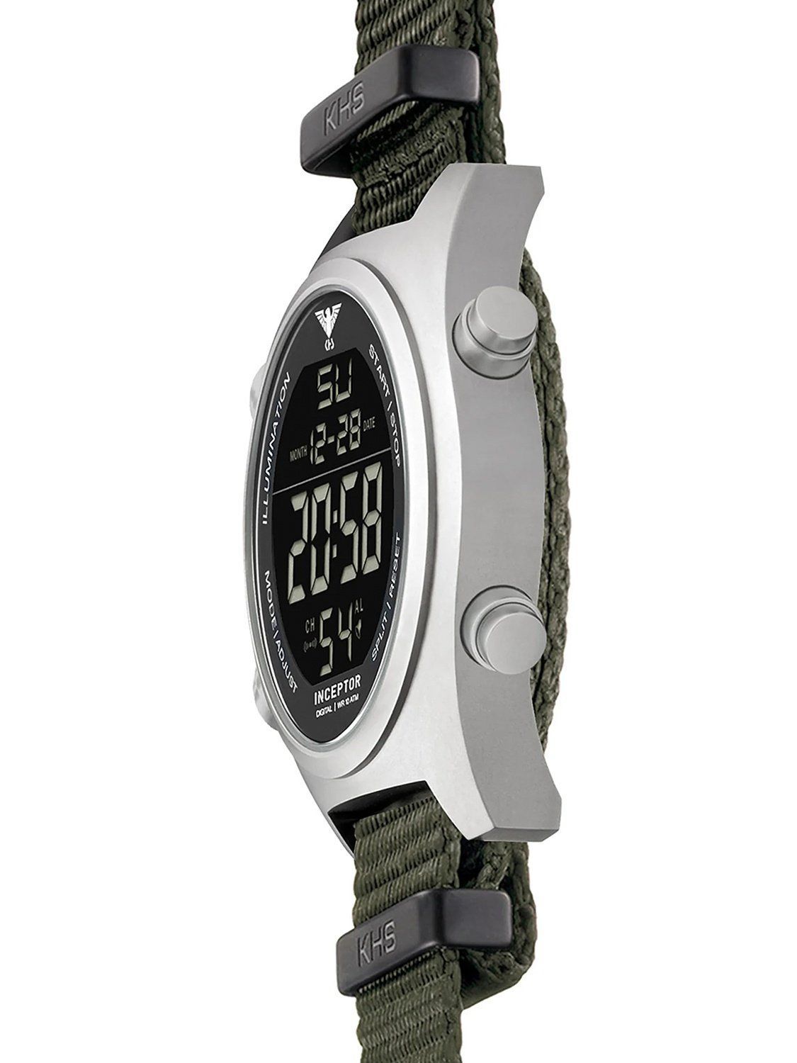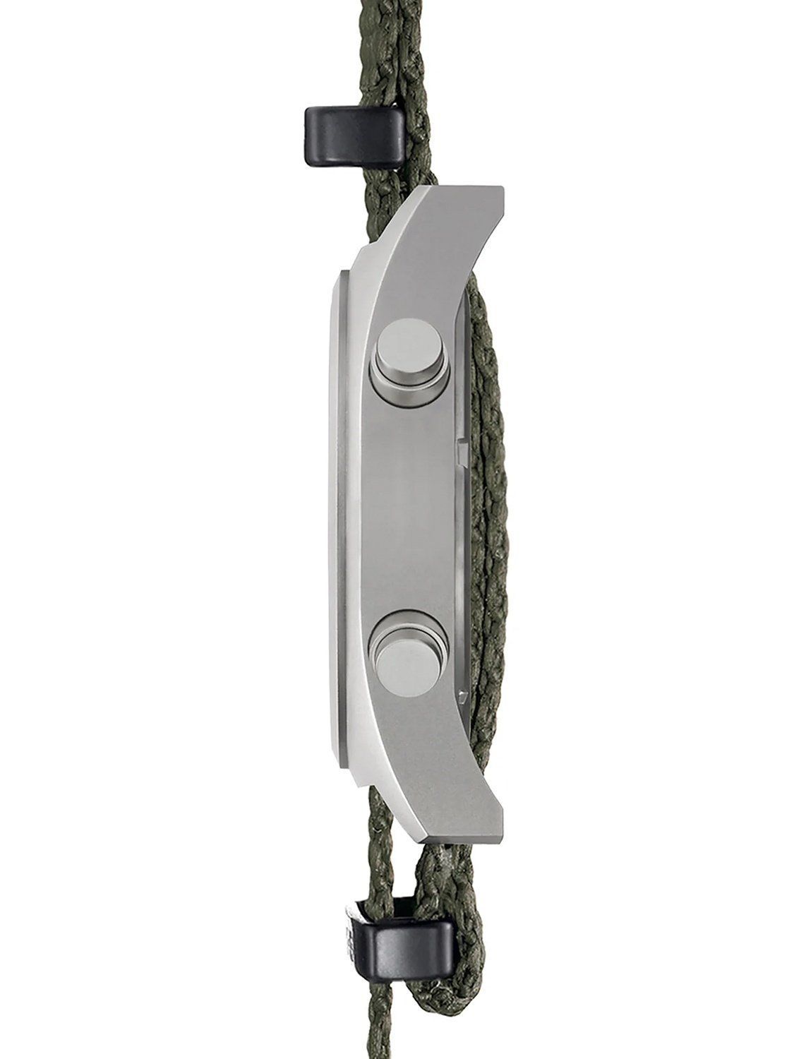 Einsatzuhr mit einem präzisen Digital-Quarzwerk, digitale Anzeige von Uhrzeit, Datum und Wochentag, 12- oder 24-Stunden Anzeigeformat, Stopp- und Alarmfunktion, Schlummer-Funktion (Snooze / Weckwiederholung), Hintergrundbeleuchtung, Gehäuse aus mattem Edelstahl, verschraubter Gehäuseboden, extra gehärtetes Mineralglas, Nato-Armband aus olivgrünem Nylon mit 3 Metallschlaufen, Dornschließe mit Logogravur, wasserdicht bis 10 bar, Breite (ohne Krone) 55 mm, Gehäusehöhe 13 mm