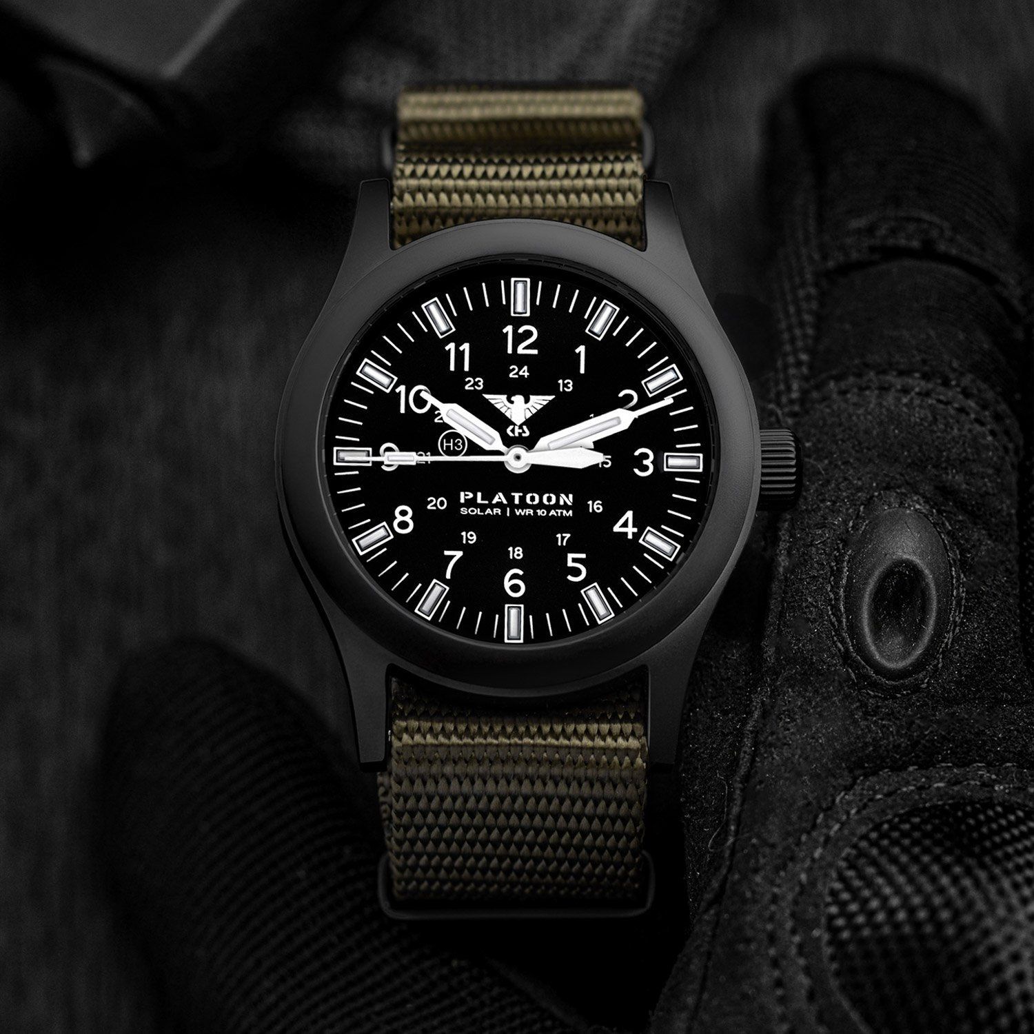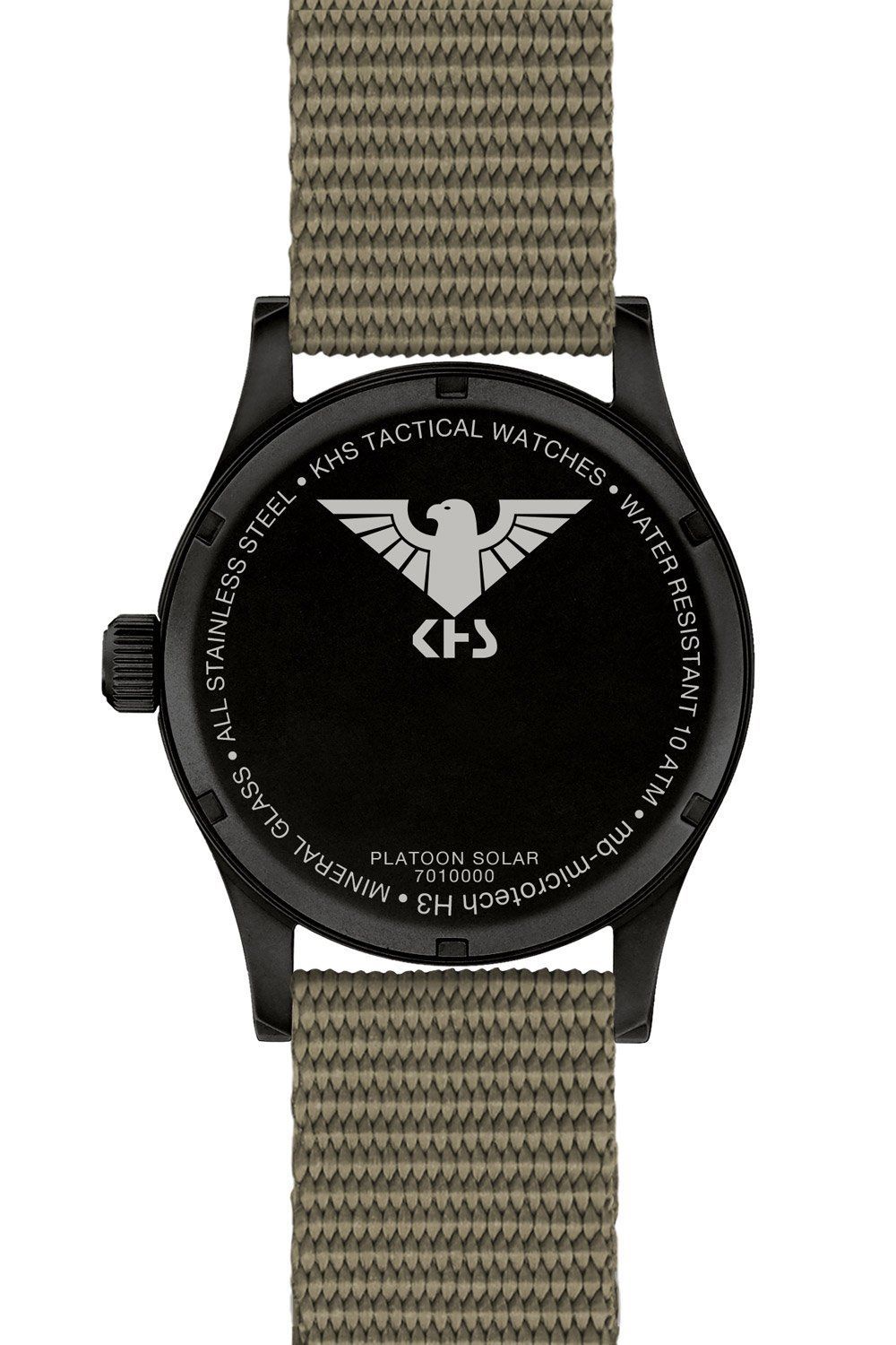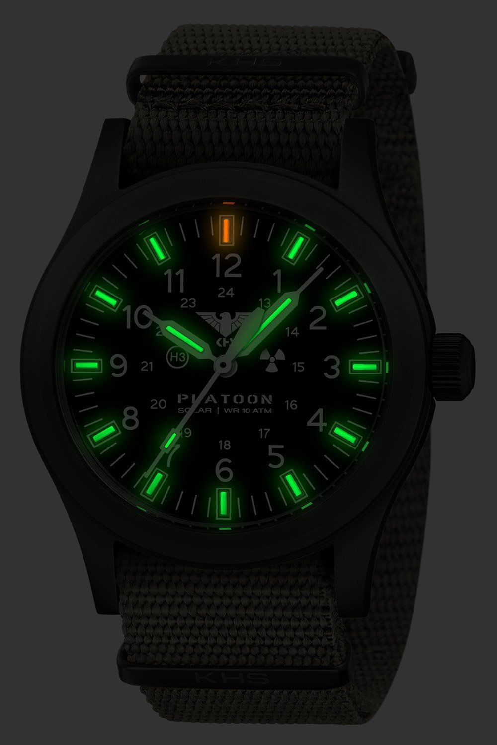 Einsatzuhr mit einem präzisen Solar-Quarzwerk, Gangreserve bis zu 4 Monate, matt-schwarzes Zifferblatt, Zeiger und Stundenmarkierungen mit H3 Field-Beleuchtung, sehr zuverlässige und gute Anzeige bei Dunkelheit durch grüne und orangefarbene Trigalights®, weiße Zahlen, zentraler Sekundenzeiger, Gehäuse aus mattem Edelstahl, schwarz ionen-plattiert, verschraubter Gehäuseboden, extra gehärtetes Mineralglas, Nato-Armband aus steingrauem Nylon mit 3 Metallschlaufen, Dornschließe mit Logogravur, wasse