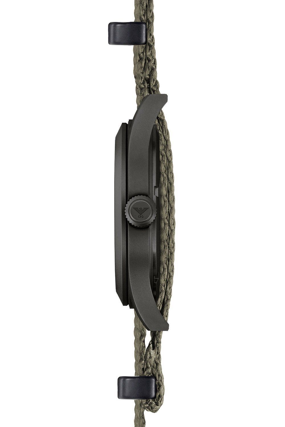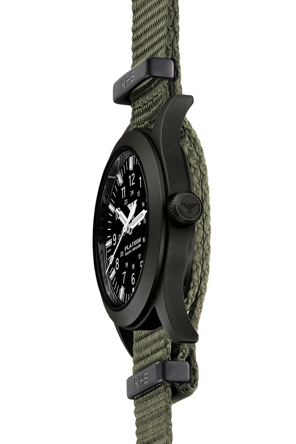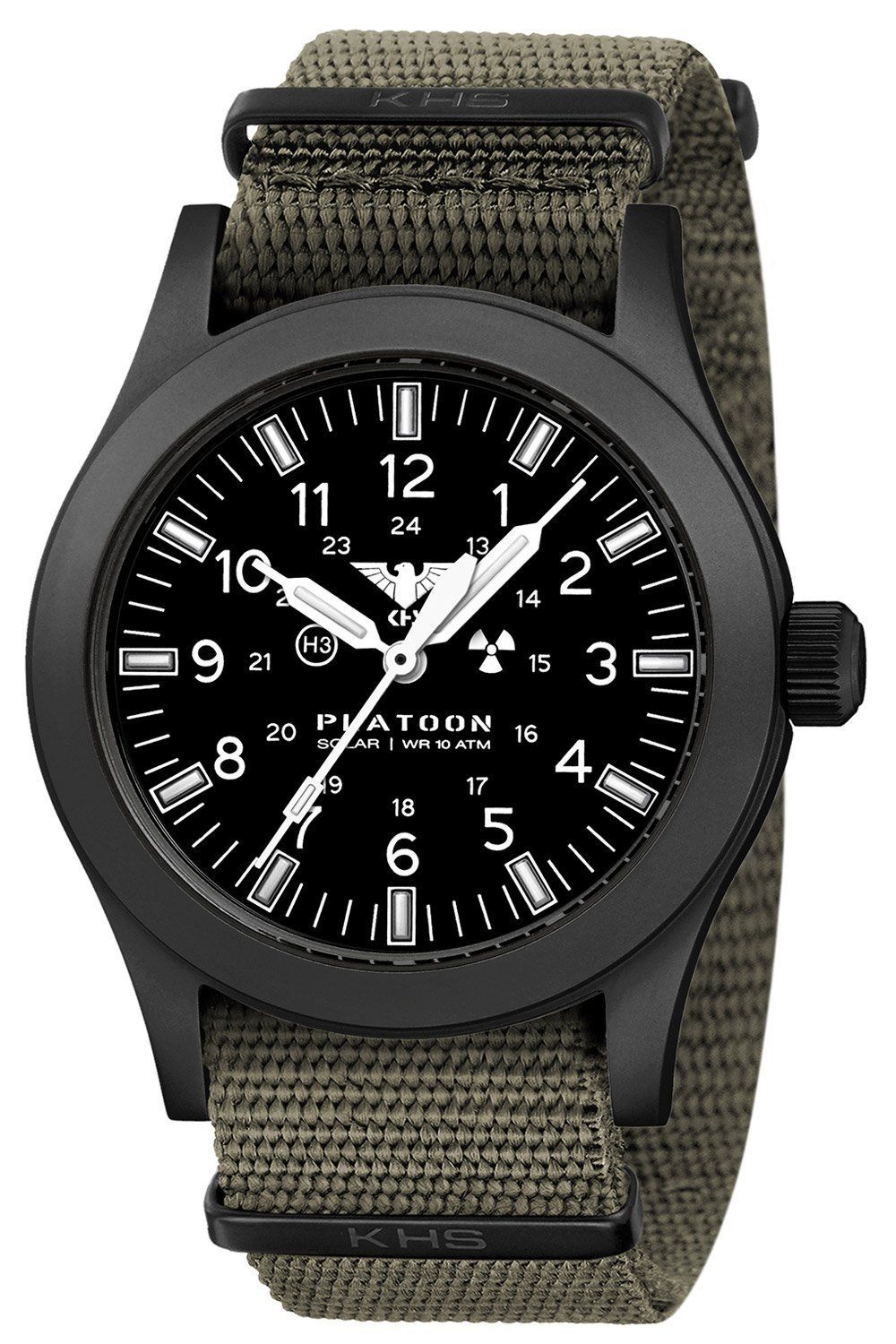 Einsatzuhr mit einem präzisen Solar-Quarzwerk, Gangreserve bis zu 4 Monate, matt-schwarzes Zifferblatt, Zeiger und Stundenmarkierungen mit H3 Field-Beleuchtung, sehr zuverlässige und gute Anzeige bei Dunkelheit durch grüne und orangefarbene Trigalights®, weiße Zahlen, zentraler Sekundenzeiger, Gehäuse aus mattem Edelstahl, schwarz ionen-plattiert, verschraubter Gehäuseboden, extra gehärtetes Mineralglas, Nato-Armband aus steingrauem Nylon mit 3 Metallschlaufen, Dornschließe mit Logogravur, wasse