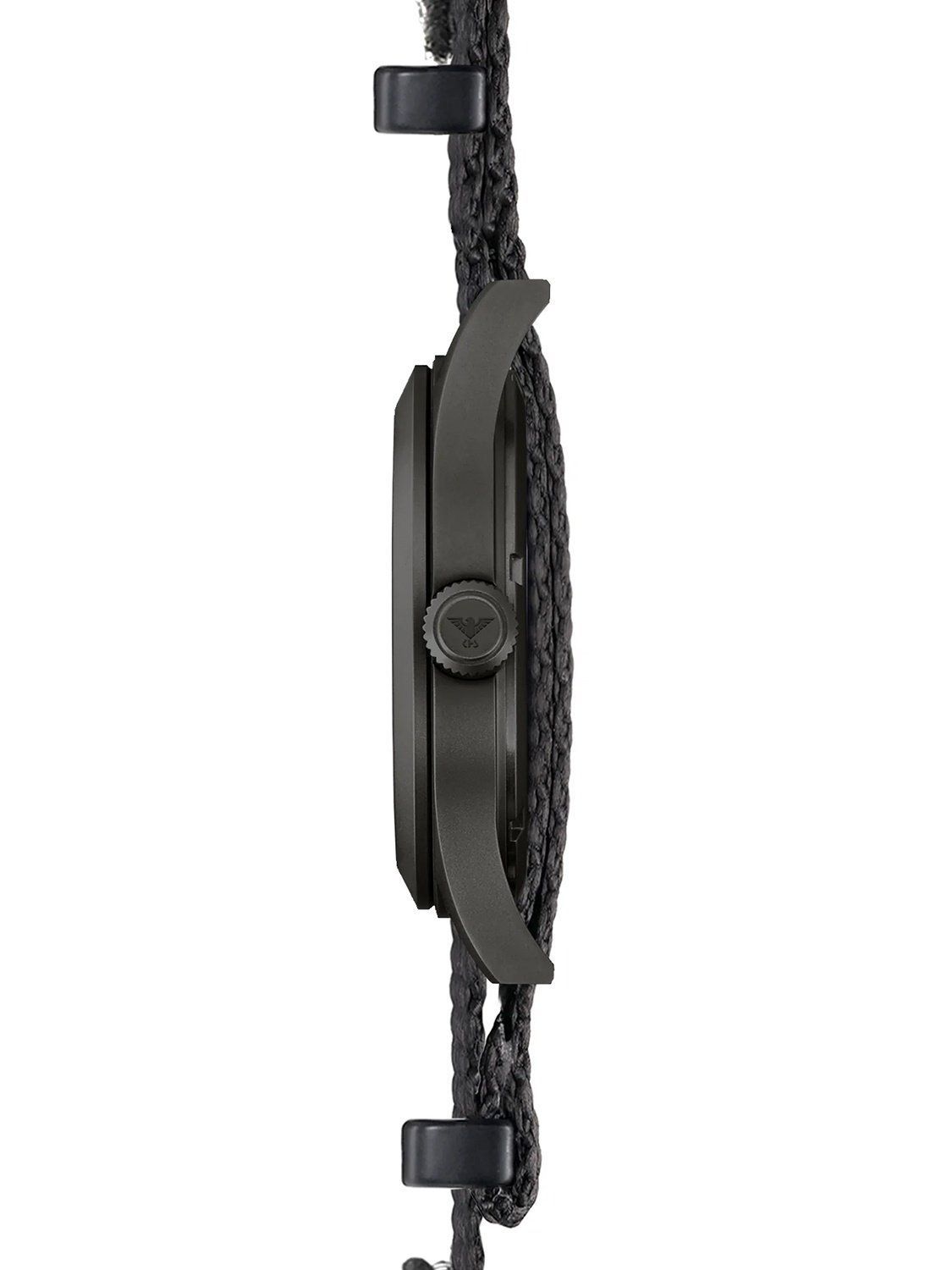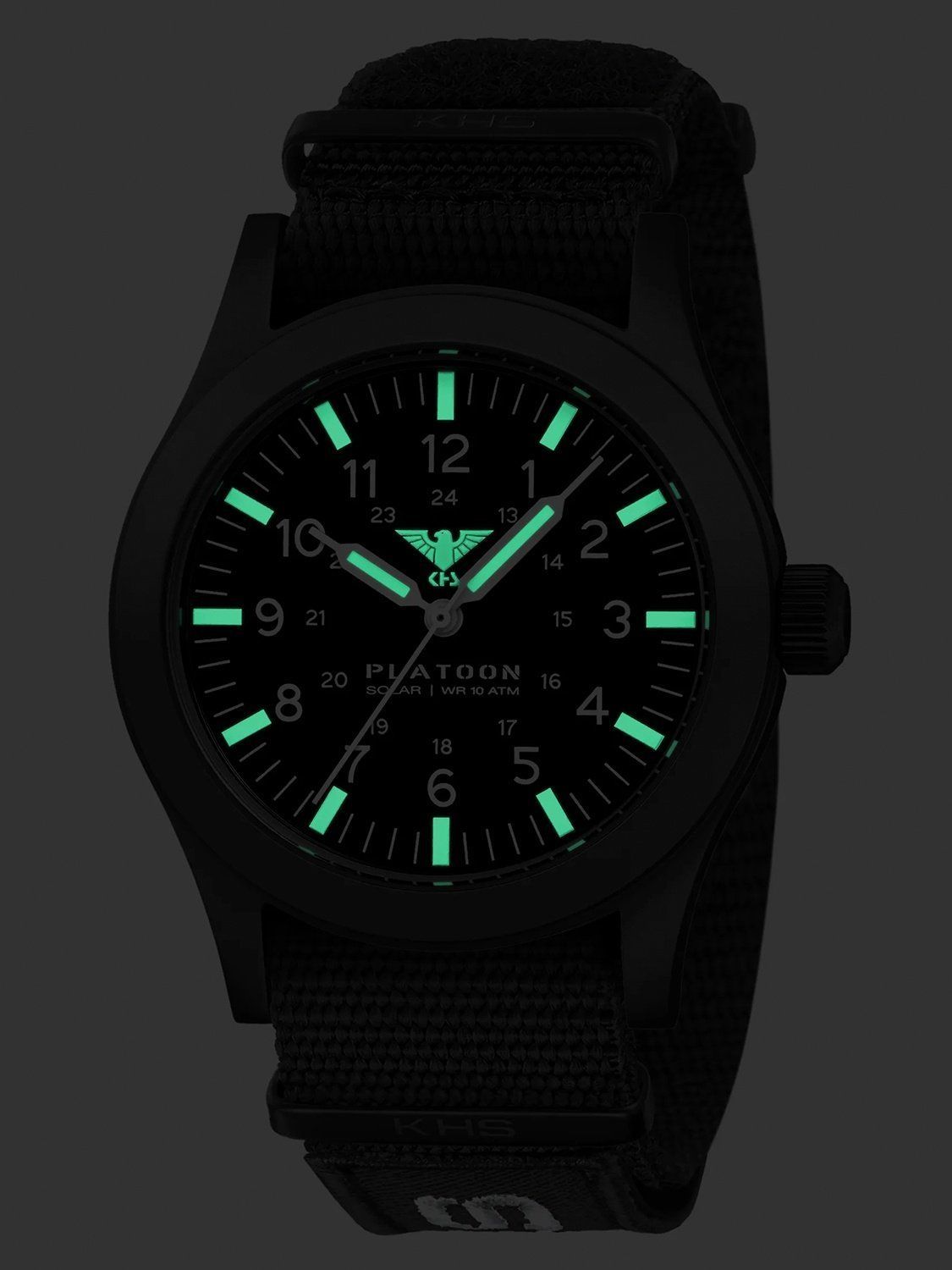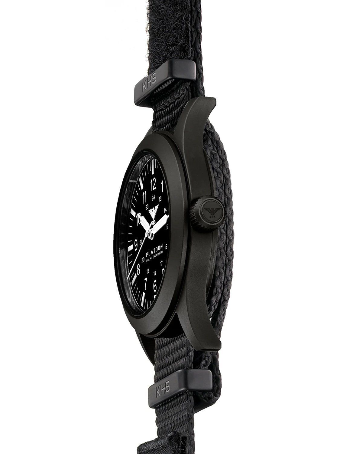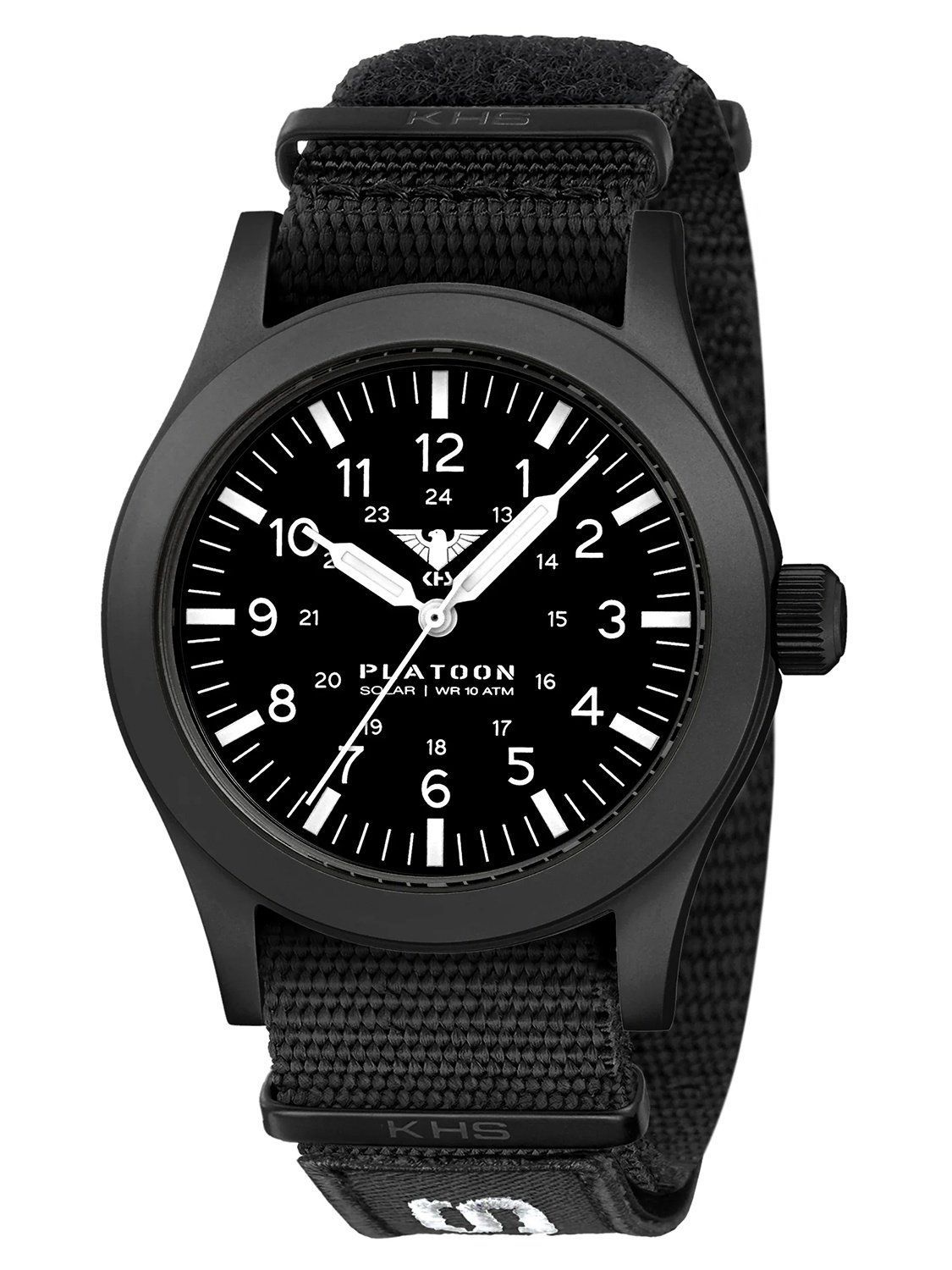 Einsatzuhr mit einem präzisen Solar-Quarzwerk, Gangreserve bis zu 4 Monate, matt-schwarzes Zifferblatt, Leuchtzeiger und -markierungen, weiße Zahlen, zentraler Sekundenzeiger, Gehäuse aus mattem, schwarz ionen-plattiertem Edelstahl, verschraubter Gehäuseboden, extra gehärtetes Mineralglas, Nato-Armband aus schwarzem Nylon mit 3 Metallschlaufen, abnehmbarer Logo-Patch, Dornschließe mit Logogravur, wasserdicht bis 10 bar, Breite (ohne Krone) 42 mm, Gehäusehöhe 10,4 mm