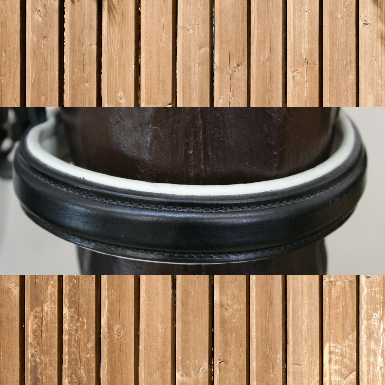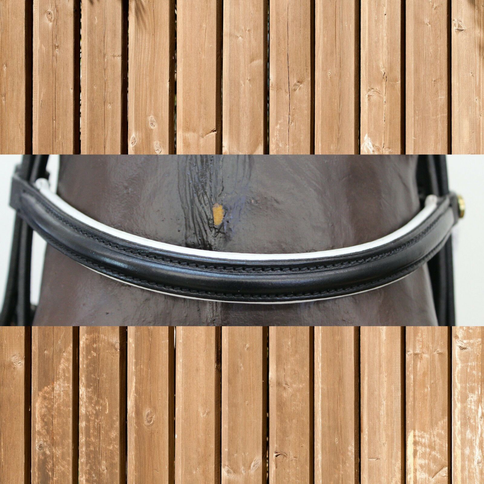 Kieffer Kandare Ergonimoc Line II weiß-unterlegt (ohne Kehlriemen) · Aus erstklassigem Qualitätsleder in bester Verarbeitung · Englisches Reithalfter * ohne Kehlriemen · Weich abgepolsterter Nasen- und Stirnriemen · Stirn- und Nasenriemen weiß unterlegt · Mit eckigen Chromschnallen · mit Zaumhaken a