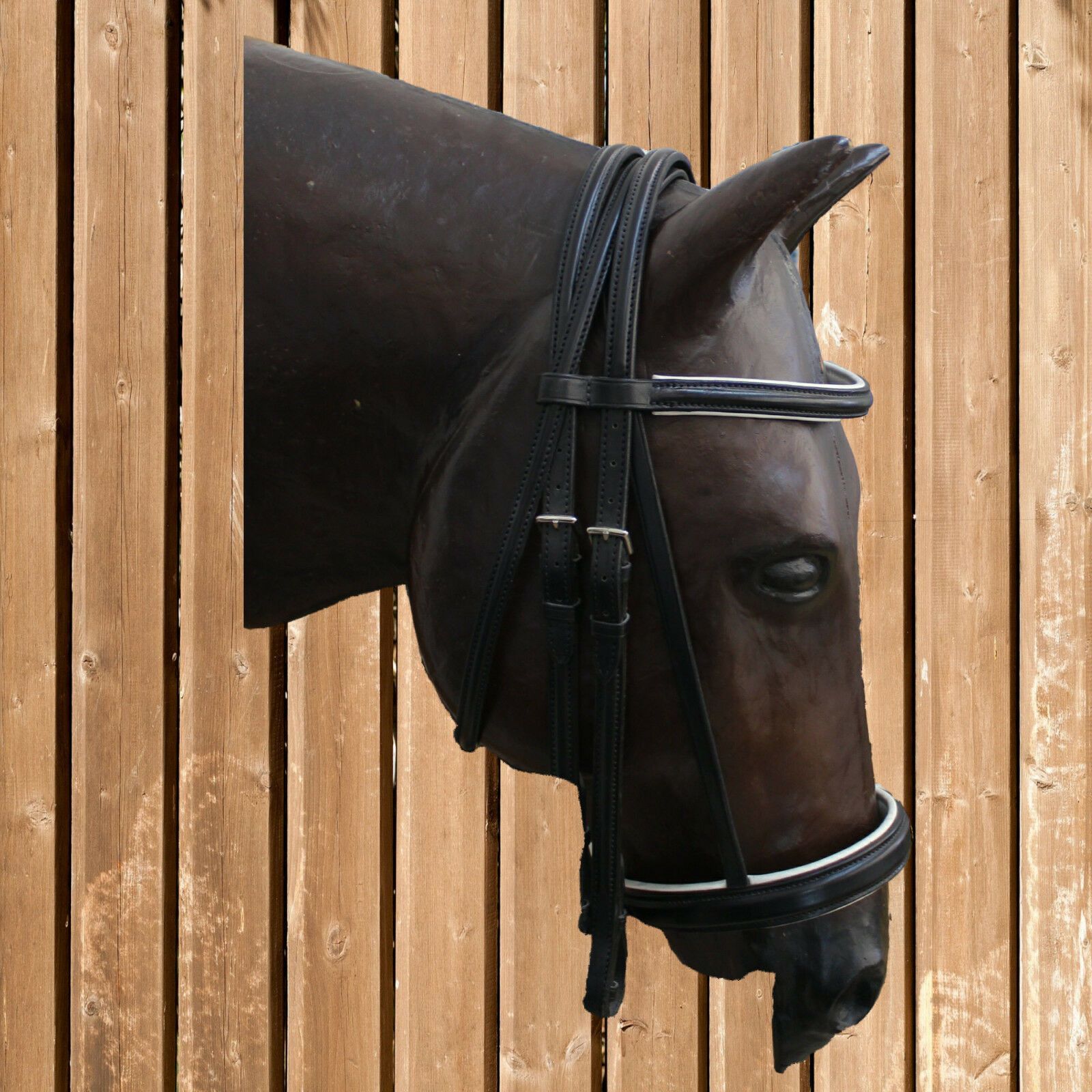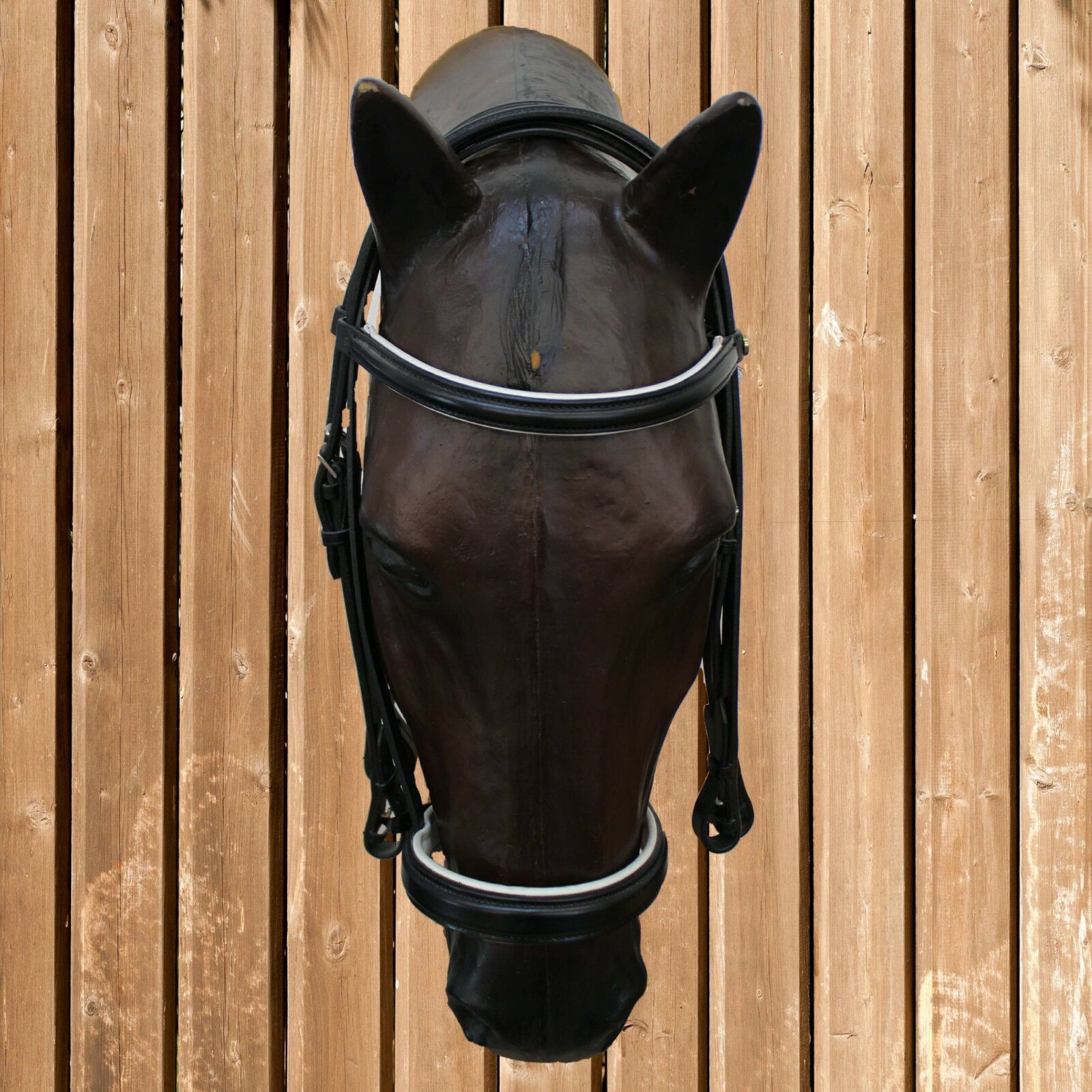 Kieffer Kandare Ergonimoc Line II weiß-unterlegt · Aus erstklassigem Qualitätsleder in bester Verarbeitung · Englisches Reithalfter · Weich abgepolsterter Nasen- und Stirnriemen · Stirn- und Nasenriemen weis unterlegt · Mit eckigen Chromschnallen · mit Zaumh
