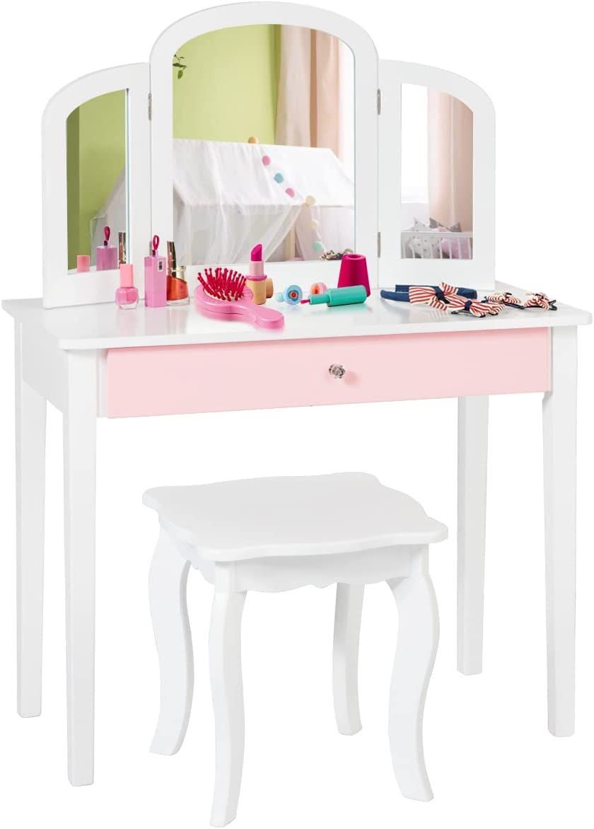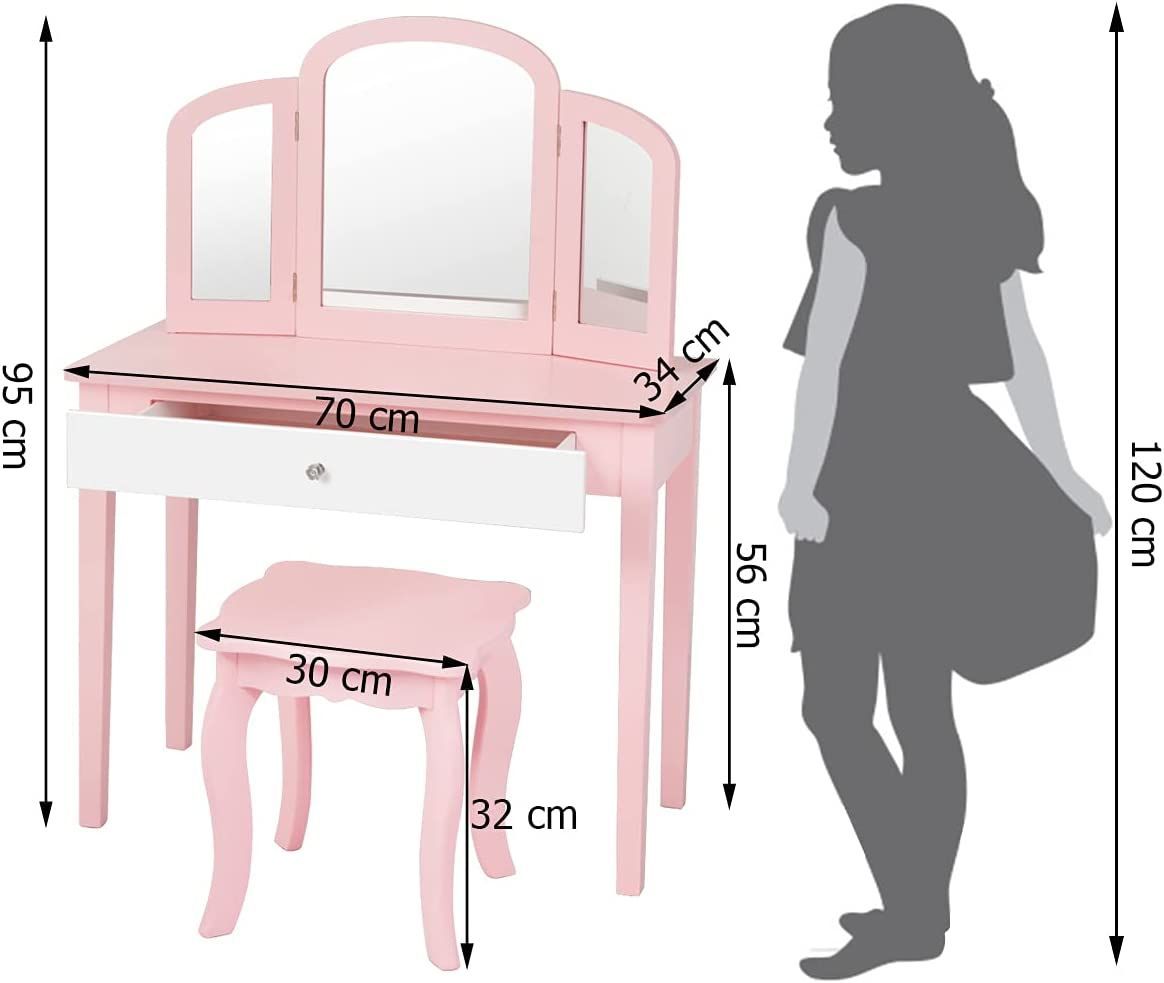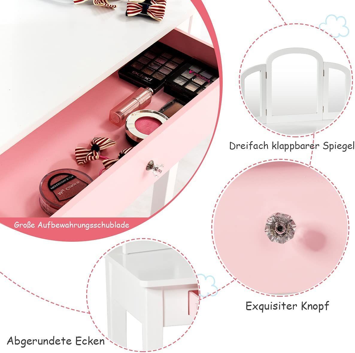 Kinder 2 in 1 Schminktisch Set Frisiertisch mit dreifach klappbarem Spiegel Schublade