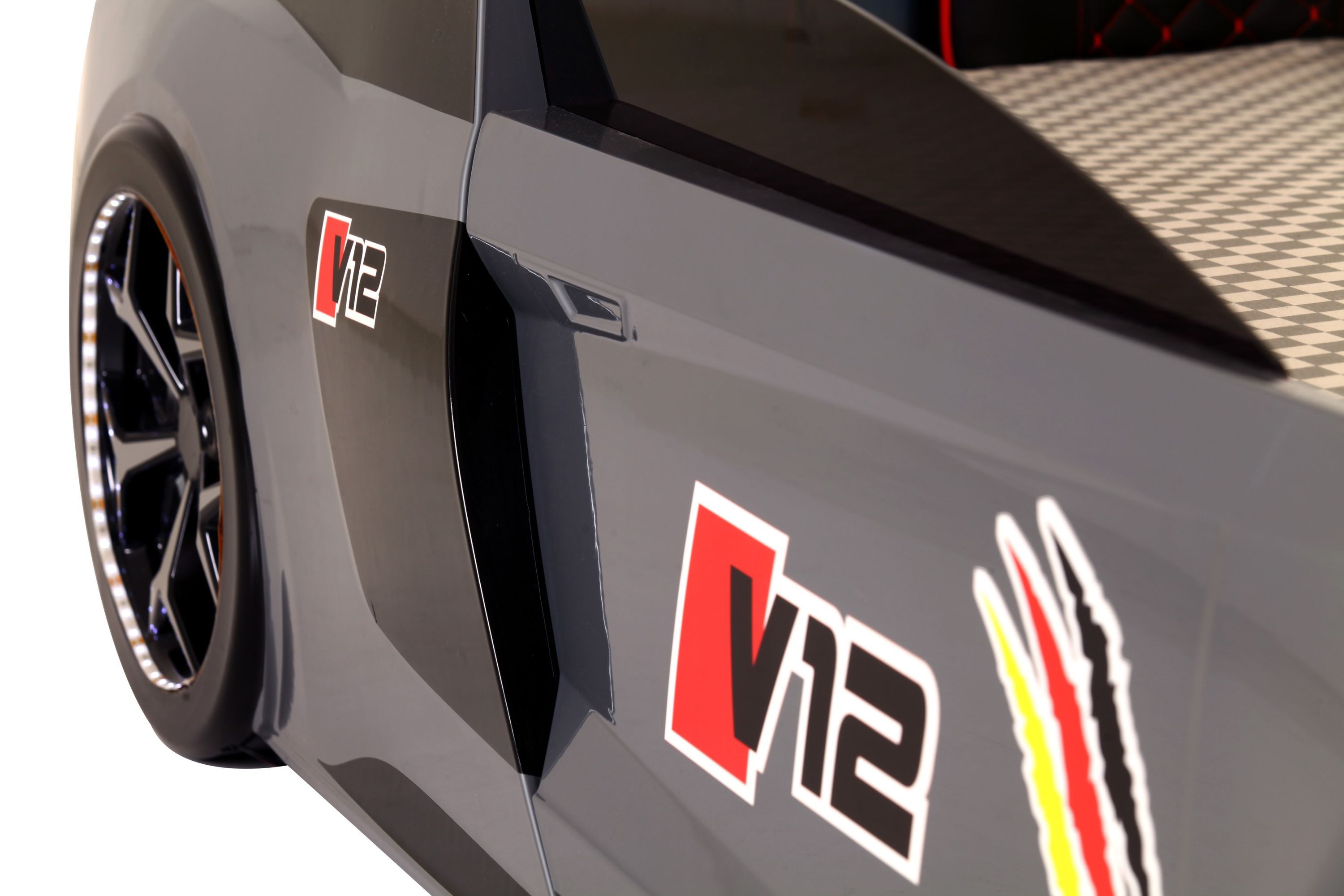 Autobett Kinderbett V12 Euro Luxus Sportwagenbett mit LED-Beleuchtung Das Kinderbett V12 Euroist der ultimative Traum fEuror kleine Rennfahrer! Mit seinem authentischen Sportwagen-Design , edlen Ledersitzen und modernster LED-Technik verwandelt dieses Bett jedes Kinderzimmer in eine aufregende Renns