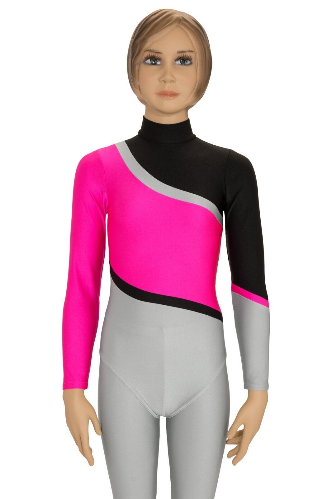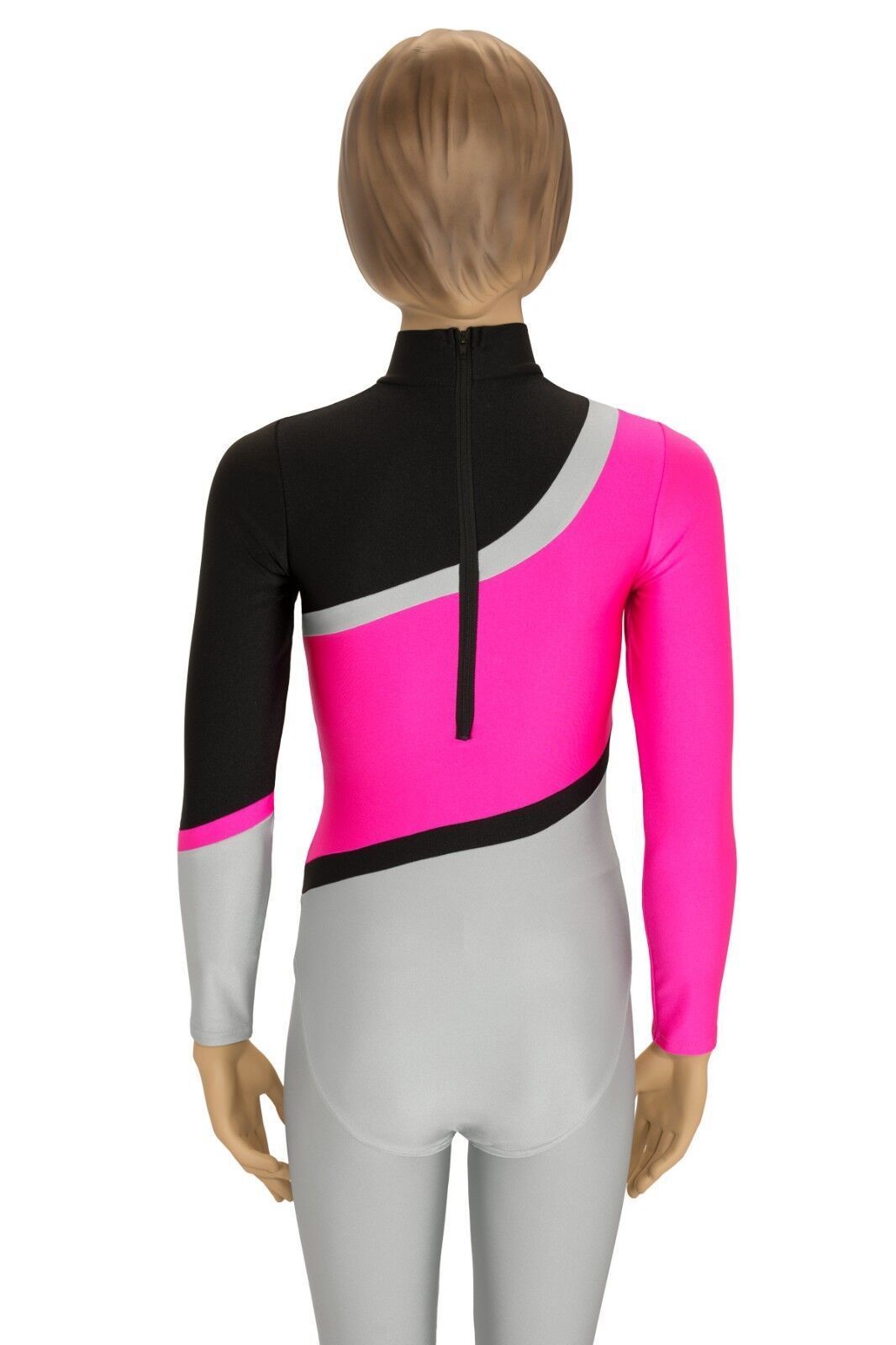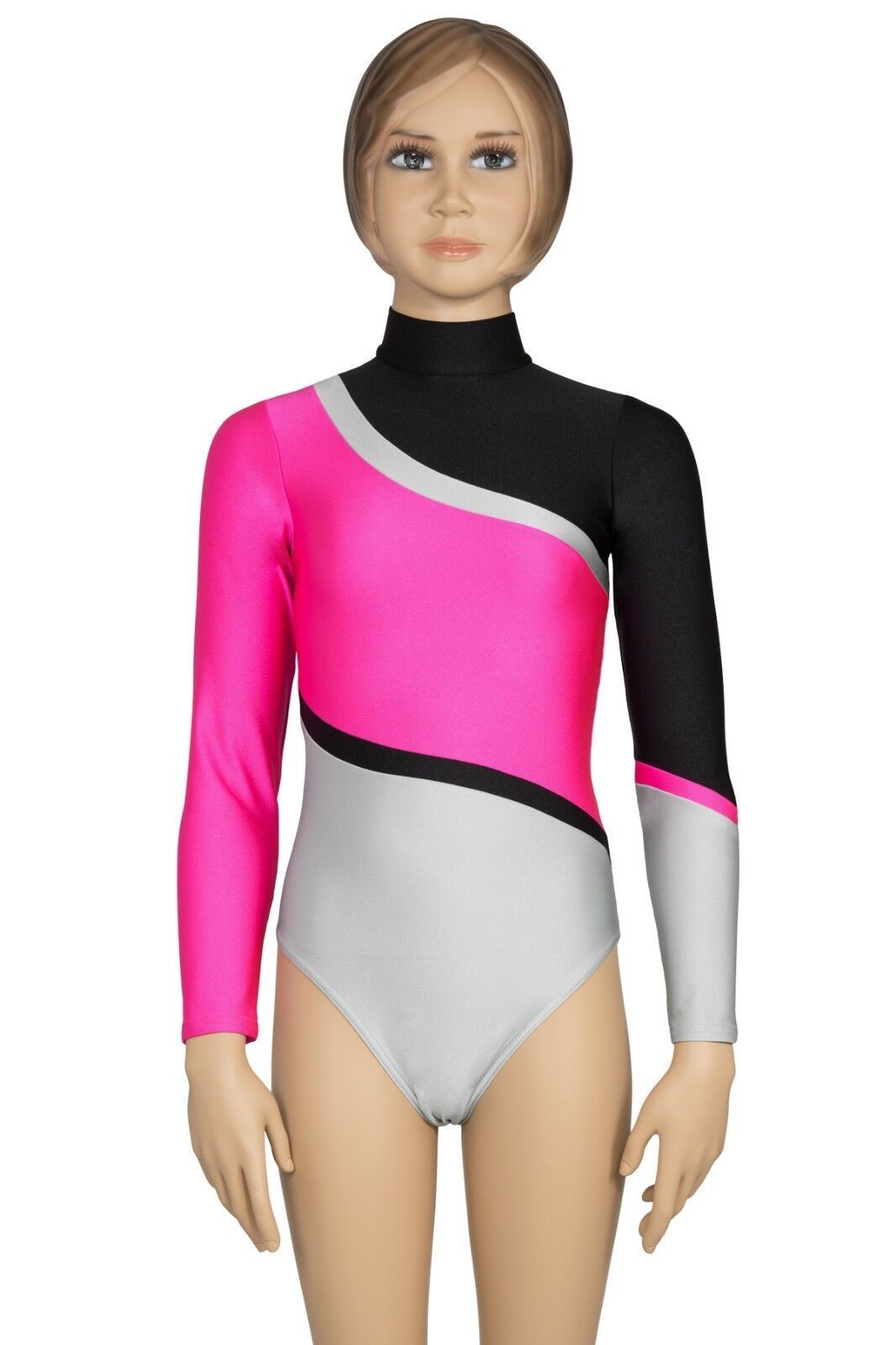 Kinder Gymnastikanzug lange Ärmel, mit Kragen und Rückenreißverschluss. Dreifarbiges Modell "Nina" Material: 80% Polyamid, 20% Elasthan. Hoch elastisch und glänzend. Made in Germany, by us – ML-Sport24!
