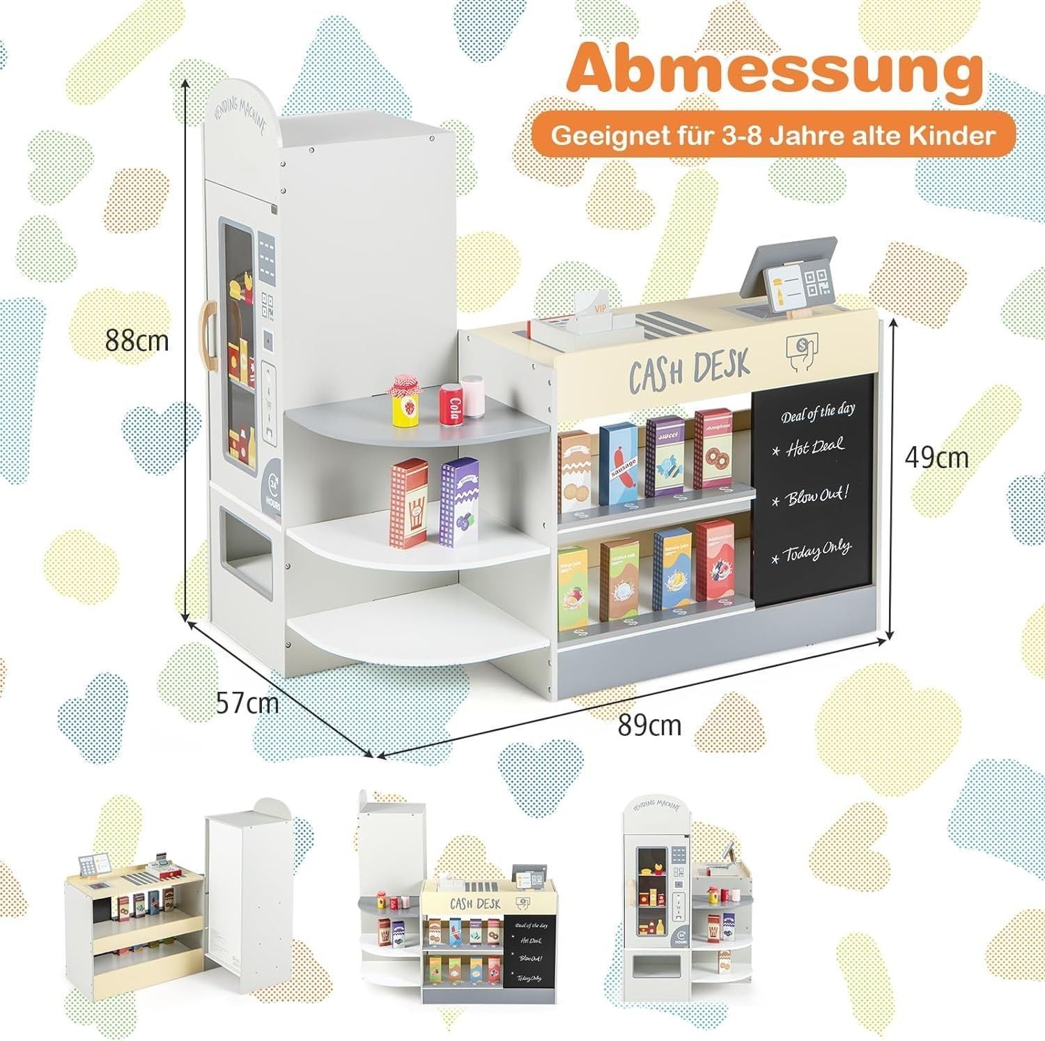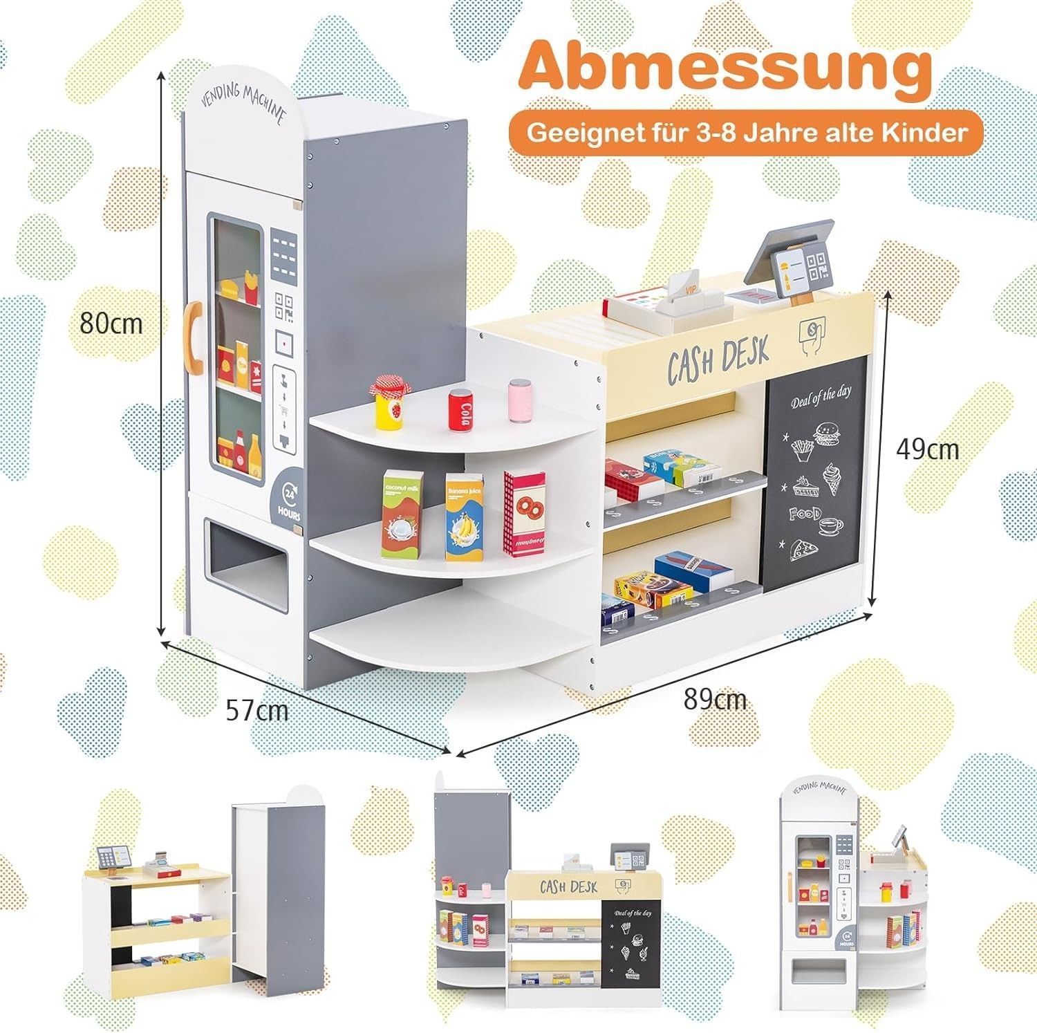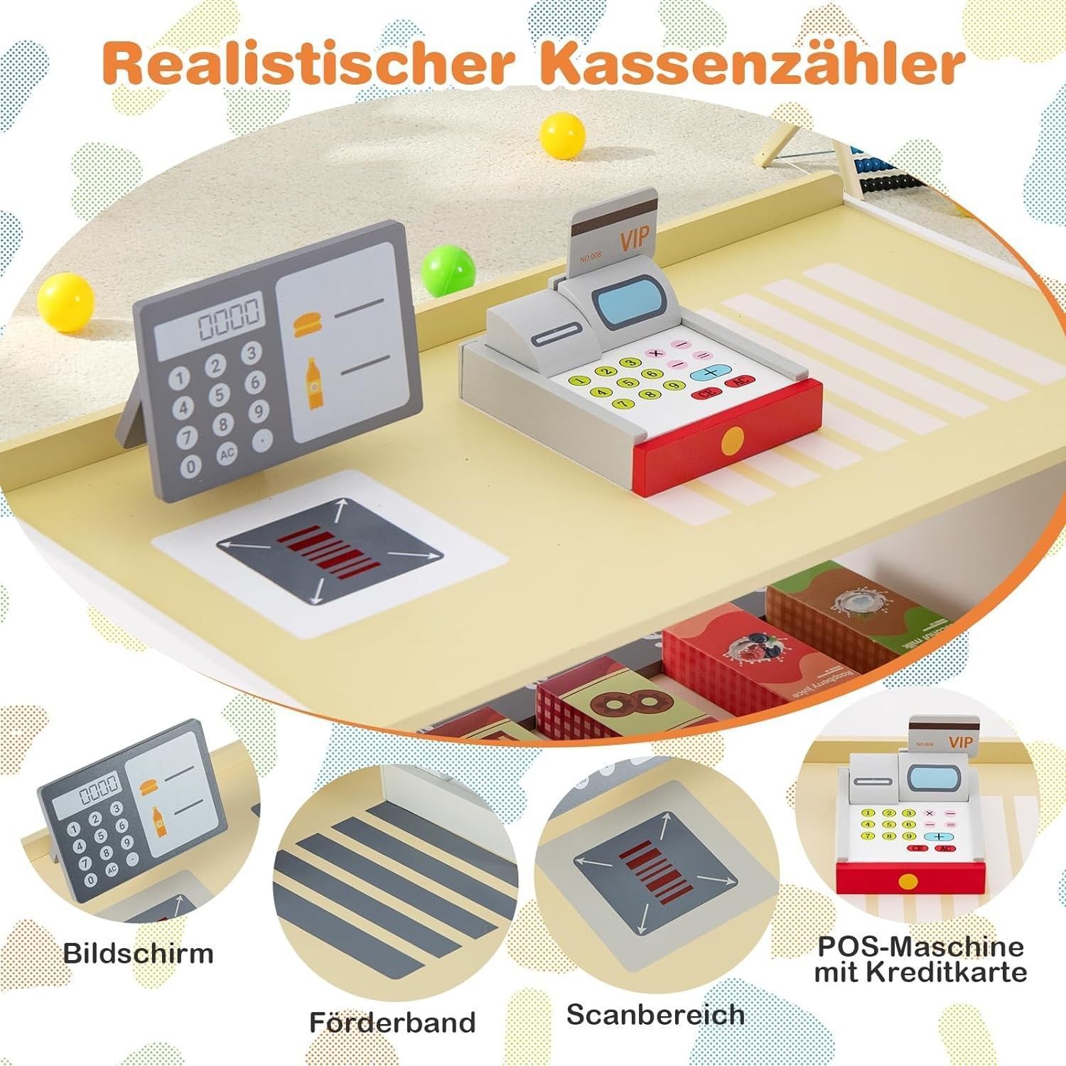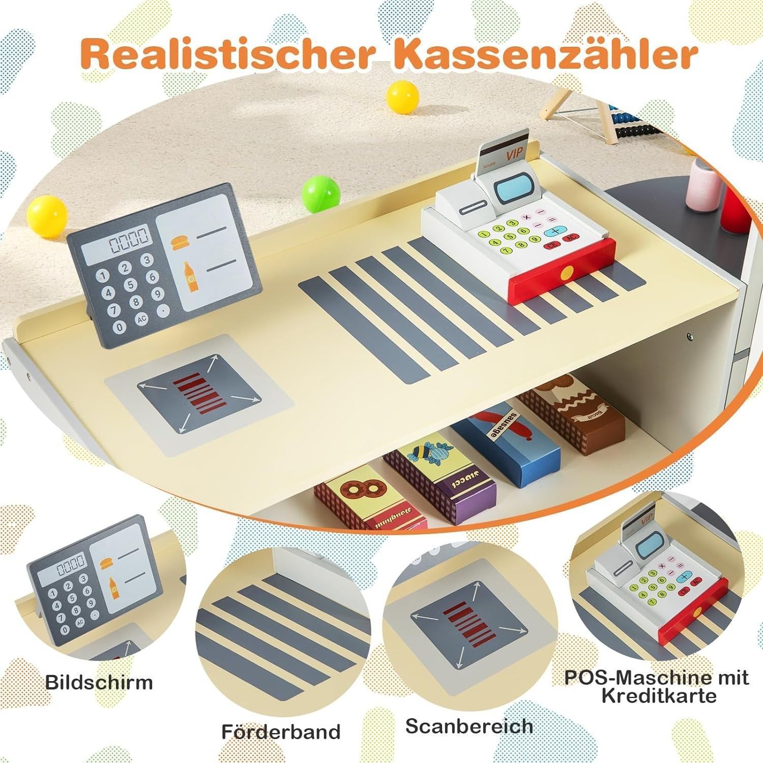 Kinder Kaufladen, Kaufmannsladen aus Holz mit Seitentheke, Supermarkt-Set mit Kasse