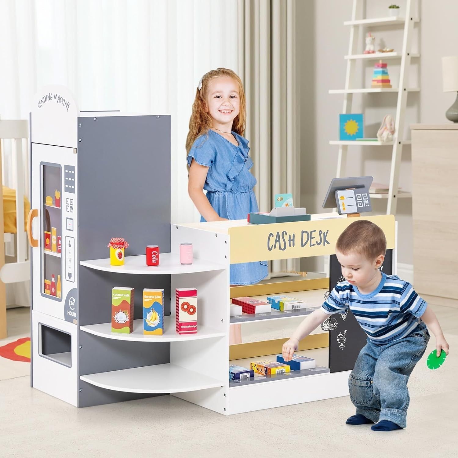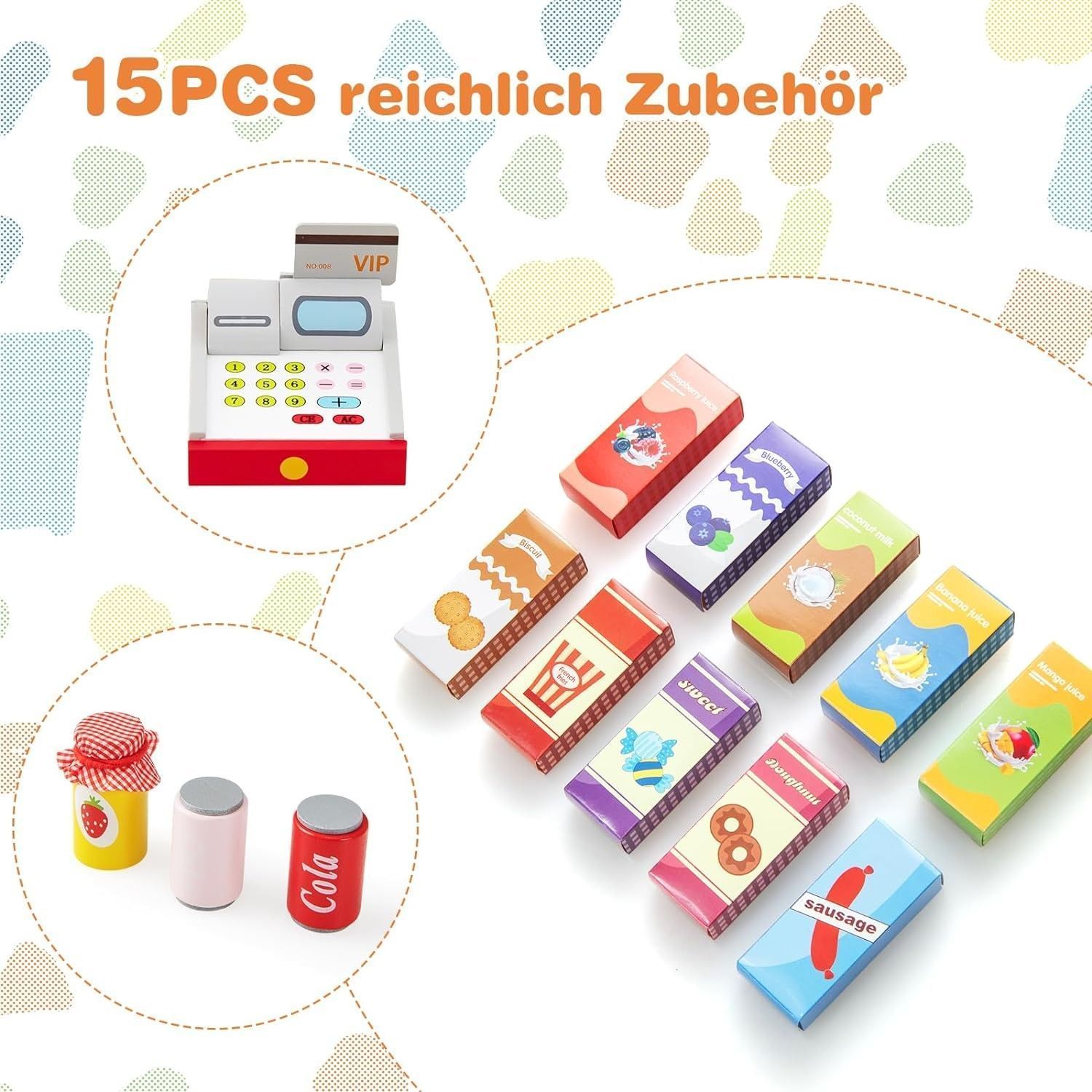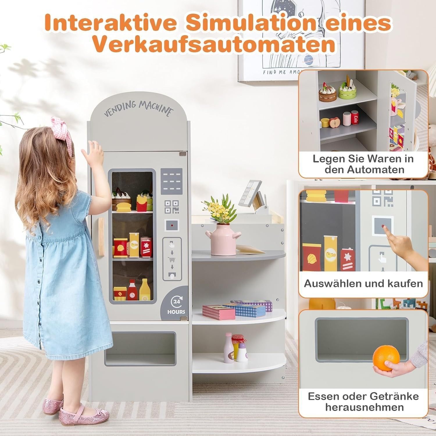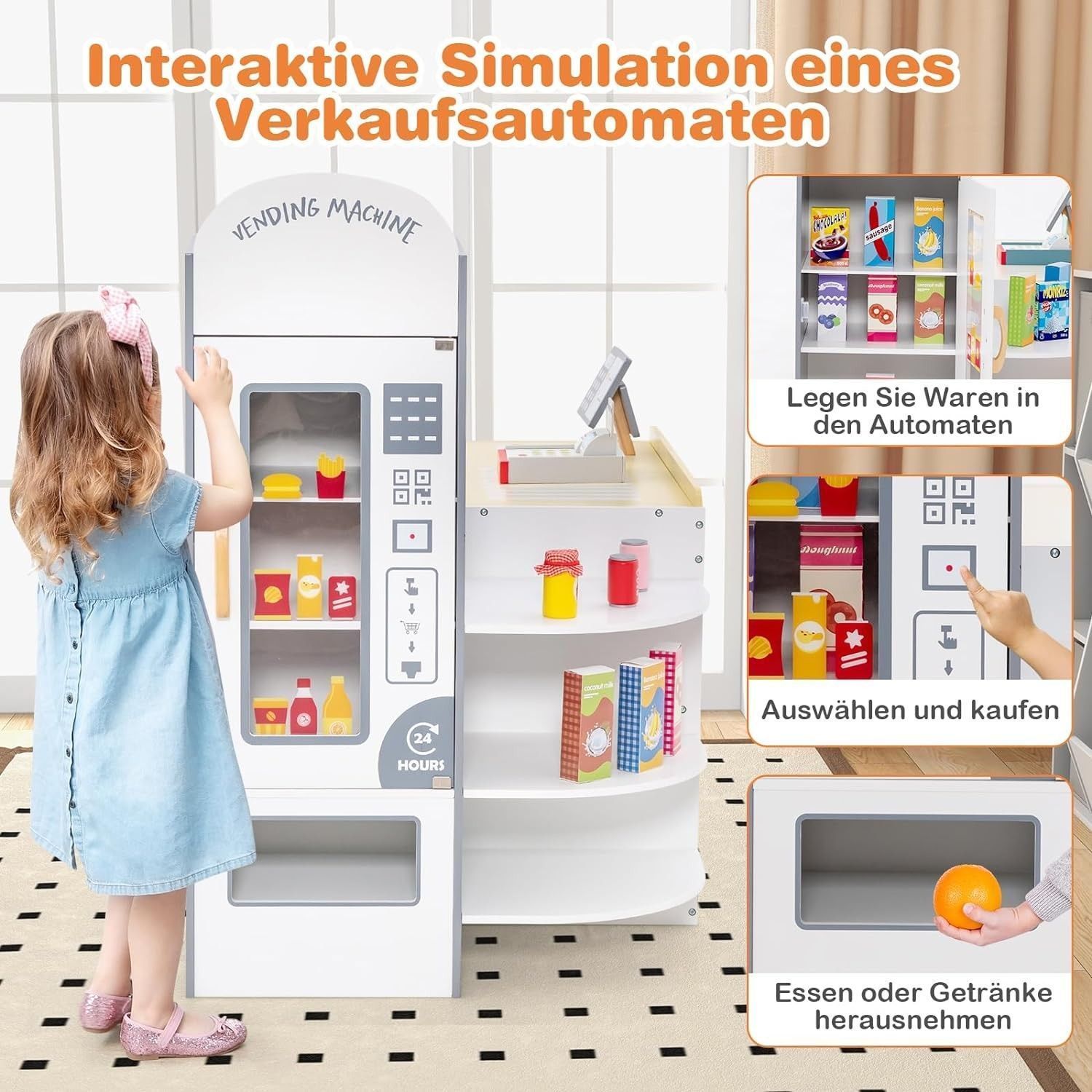Kinder Kaufladen, Kaufmannsladen aus Holz mit Seitentheke, Supermarkt-Set mit Kasse