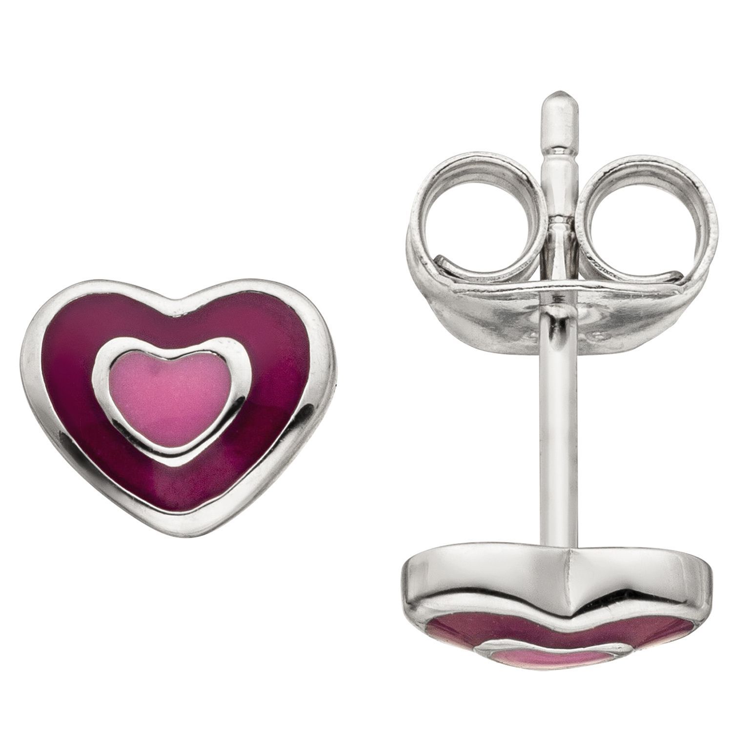 1 Paar Kinder-Ohrstecker 'Herz' aus 925 Sterlingsilber, rhodiniert, mit Emaille-Einlagen in den Farben Rosa und Pink, Höhe ca. 5,5 mm, Breite ca. 6,7 mm, Gewicht ca. 1,0 g * Der Artikel ist anlaufgeschützt (rhodiniert) * Bitte beachten Sie die Maße! Auf d
