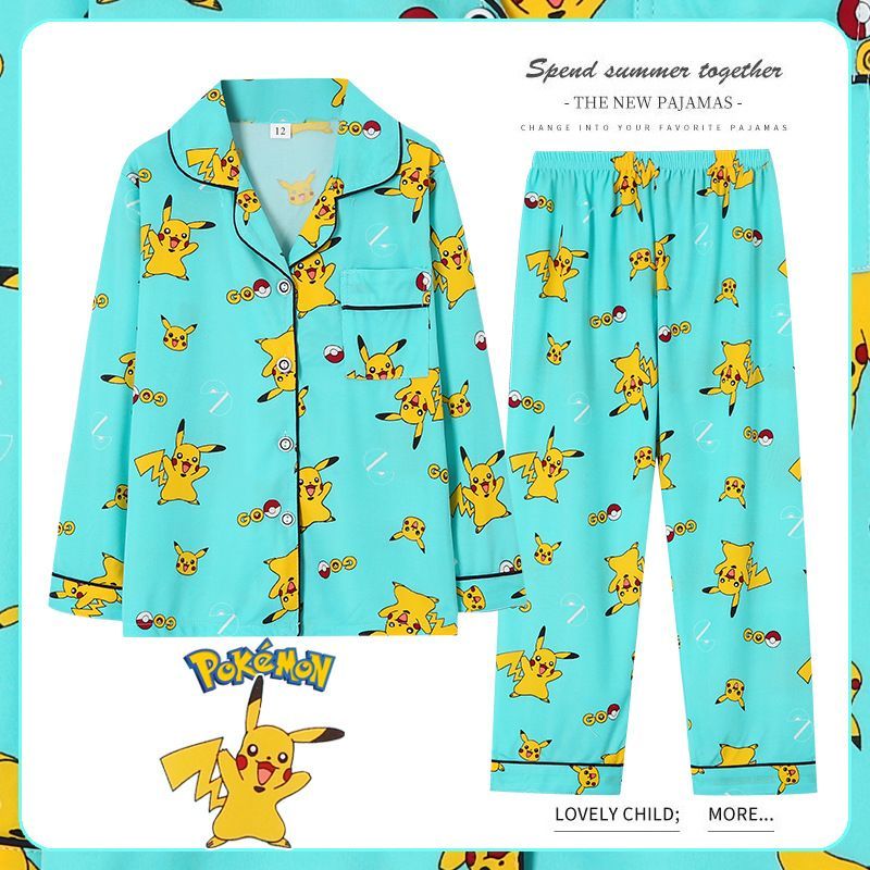 Kinder Schlafanzug Pikachu Revers Knopf Lang Pyjama 2er Set Loungewear Nachthemd
