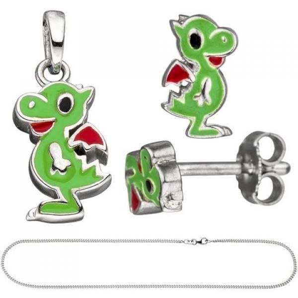 JOBO Kinder Schmuck-Set Kleiner Drache 925 Silber grün lackiert mit Kette 42 cm