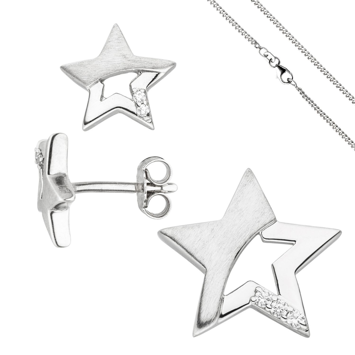 Schmuck-Set, bestehend aus: Anhänger 'Stern' aus 925 Sterlingsilber, rhodiniert und teilmattiert, mit 3 Zirkonia, Höhe ca. 15 mm, Breite ca. 15,7 mm, Tiefe ca. 2,4 mm, Innenmaße der Öse ca. 4,3 mm x 2,7 mm, Gewicht ca. 1,2 g * 1 Paar Ohrstecker 'Stern' au