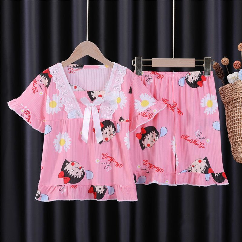 Kinder Spitzenkragen Schlafanzug Chibi Maruko-chan Kurzarm Pyjama 2er Set Loungewear