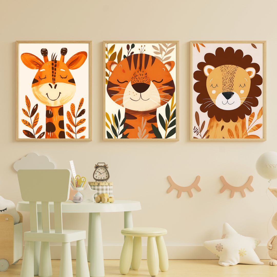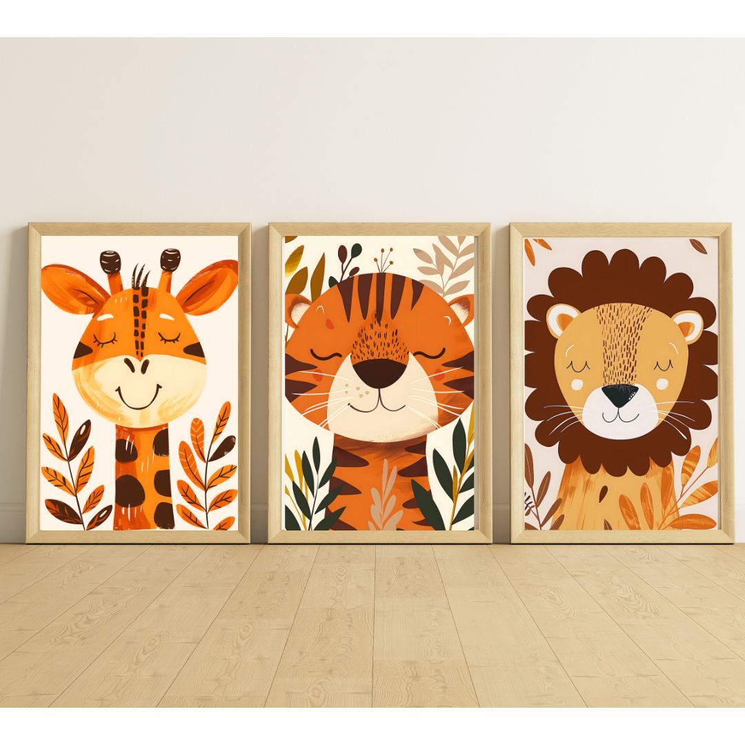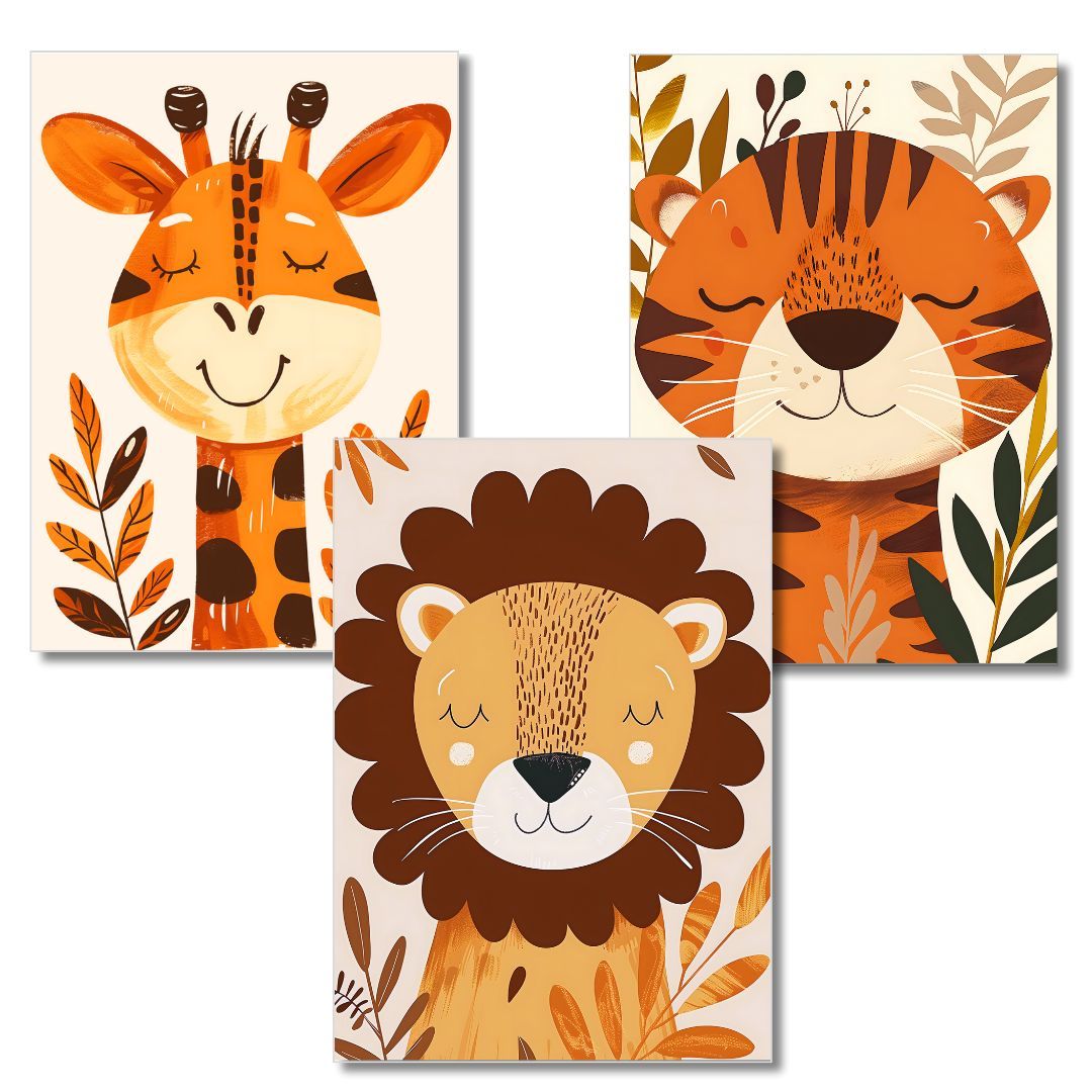 Kinder Wandbilder 3er Set Poster DIN A4 für Kinder Babyzimmer Deko Wildtiere