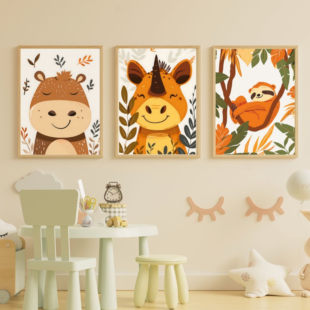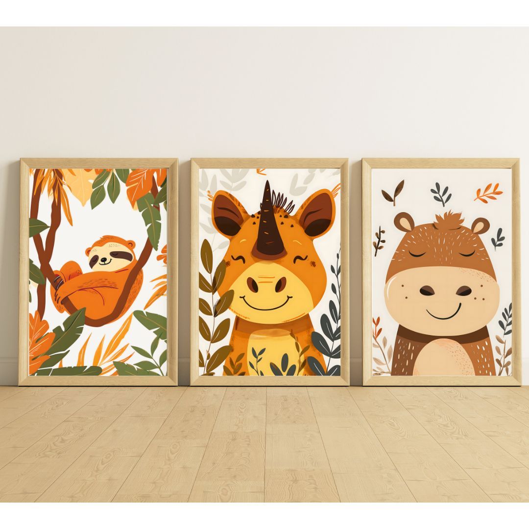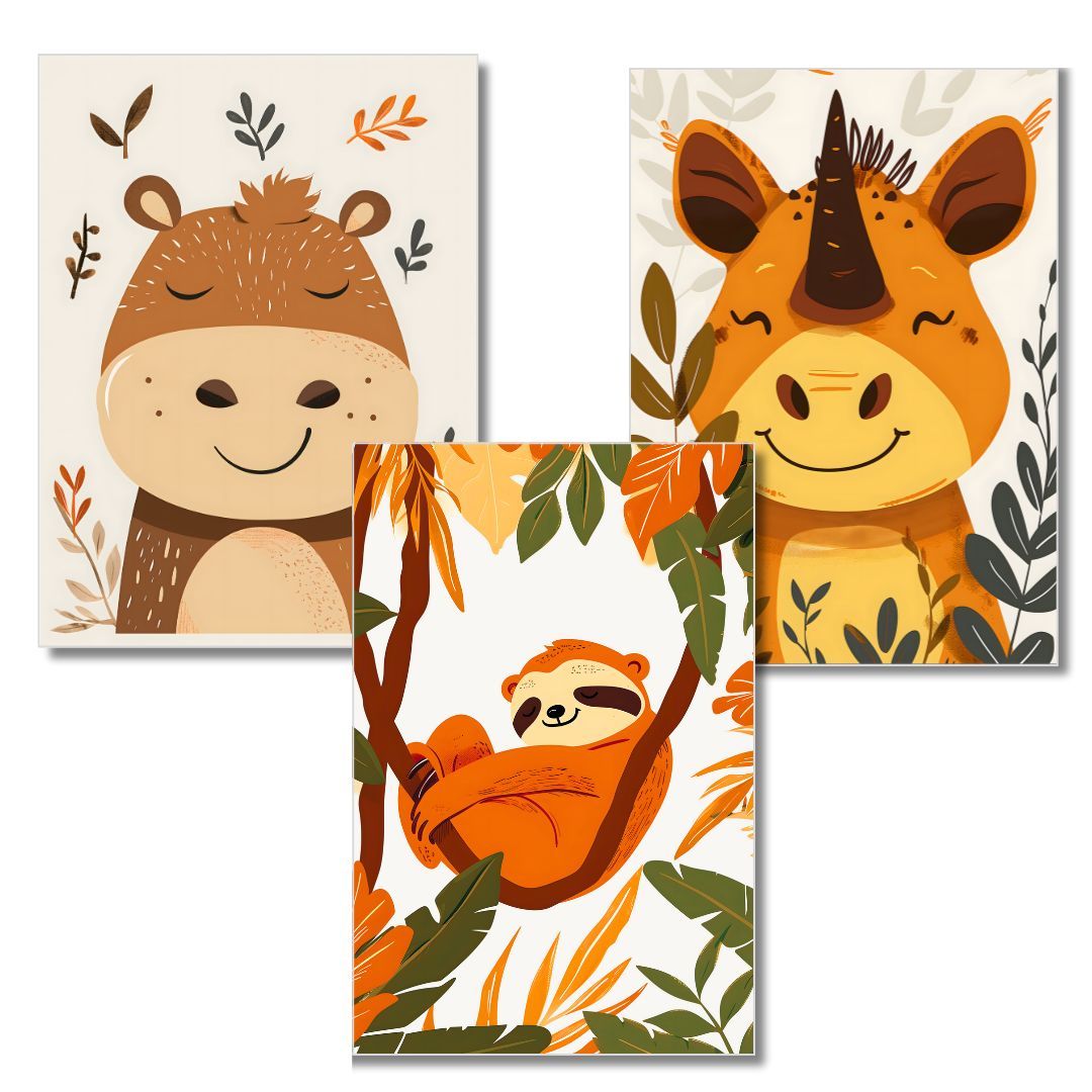 Kinder Wandbilder 3er Set Poster DIN A4 für Kinder Babyzimmer Deko Wildtiere 2