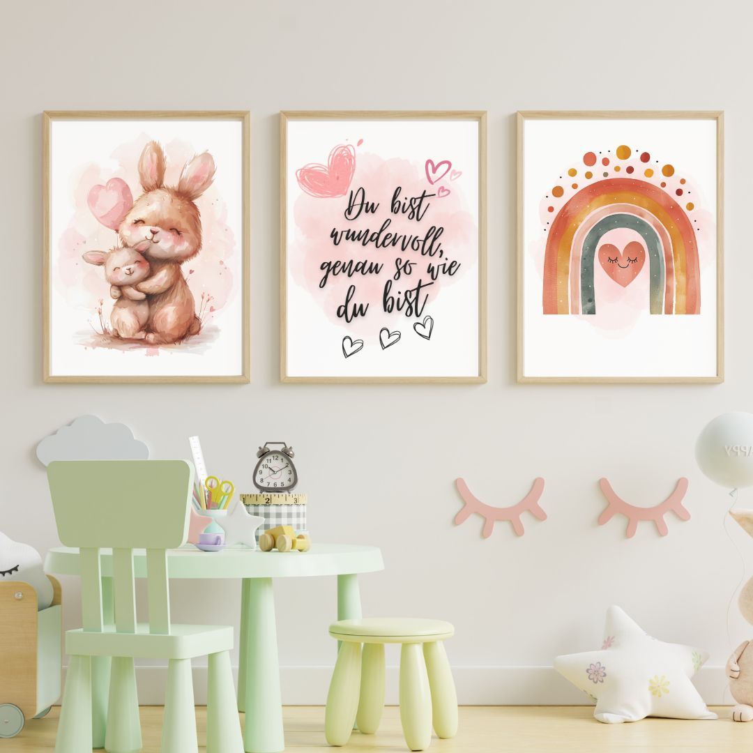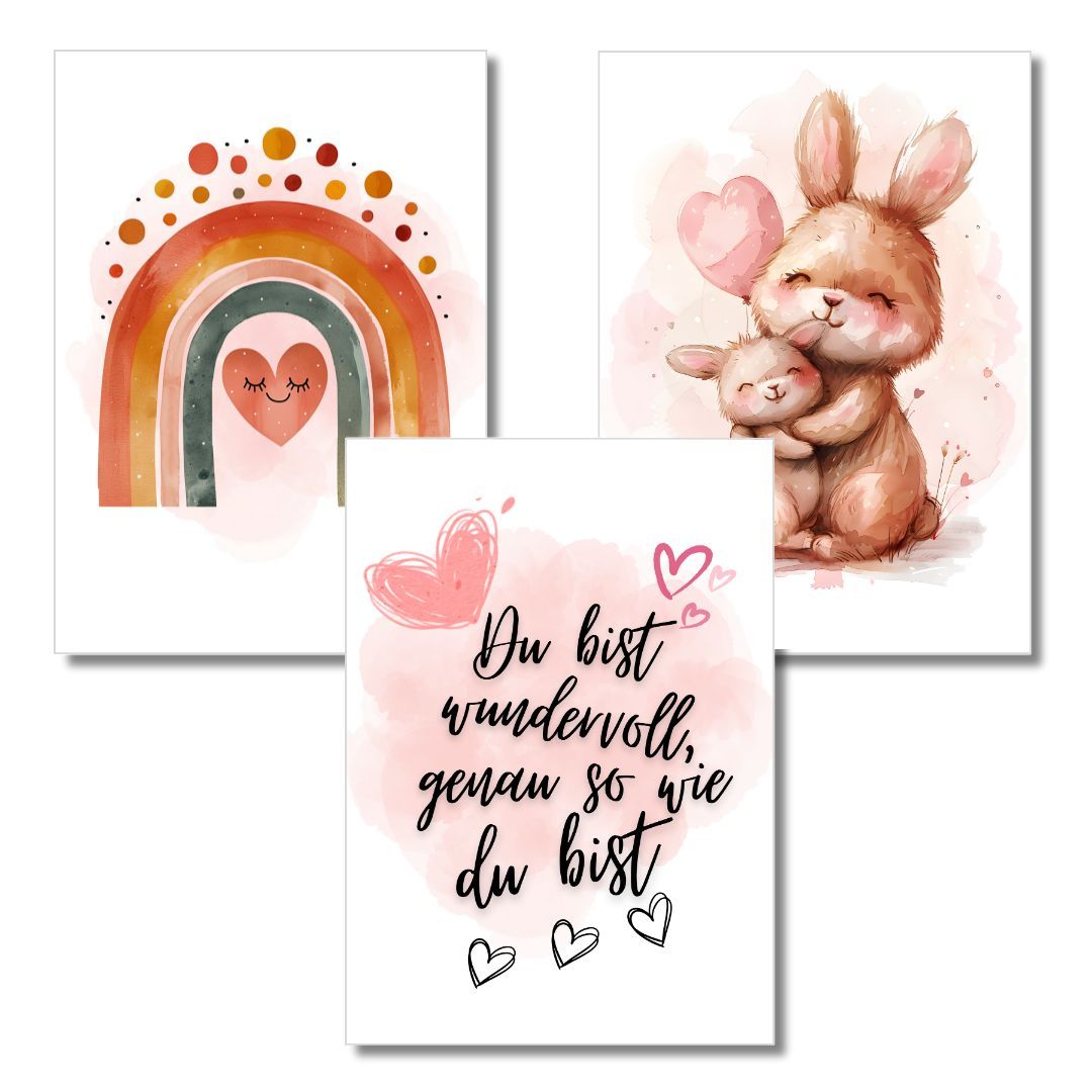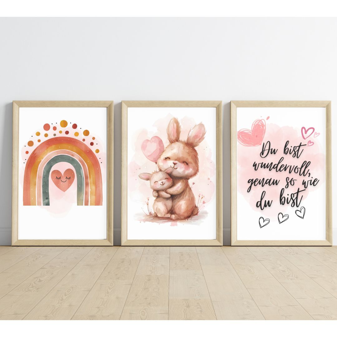 Kinder Wandbilder 3er Set Poster DIN A4 für Kinderzimmer Babyzimmer Deko Hase