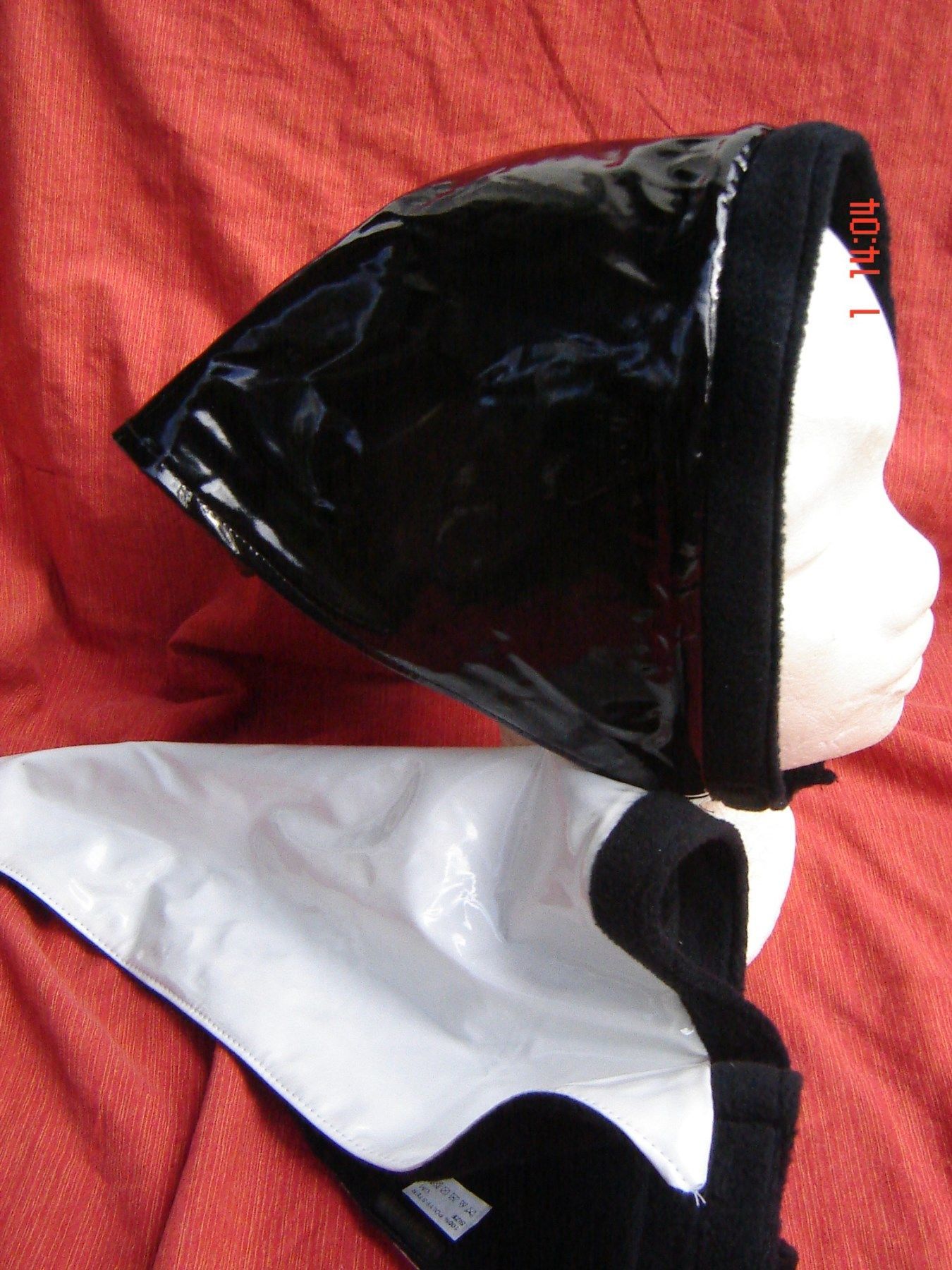 . ausgefallenes Winter Kopftuch für Kinder innen aus ganz weichem Fleece und aussen Kunstleder in Lackoptik alles aus 100 Polyester mit Klettverschluß ca 9 cm breit unterm Kinn wenn man den Klettverschluß schließt sind es ca 52 cm , um das Gesicht herum gemessen wobei Spielraum ist , weil der Klettv