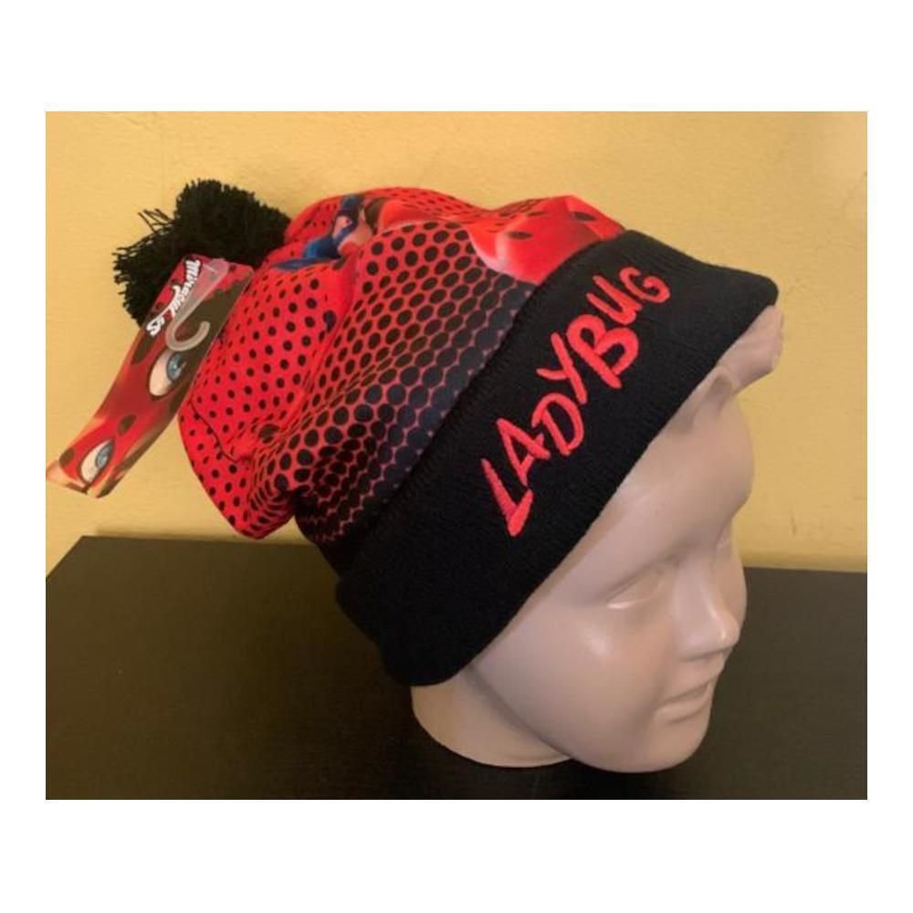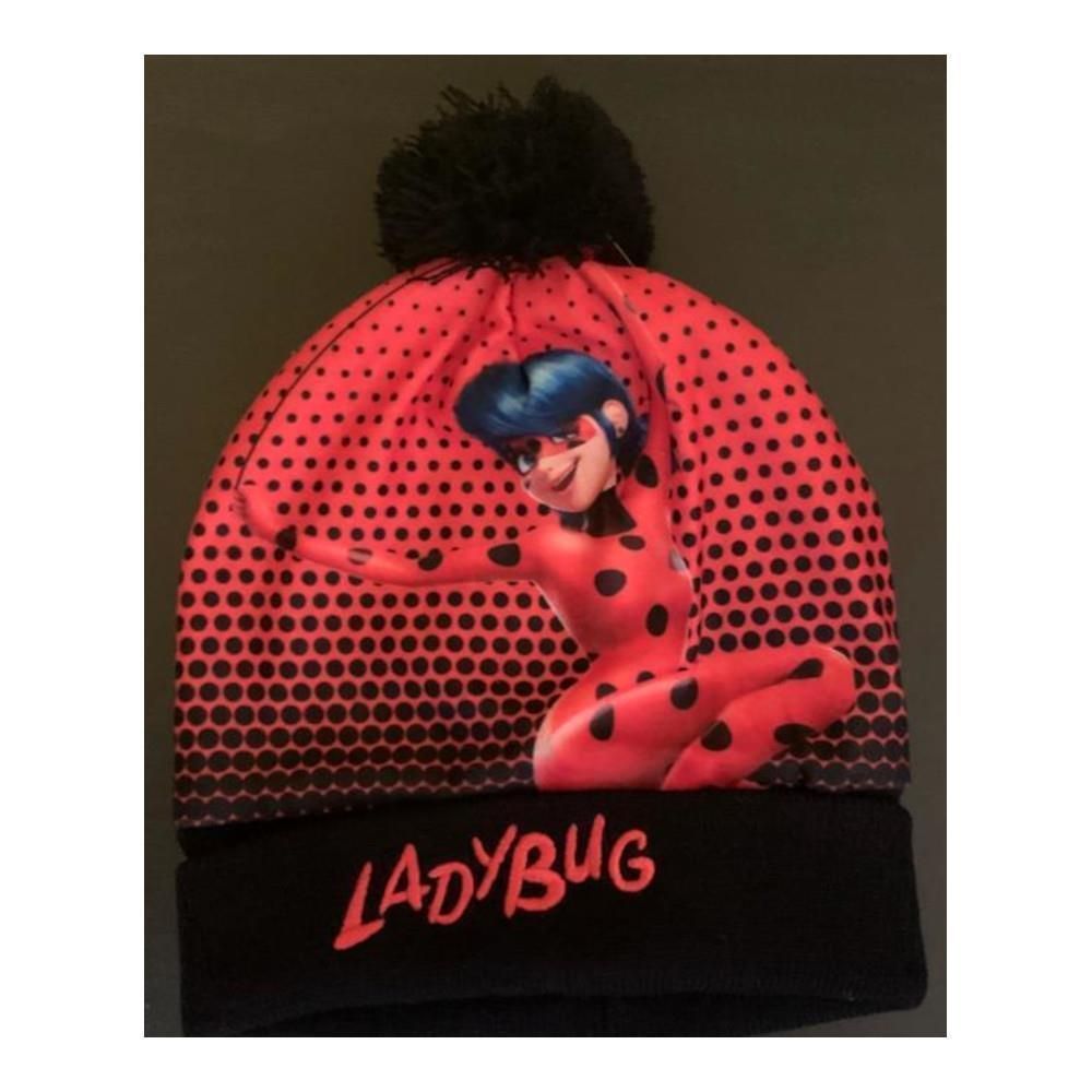 Kinder-Wintermütze mit Bommel, Ladybug Motiv, Rot/Schwarz, Gr. 52/54, außen Polyes