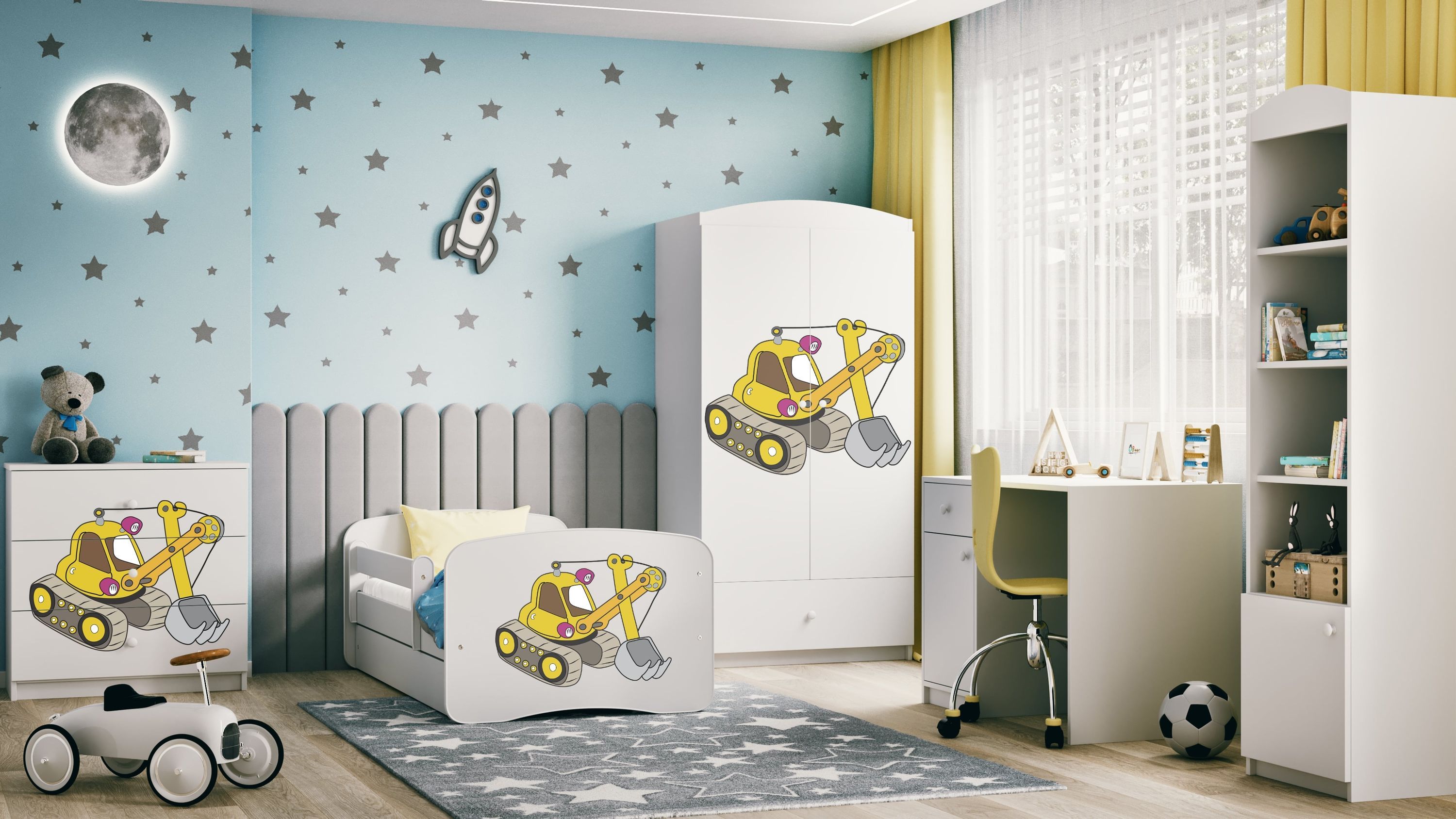 Kinderbett Bagger mit Schublade und Matratze Weiß Jugendbett 160/80