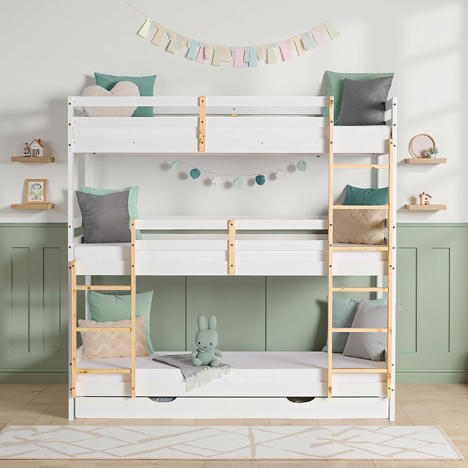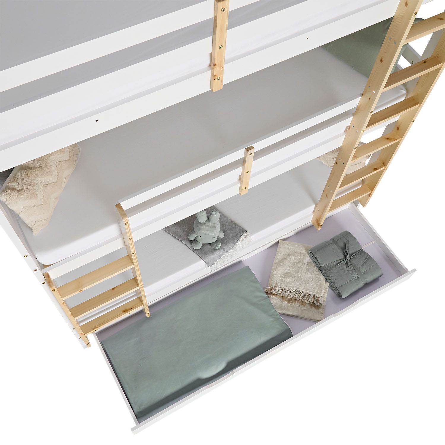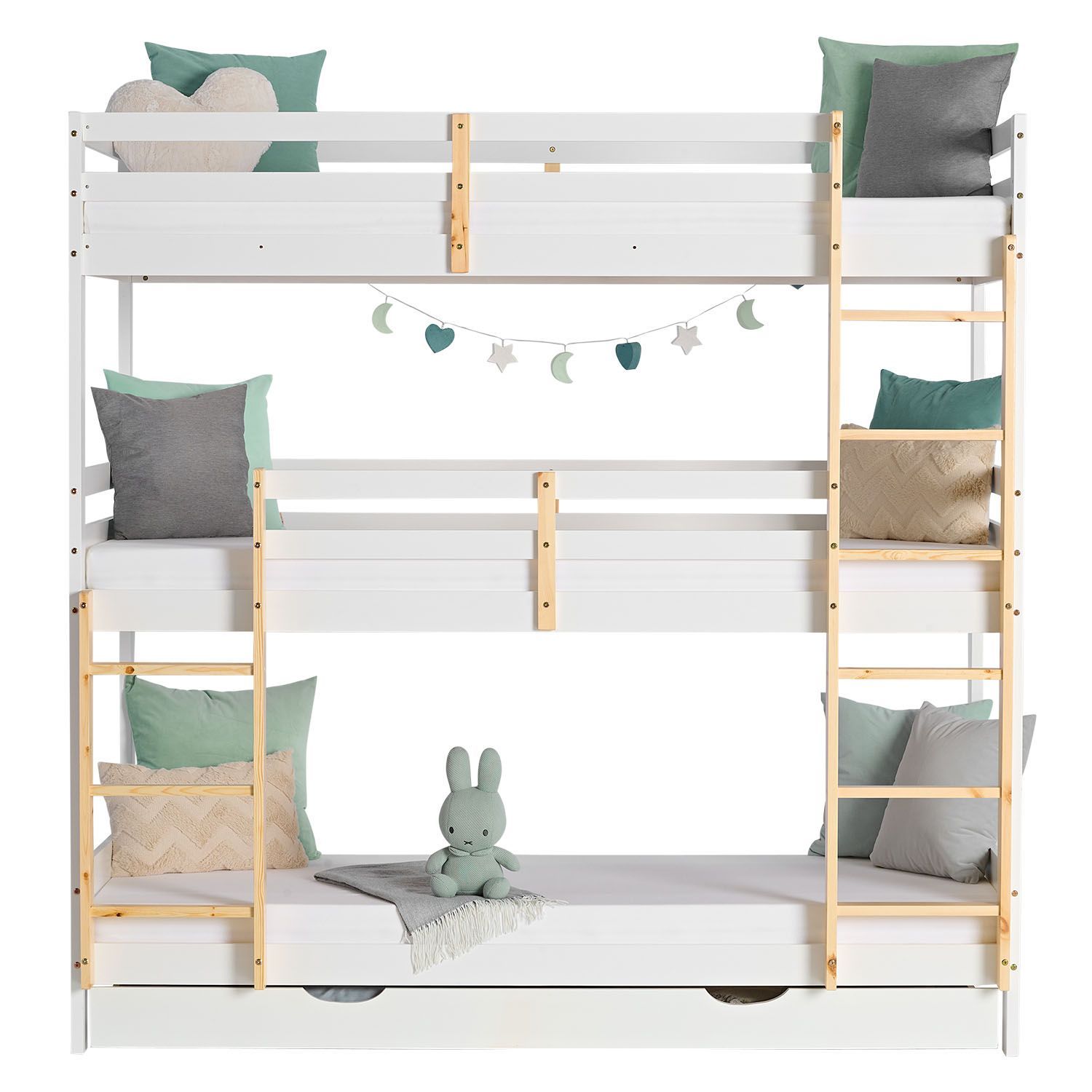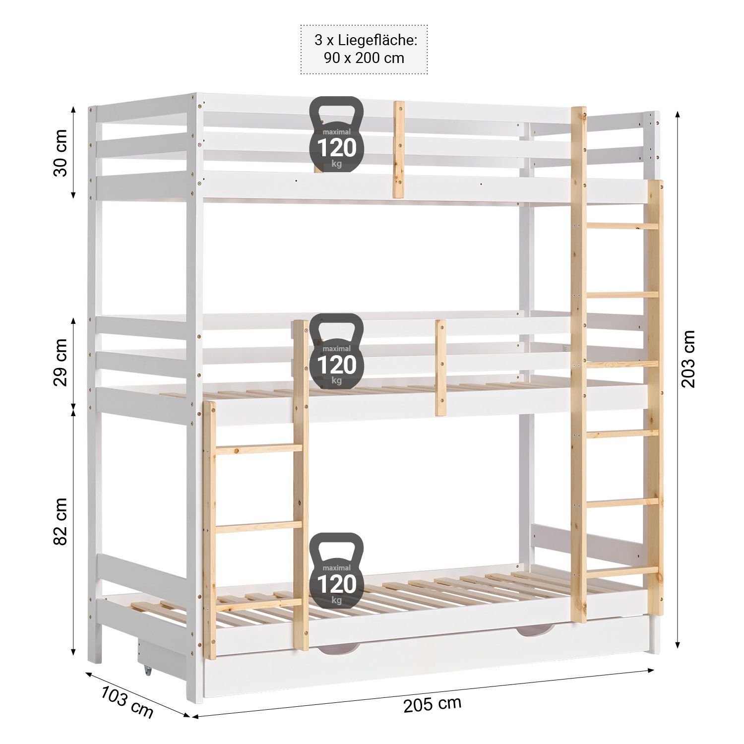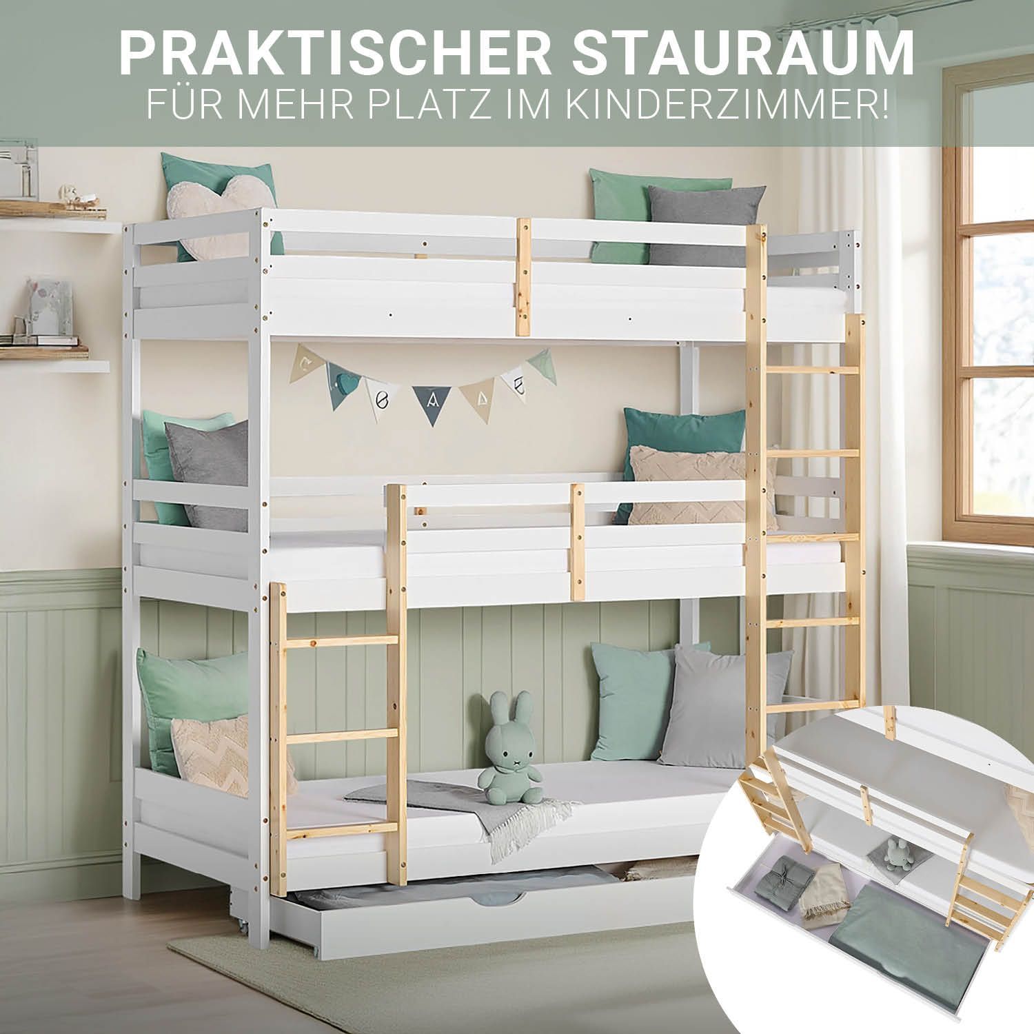 Kinderbett Etagenbett 90x200 cm Dreifachbett Hochbett mit Bettkasten Weiß Holz