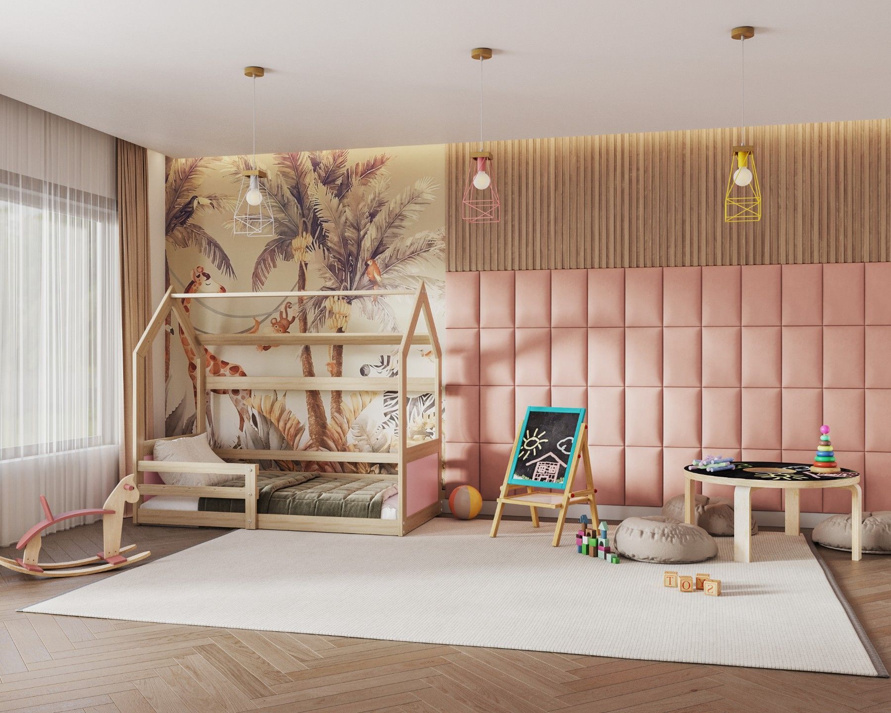 Kieferholz/ Weiß, Grau/ Weiß, Kieferholz/ Rosa und Weiß