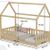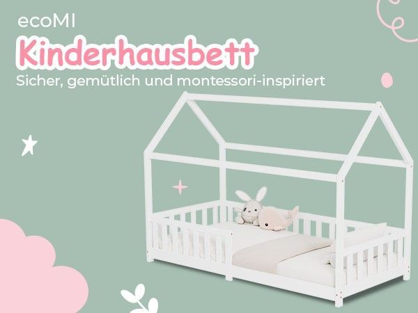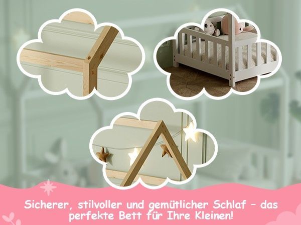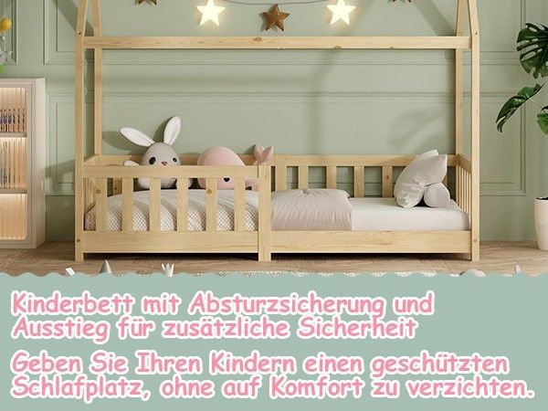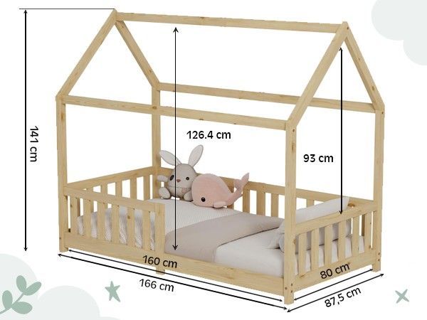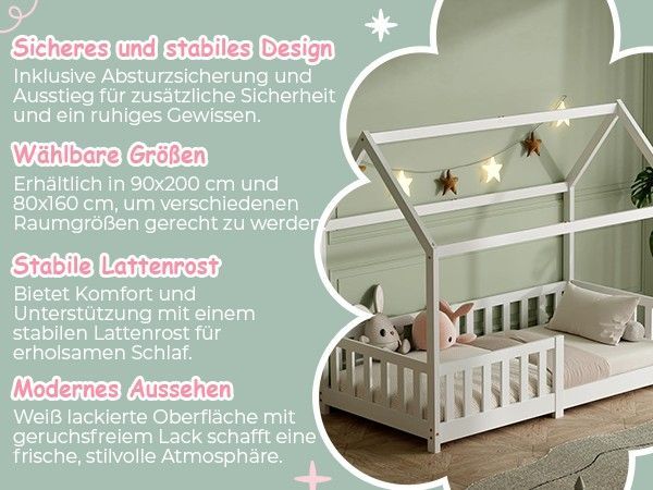Kinderbett mit Rausfallschutz & Lattenrost Hausbett| 80x160 cm, 90x200 | Natur, Weiß