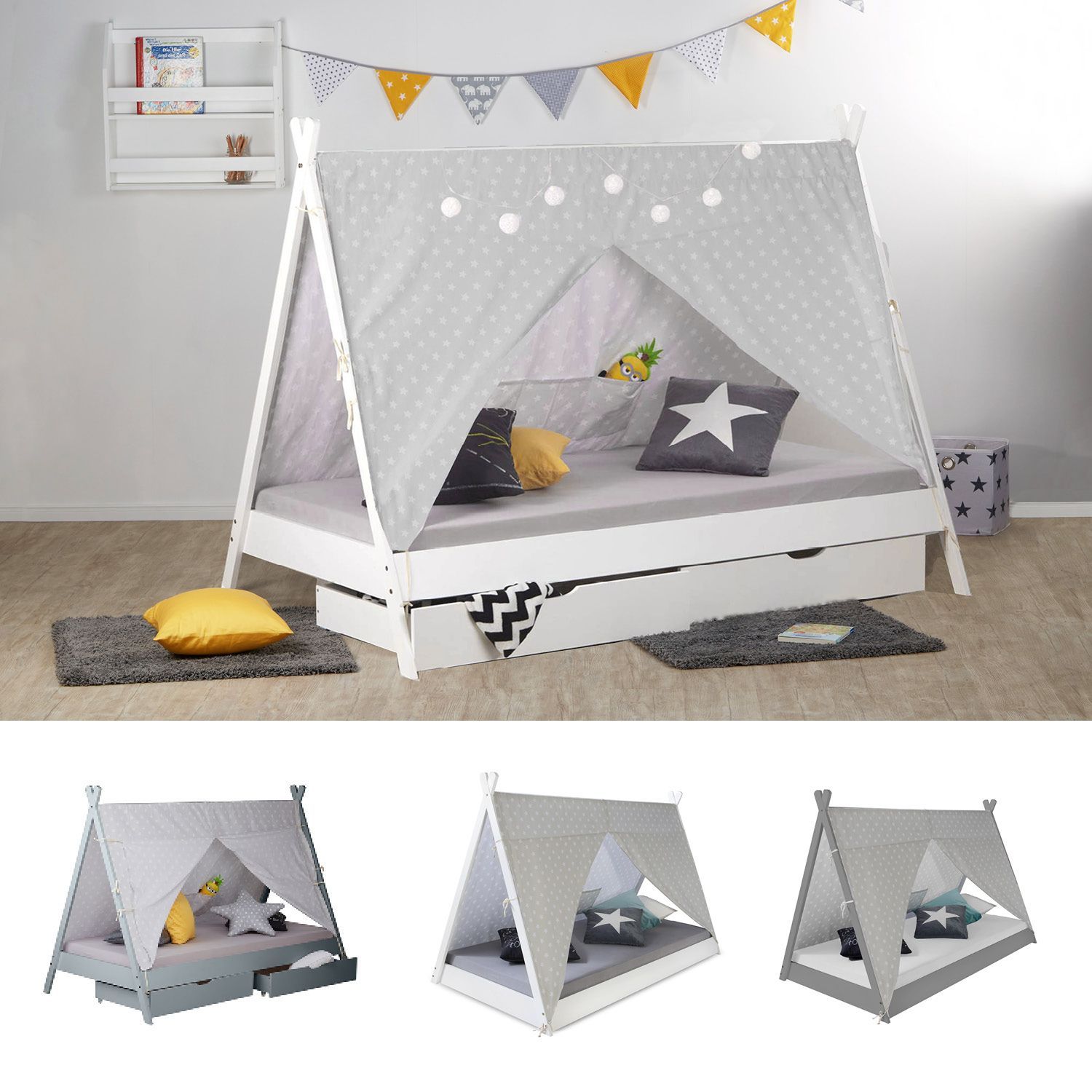 Kinderbett TIPI 90x200 weiß grau Holzbett wahlweise Bettkasten Indianer Bett Hausb