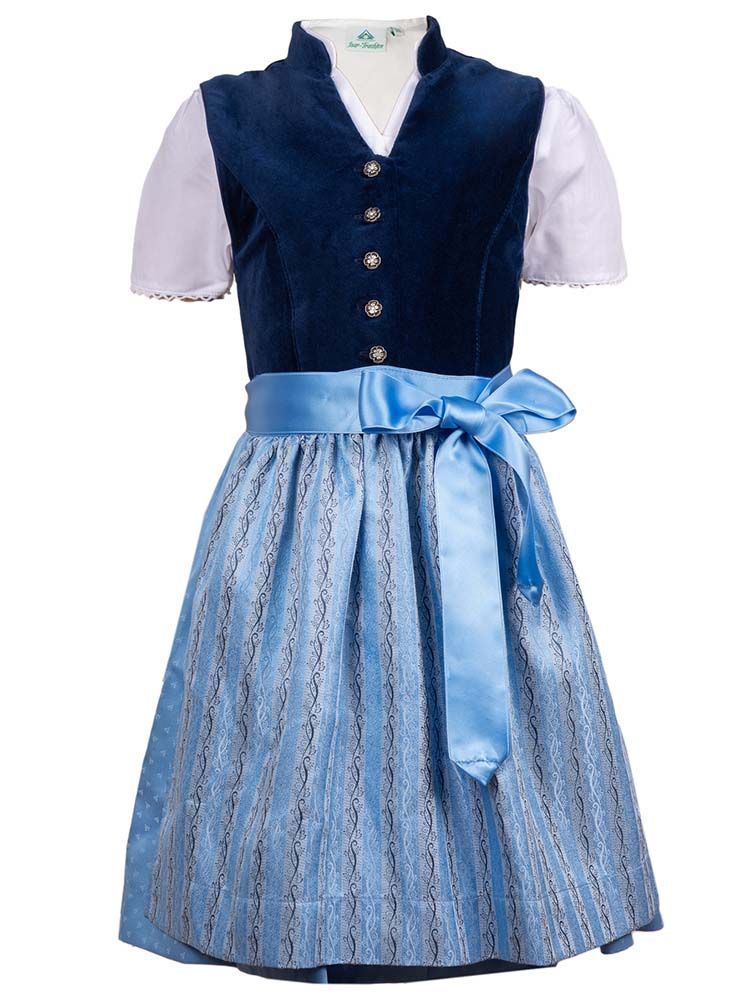 Kinderdirndl Ella blau Das süße Kinderdirndl-Set von Isar-Trachten überzeugt mit dem schönen dunkelblauen Mieder aus Samt und einer Dirndlschürze aus hellblauem Jacquardstoff. Das Dirndl wird durch Knöpfe in der vorderen Mitte geschlossen. Egal ob zu Hochzeiten oder anderen Familienfeiern; mit diesem Dirndl stehen die Kleinen im Mittelpunkt.