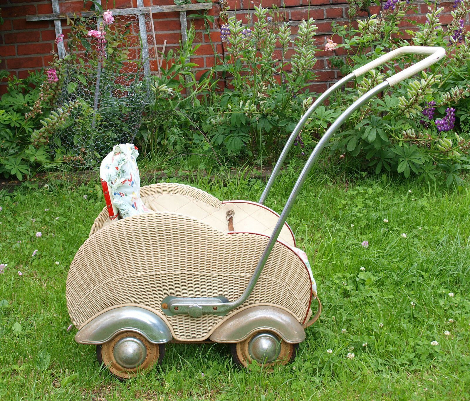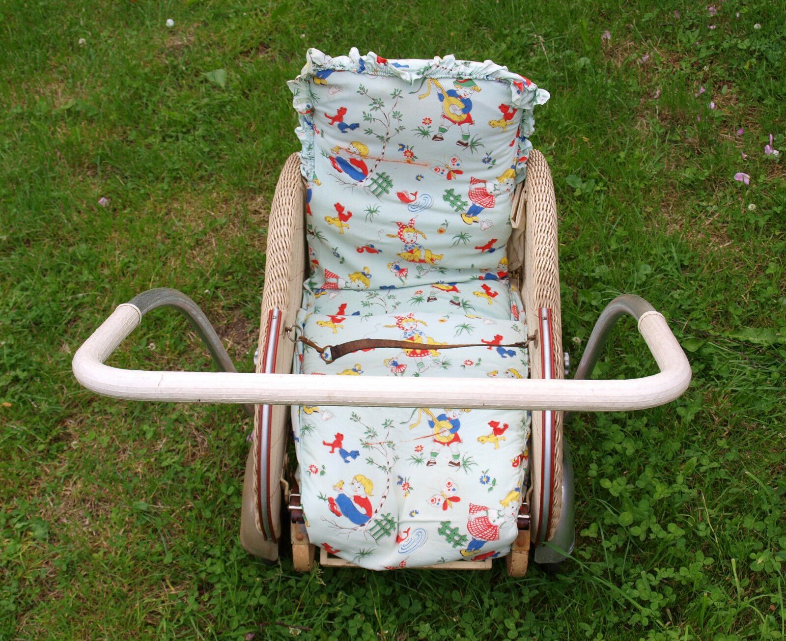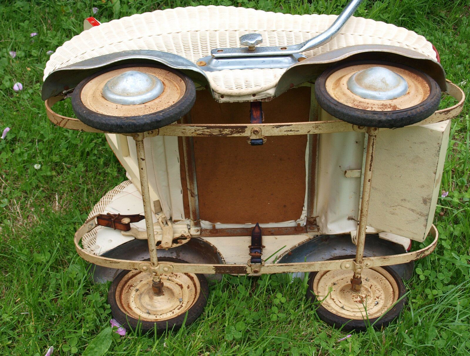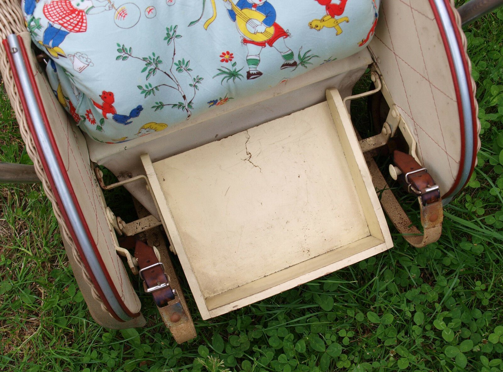 Kinderkarre Sportkarre um 1955. Material: Korbgeflecht. Mit verstellbarem Rücken- und Fußteil. Umstellbarer Griff: Damit kann das Baby wahlweise nach vorn oder hinten schauen. Eisenfedern mit Lederaufhängung, lederner Sicherheitsgurt, Alle Chromteile sind leicht oxydiert, können aber wieder blank ge