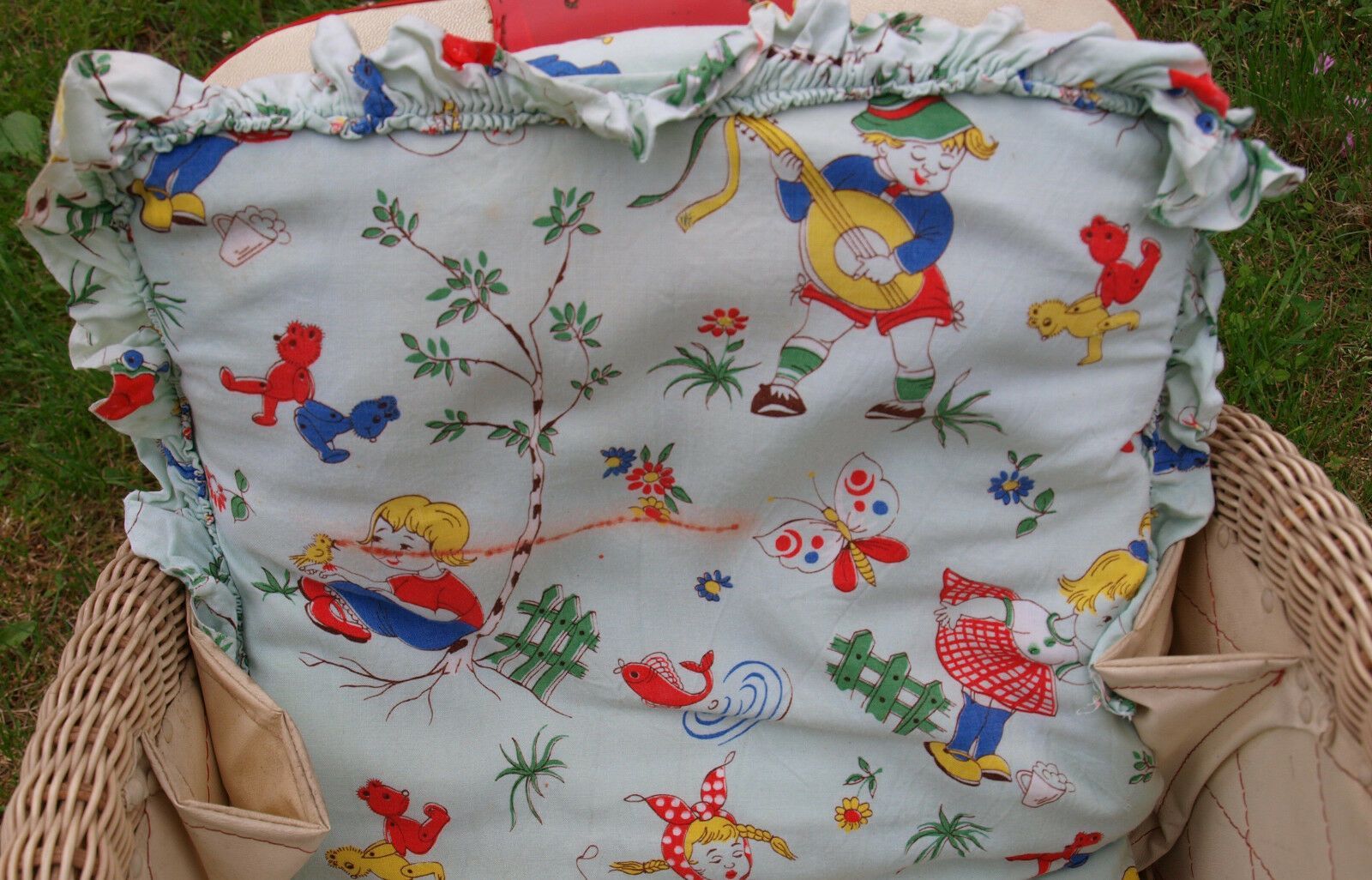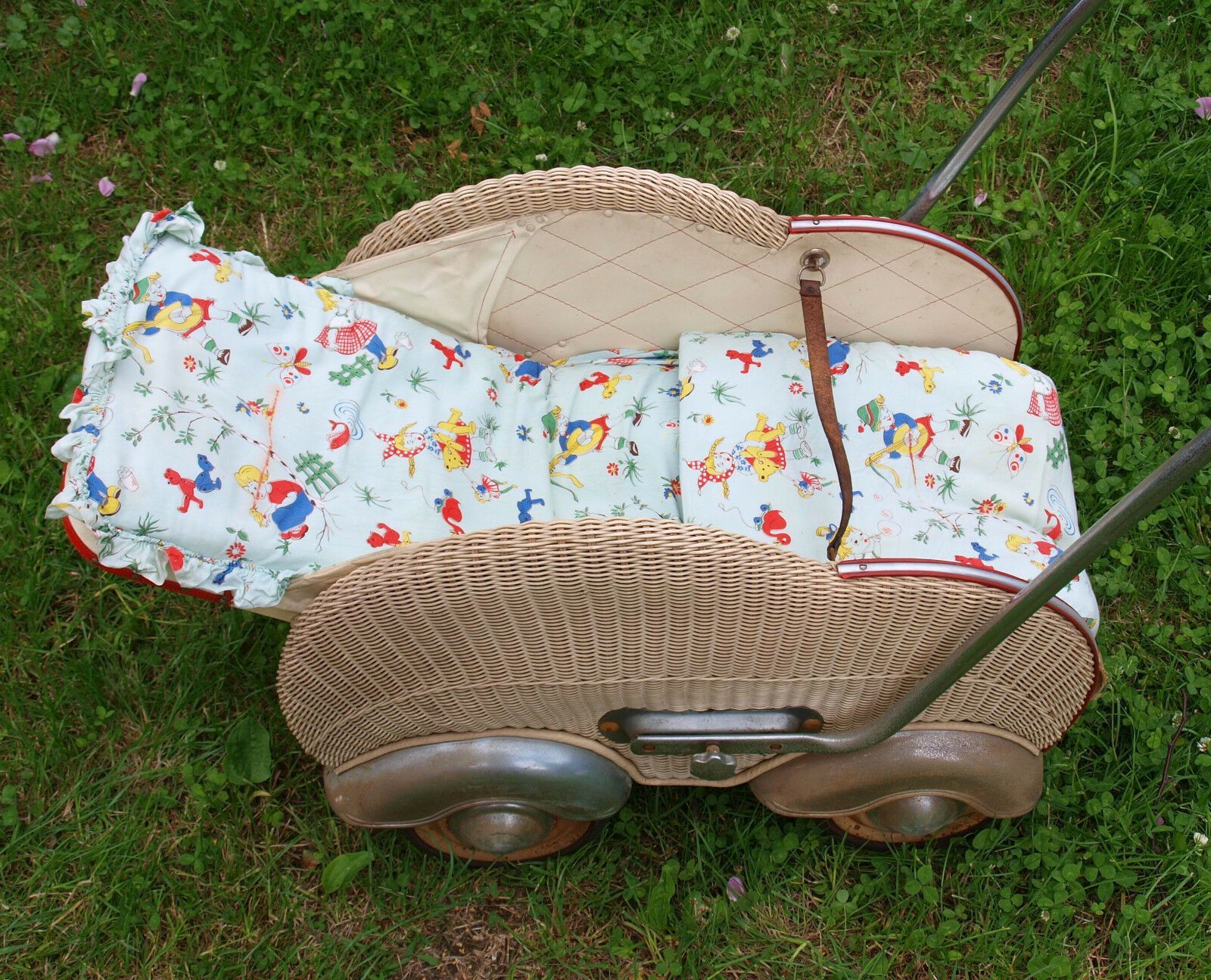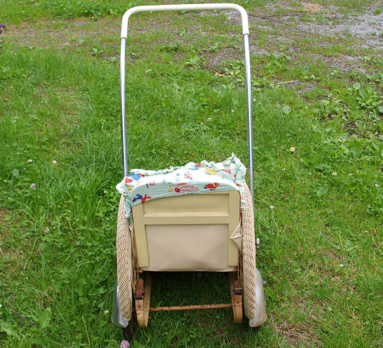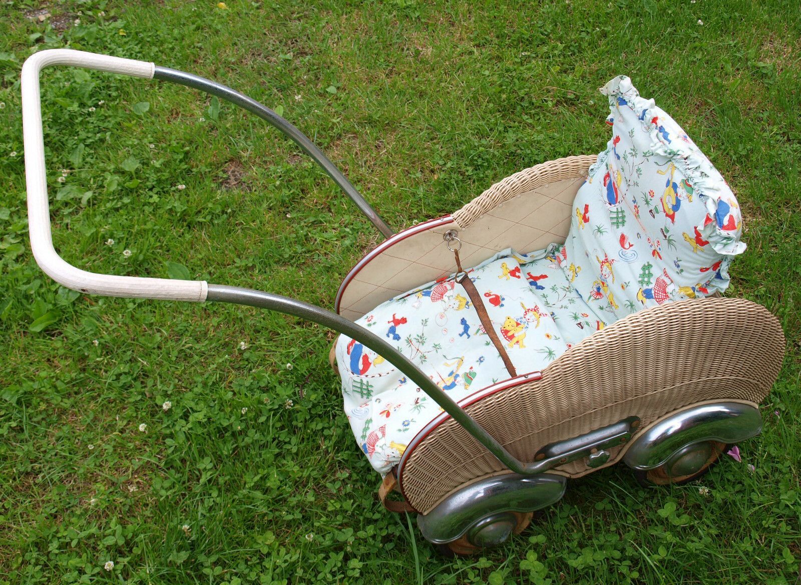 Kinderkarre Sportkarre um 1955. Material: Korbgeflecht. Mit verstellbarem Rücken- und Fußteil. Umstellbarer Griff: Damit kann das Baby wahlweise nach vorn oder hinten schauen. Eisenfedern mit Lederaufhängung, lederner Sicherheitsgurt, Alle Chromteile sind leicht oxydiert, können aber wieder blank ge