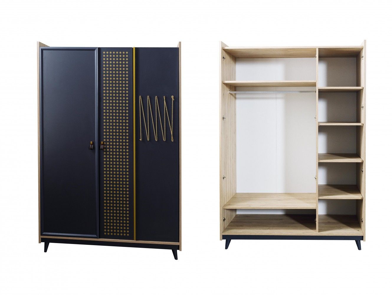 Im Angebot enthalten: 1x Kleiderschrank Dark Point 3x Tür 5x Fächer 2x breite Fächer 1x Kleiderstange modernes Design mit einem Schuss des Retro-Stils Maße ca.: B H T ca. 132x202x62 cm Produktinformationen: Material: Spanplatte Die Qualität und Verarbeitung der Möbel entsprechen den EU Standards Die
