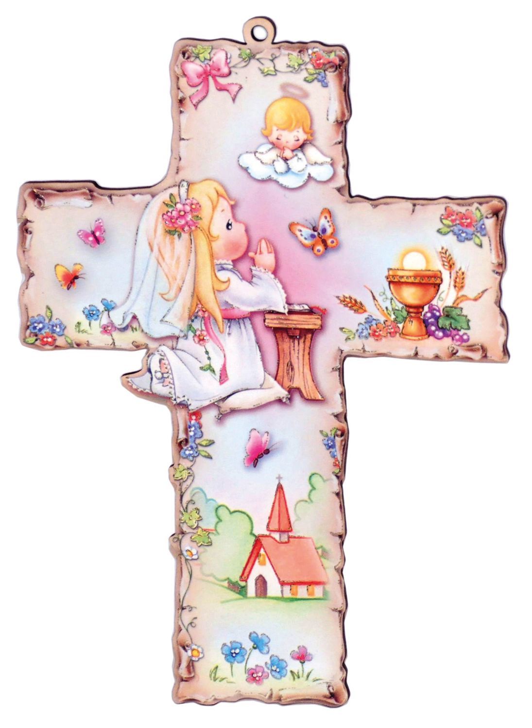 schönes Kreuz zur Kommunion mit Motiv wie abgebildet. Details zum Produkt: Größe: 10,5 x 15,3cm Material: Kunststoff coloriert