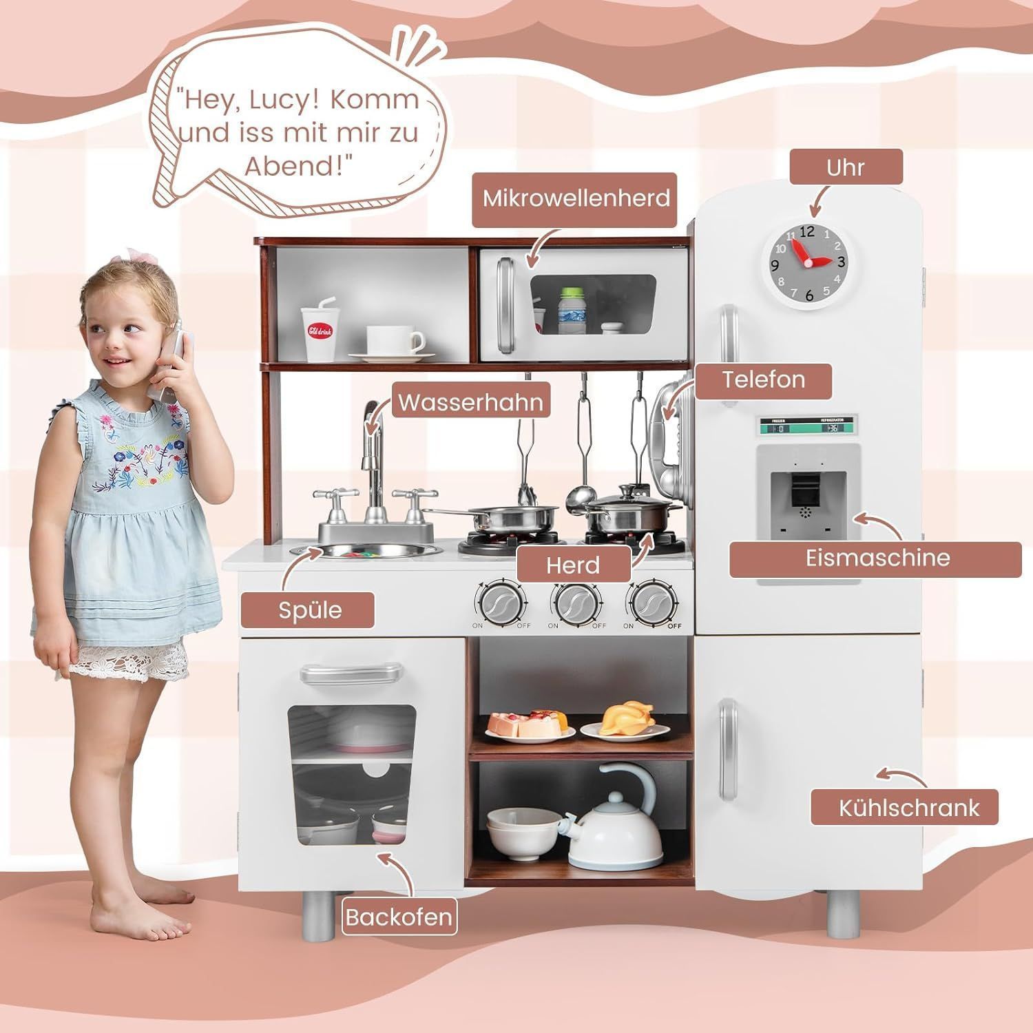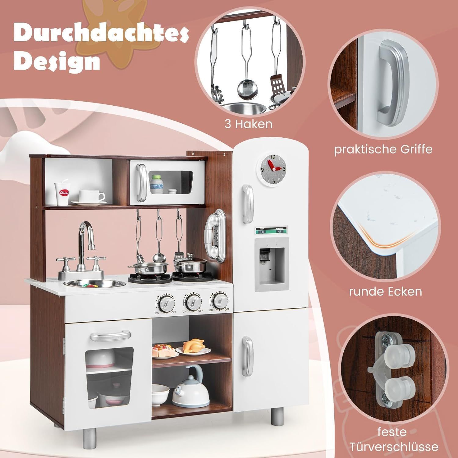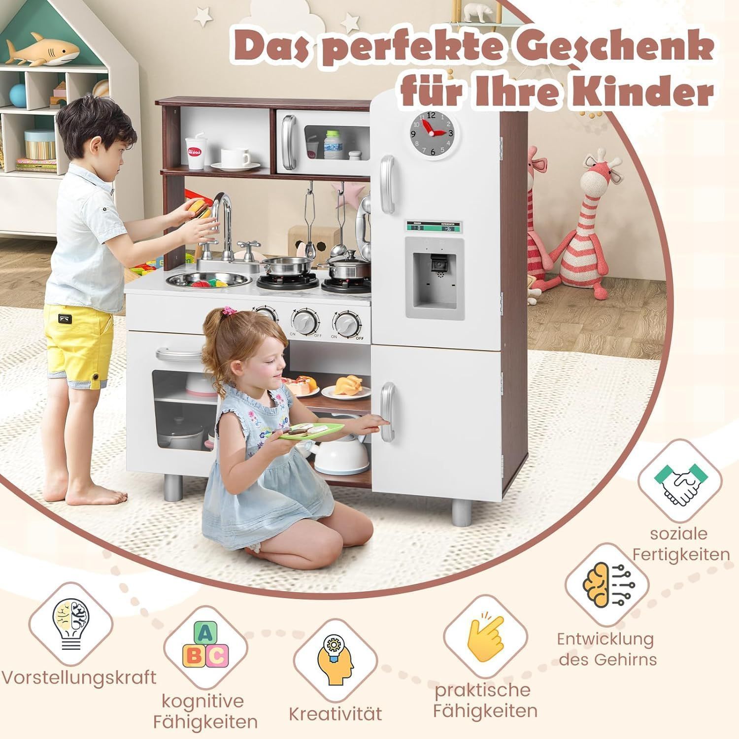 Kinderküche Holz, Spielküche mit Licht und Sound, Spielküchenset mit Herd, Mikrowe