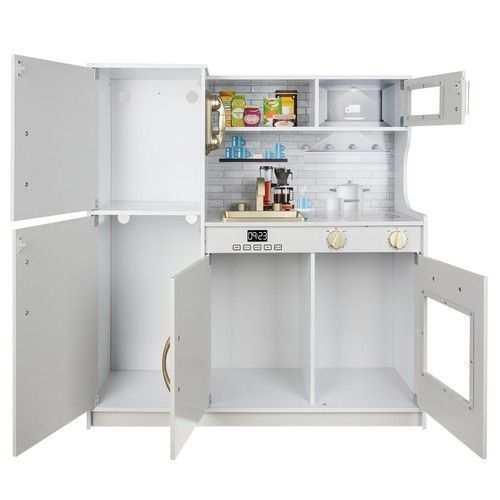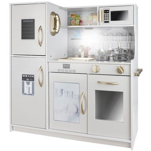 Kinderküche Holz XL Spielküche Weiß Gold mit Licht Sound Zubehör Herd Mikrowelle