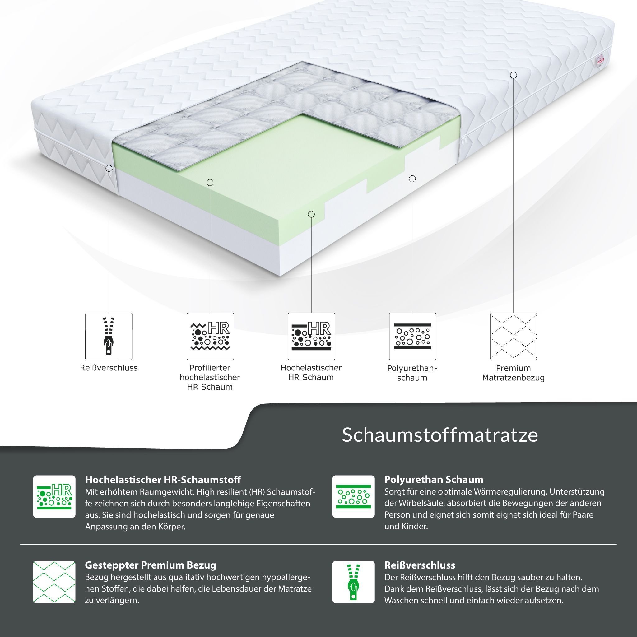 Die Matratze hat eine gute Qualität gut verpackt. Doch eine Sache hat mich sehr gestört. Es wird mit 16 cm dicke Werbung gemacht aber die Matratze ist 14 cm dick. zu 14 cm kann man auch circa 20 cm sagen. 2 cm dünnere Matratze ist circa um die Hälfte günstiger. daher nur 3 Sterne Mfg