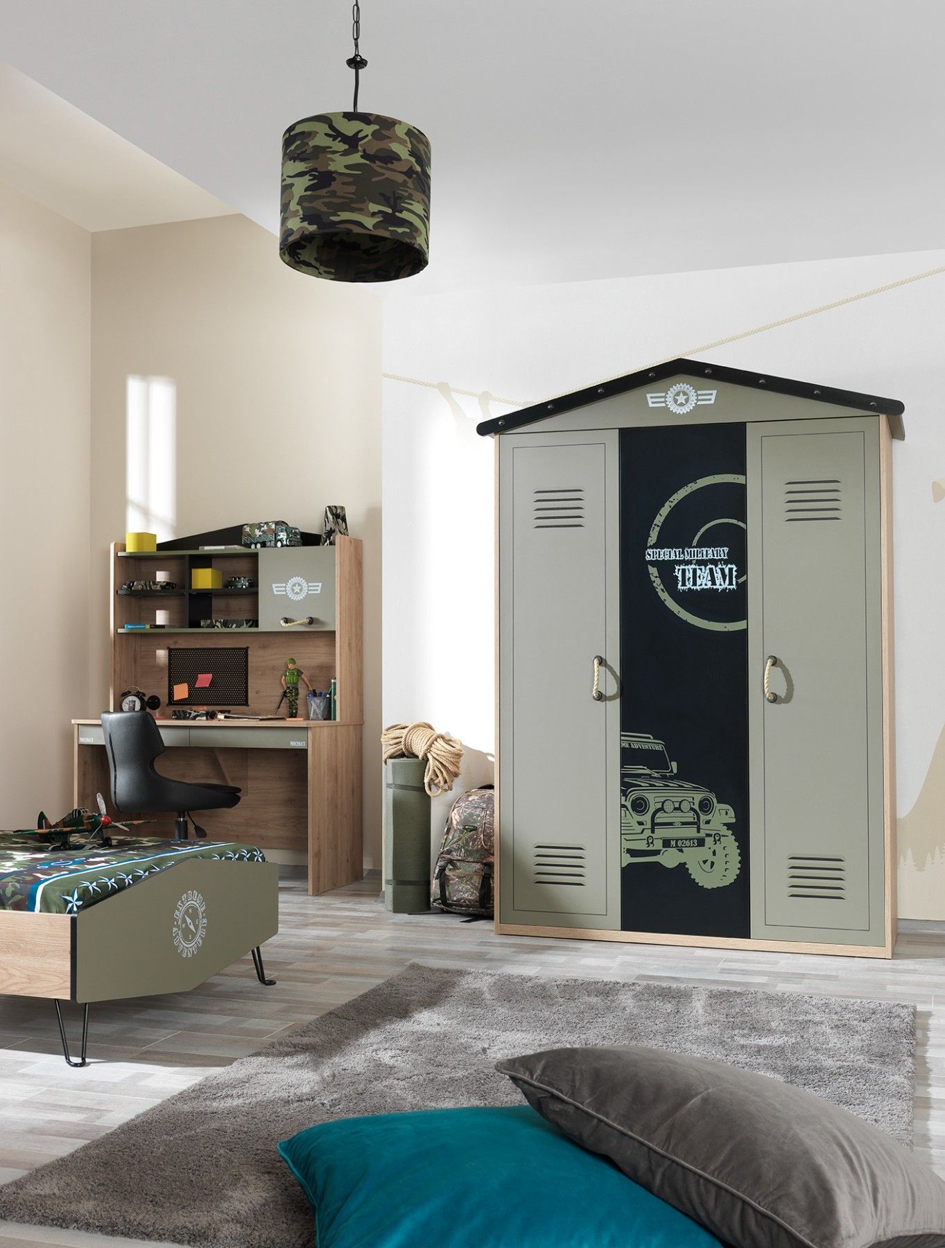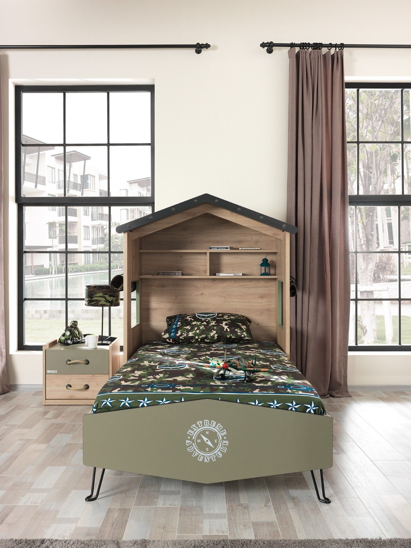 1 x Jugendbett CAMP: Jugendbett mit außergewöhnlichen Kopfteil Kopfteil vergleichbar mit einer offenen Hütte mit eigenen Fenstern + Rolläden und zusätzlichem Stauraum Liegefläche: 100 x 200cm eine Spanplatte ist inklusive, diese wird als Lattenrost verwendet Maße Jugendbett: B T H 122 x 210 x 150 cm