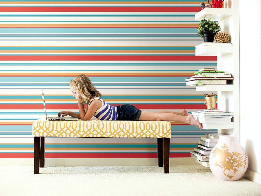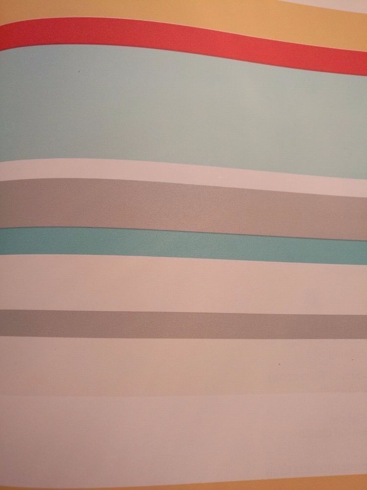 KinderTapete, Designtapete, Querstreifen, fröhlich, Türkis, Rot, Silbergrau