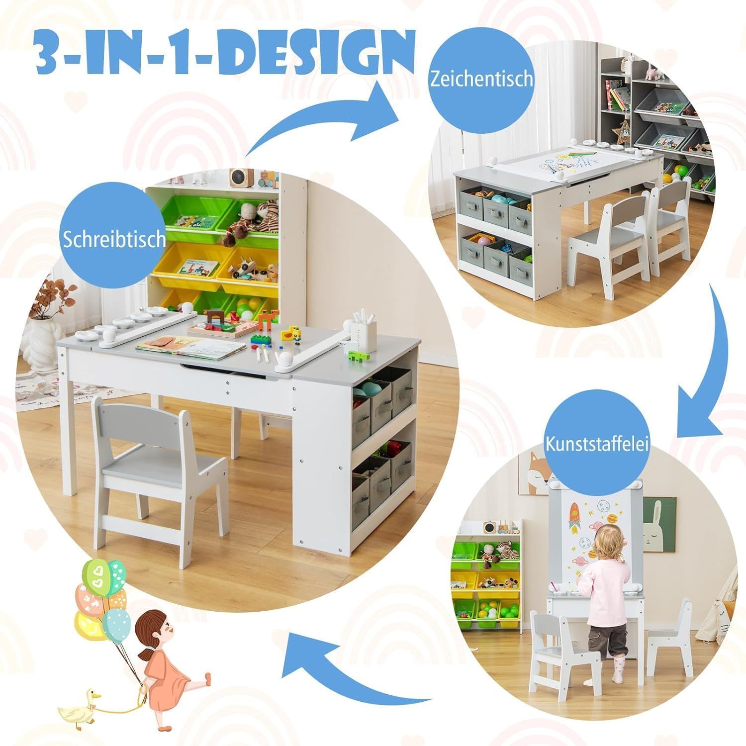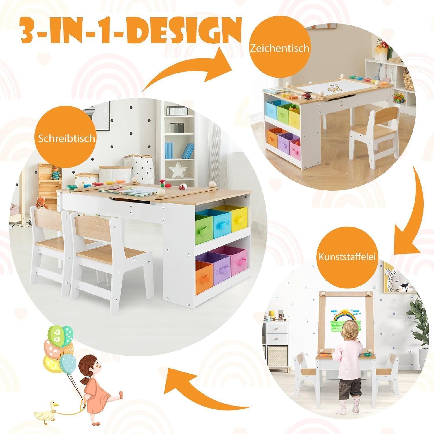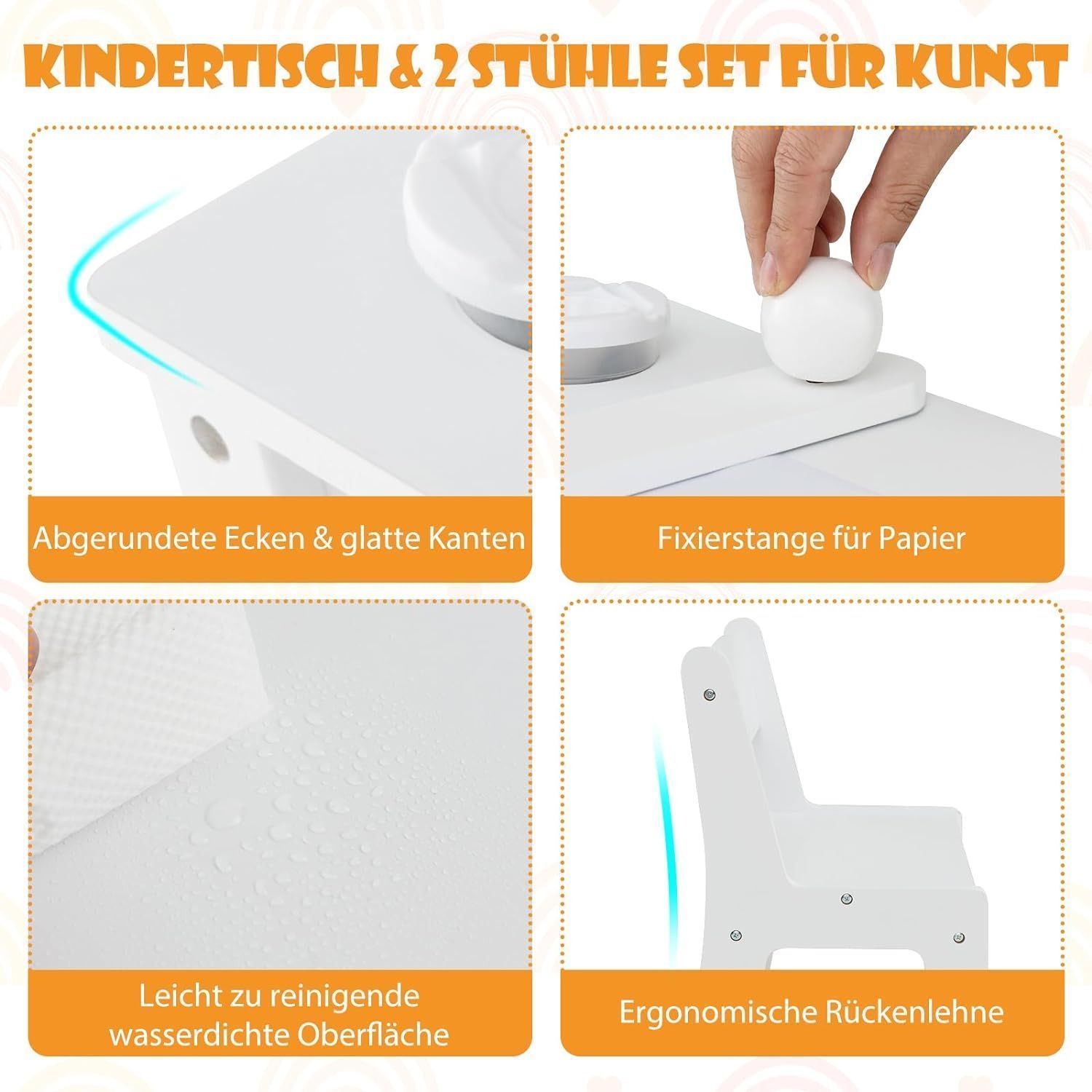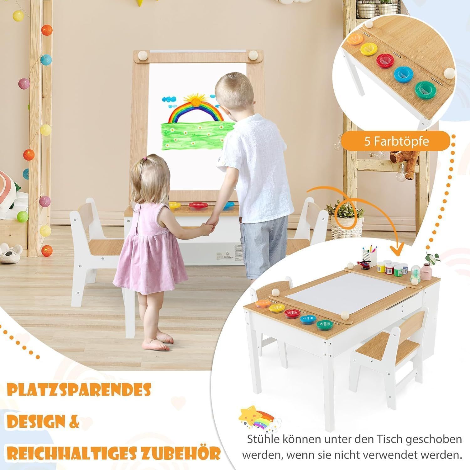 Kindertisch mit 2 Stühlen, 3 in 1 Aktivitätstisch & Staffelei aus Holz, sitzgruppe