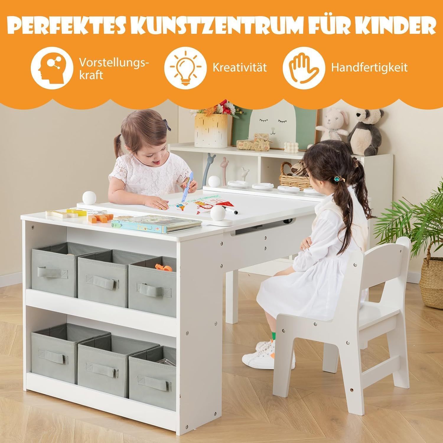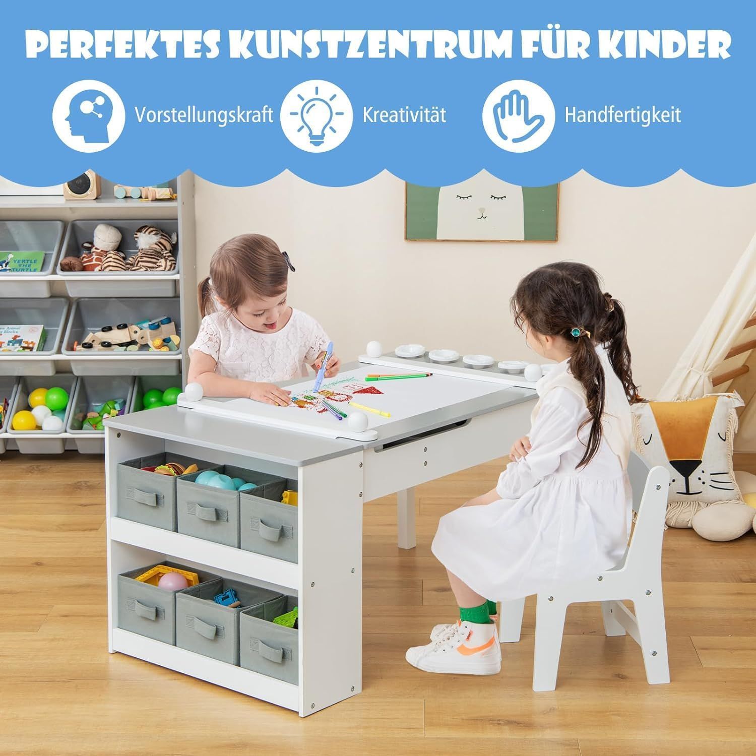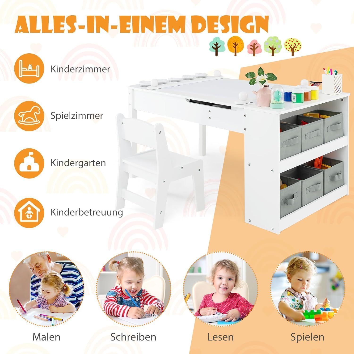 Kindertisch mit 2 Stühlen, 3 in 1 Aktivitätstisch & Staffelei aus Holz, sitzgruppe