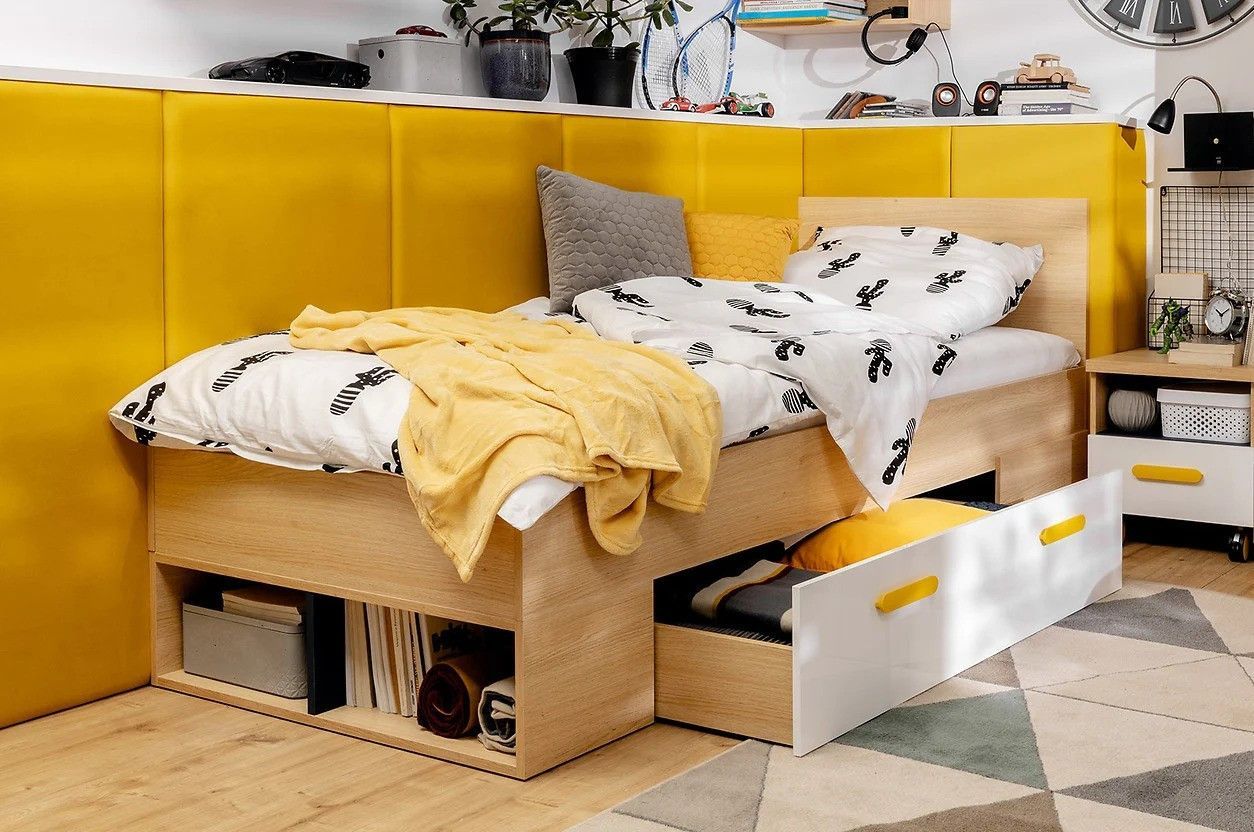 Kinderzimmer Wesker - Beispiel Zusammenstellung 1 alle Möbelteile sind einzeln bestellbar - bitte anfragen Eiche polnisch uni dunkelblau weiß spiegelglanz Lieferumfang: Wandregal POL B T H 89,5 22 60 cm Bett LOZ 90 B L H 94 204 90-45 cm Bettschublade SZU B L H 79,5 174 27,5 cm Rollcontainer KTN1S B