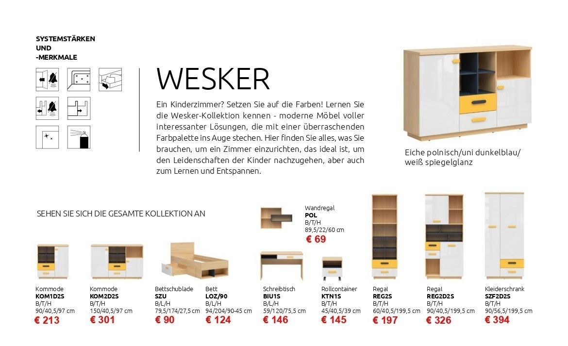 Kinderzimmer Wesker - Beispiel Zusammenstellung 2 alle Möbelteile sind einzeln bestellbar - bitte anfragen Eiche polnisch uni dunkelblau weiß spiegelglanz Lieferumfang: Bett LOZ 90 B L H 94 204 90-45 cm Bettschublade SZU B L H 79,5 174 27,5 cm Rollcontainer KTN1S B T H 45 40,5 39 cm Schreibtisch BIU