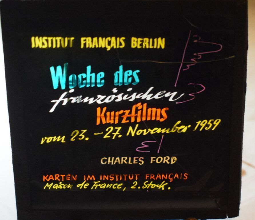 Kinowerbung Glasplatte Dia 8 x 8cm - Woche des französischen Kurzfilmes Institut Français Berlin EuroCinema ParisEuro Dia als Glasplatte, Kinowerbung für Vorstellungen Es handelt sich hier um Glasplatten die im Kino Präsentiert wurden. Sie funktionierten ähnlich wie die späteren Diaprojektoren. Maße