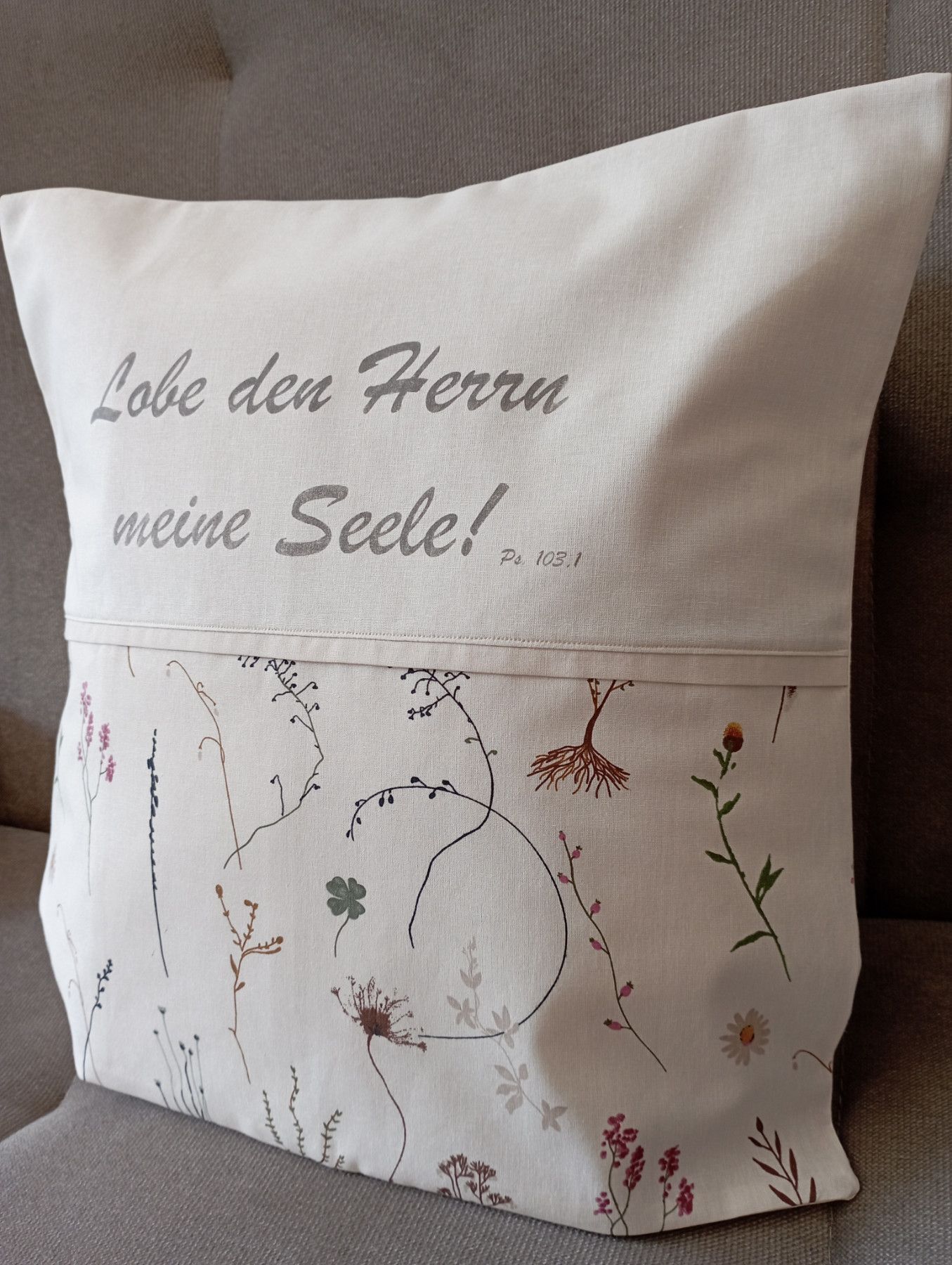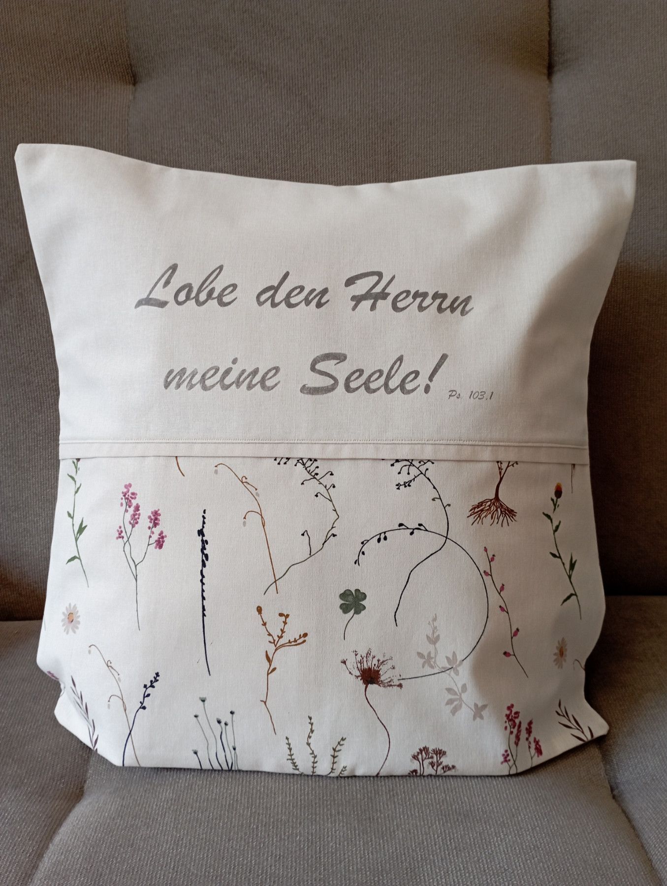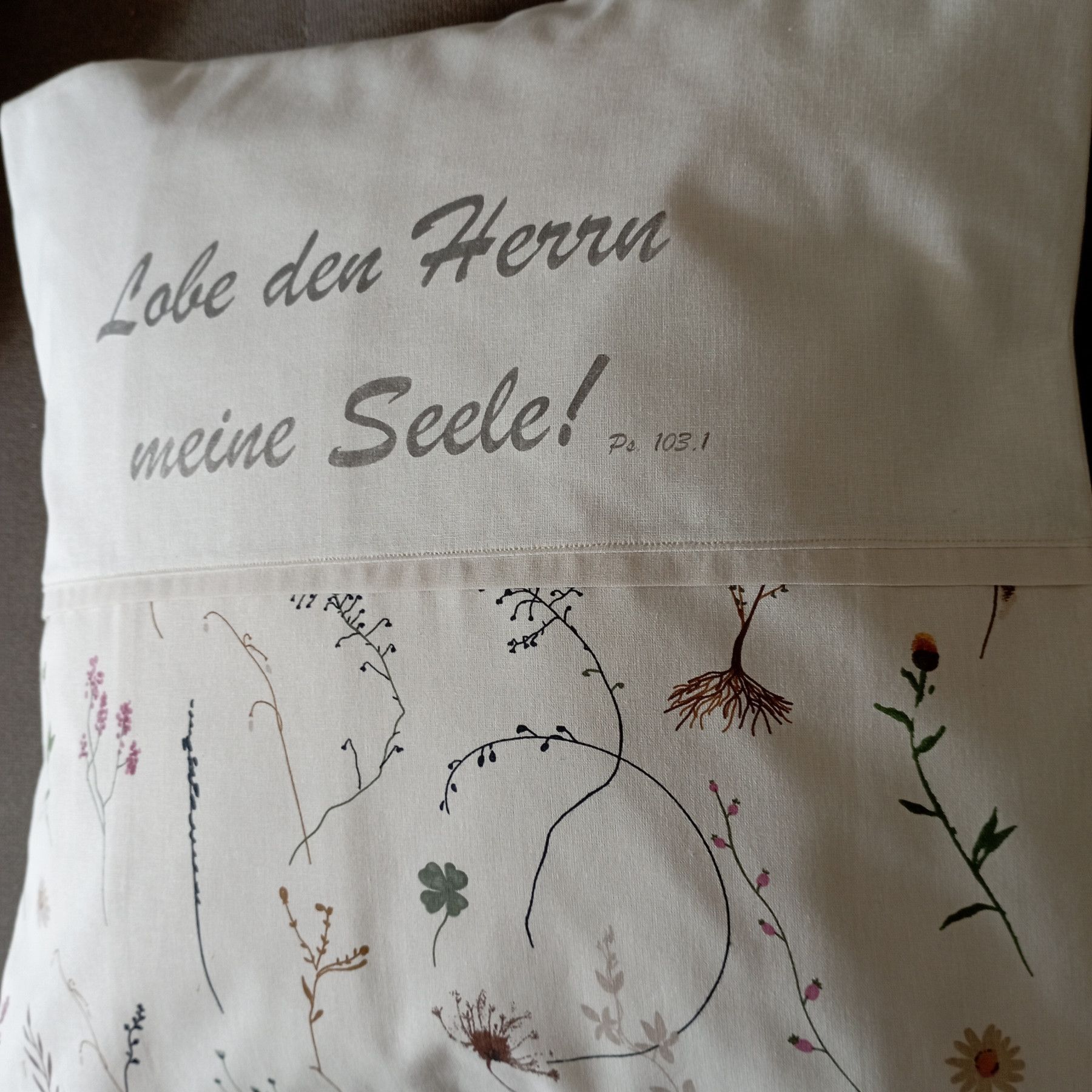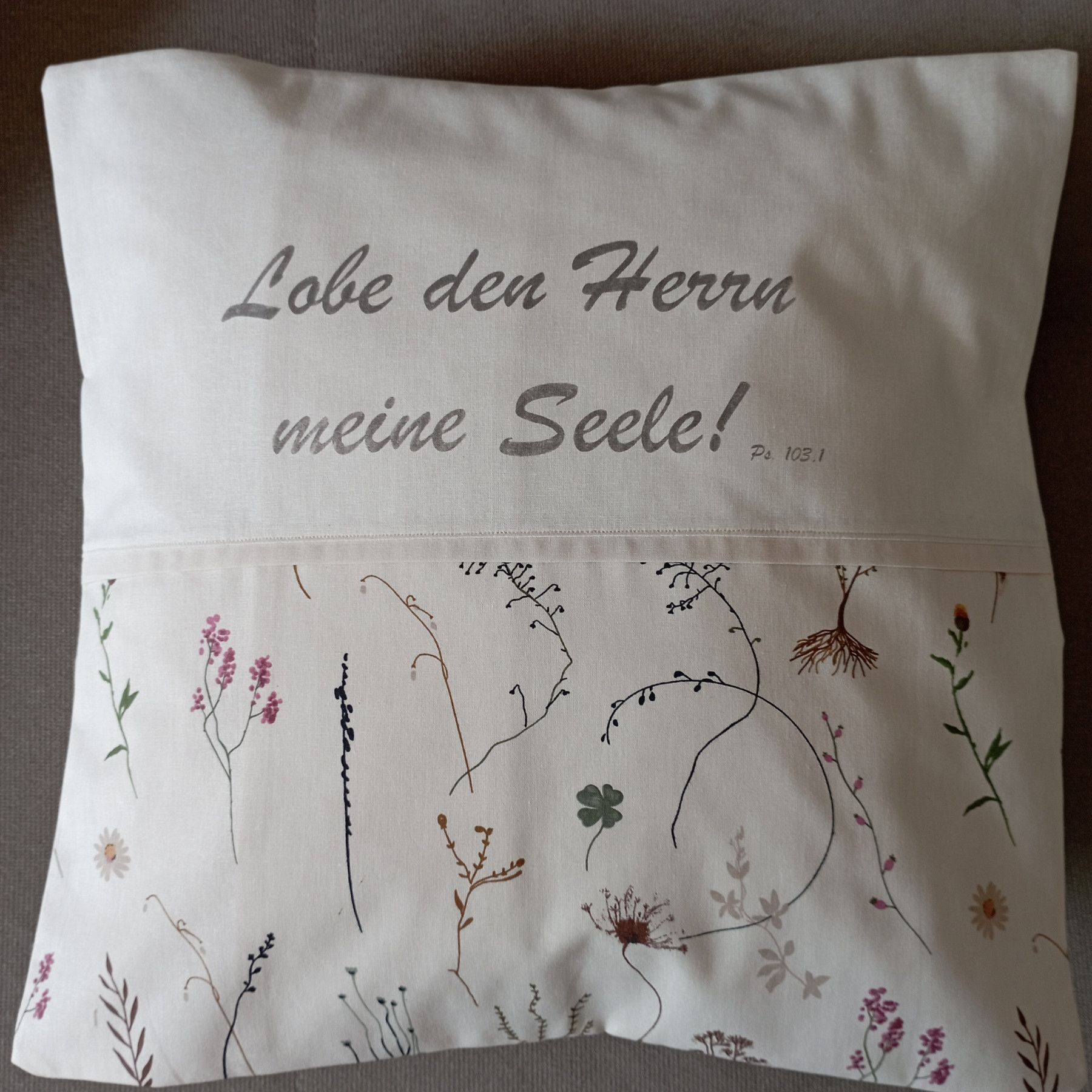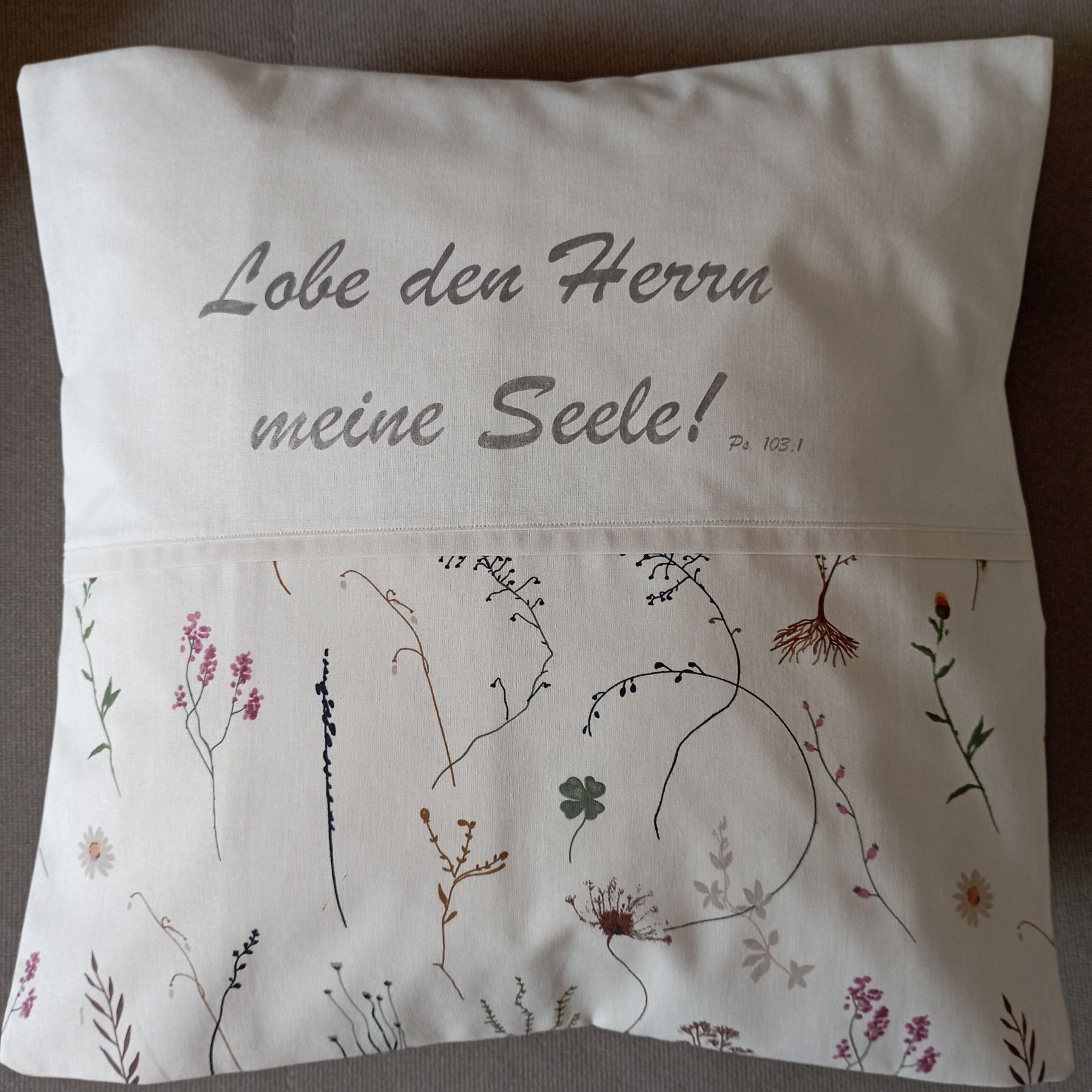 Kissen "Lobe den Herrn" Größe: 40 x 40 cm Farbe: Beige, Bunt Material: 100% Baumwolle Psalm 103,1 Handmade by Dekospezial