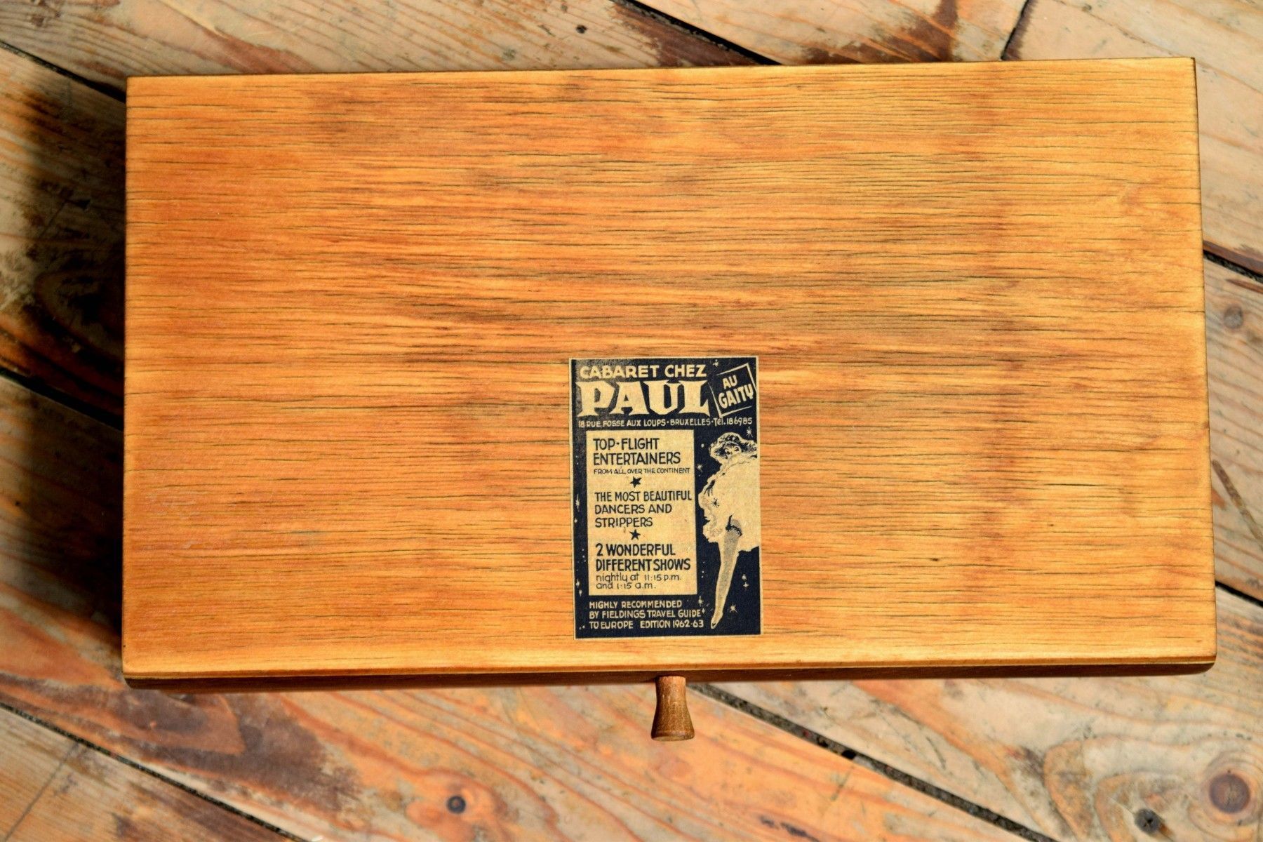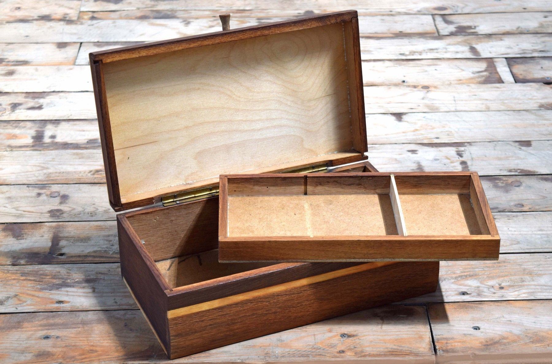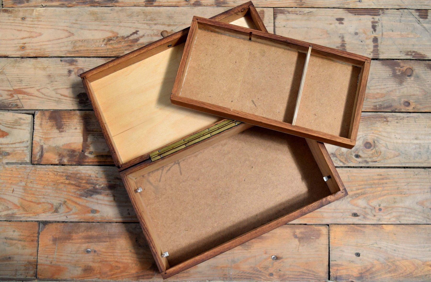 charakterstarke historische Kiste aus Vollholz (überwiegend Eiche massiv) mit Gebrauchsspuren, schöner Zustand, stabil, geruchfrei, sauber Höhe 12,8m, Breite 31cm, Tiefe 22cm innen mit Einsatz, verschiedene Verstaumöglichkeiten gemarkt mit wundervoller alter Reklame aus den 60er Jahren Diese charmante antike Truhe bietet Stauraum für tausend kleine Dinge. Die Lieferung ist innerhalb Deutschlands kostenlos und erfolgt per DHL- Paket.