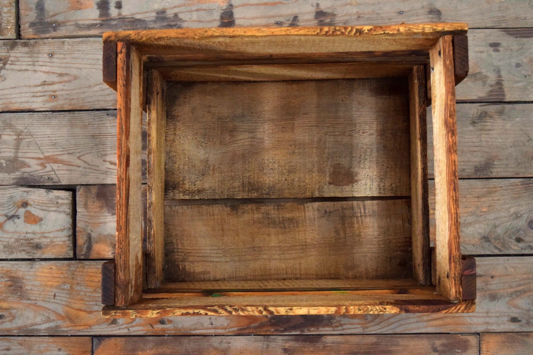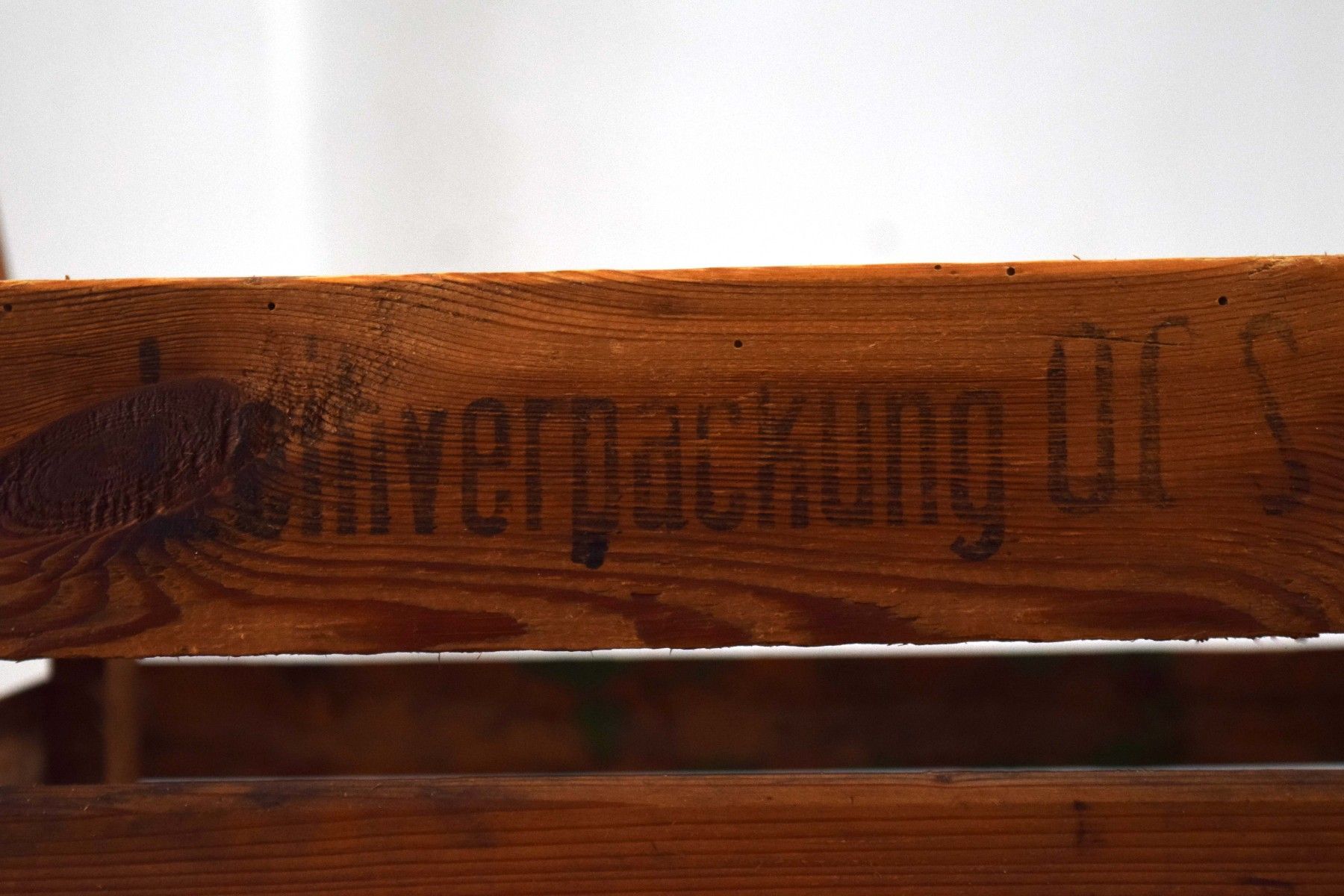 historische Getränkekiste (um 1975) aus dickem Vollholz (Kiefer) mit Gebrauchsspuren, guter Zustand, stabil doppelt (beidseitig) gemarkt mit "Leihverpackung OGS" Höhe 25cm, Breite 45cm, Tiefe 34cm nutzbares Innenmaß: 23 x 36 x 23cm Die Lieferung ist innerhalb Deutschlands kostenlos und erfolgt per DHL- Paket.