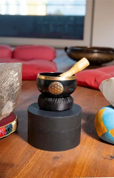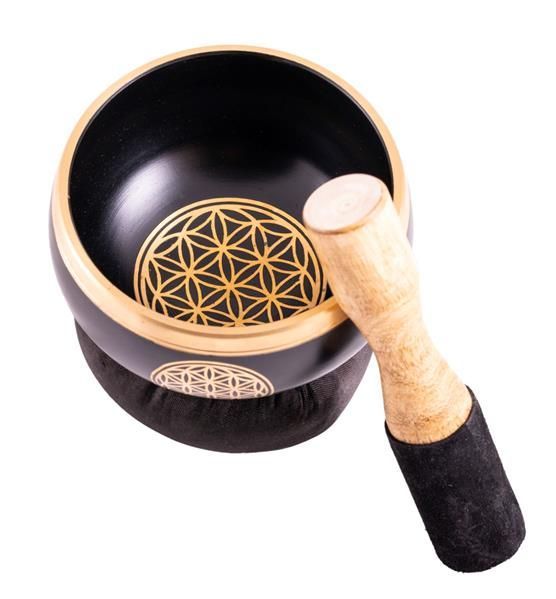 Klangschalen-Set BLUME DES LEBENS ø 11,5 cm schwarz-gold Geschenkbox Klangstab