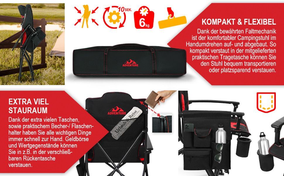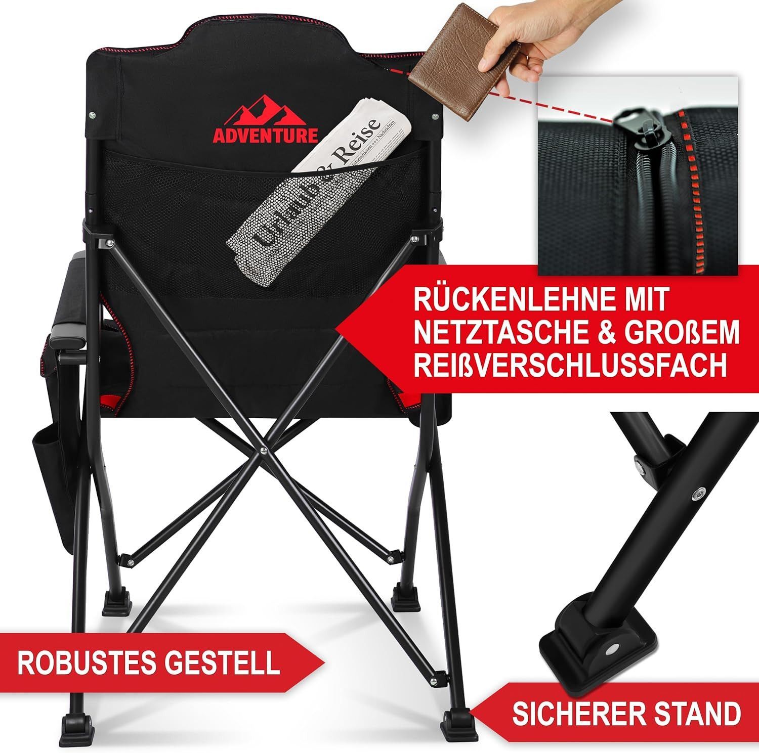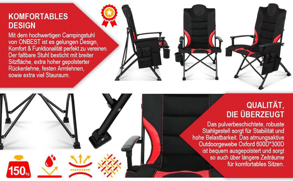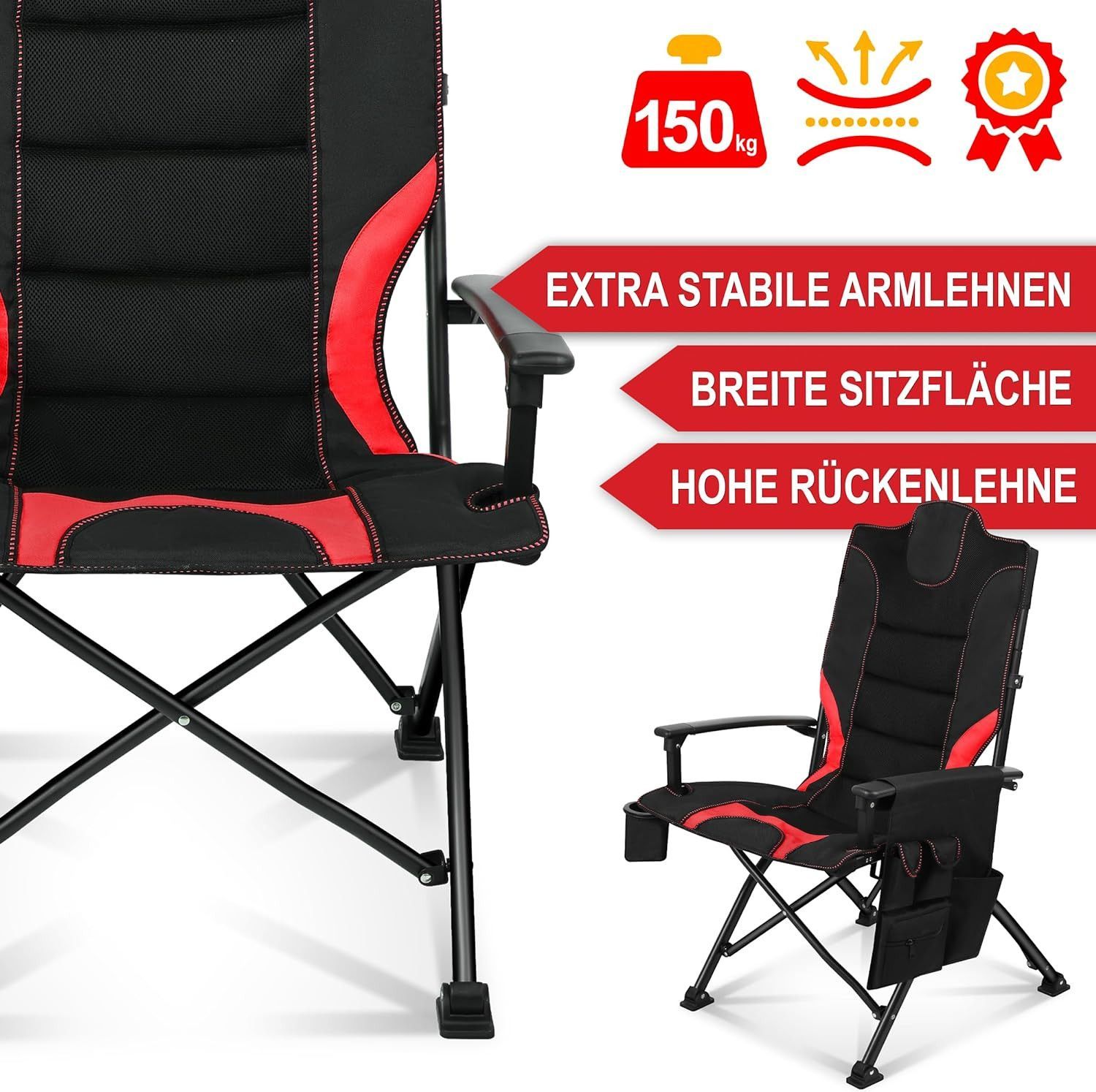 Campingstuhl Der Campingstuhl vereint herausragendes Design, erstklassigen Komfort und höchste Funktionalität. Dieser faltbare Stuhl bietet eine breite Sitzfläche, eine extra hohe gepolsterte Rückenlehne und stabile Armlehnen, die für maximalen Komfort sorgen. Zusätzlich bietet der Stuhl eine Vielza