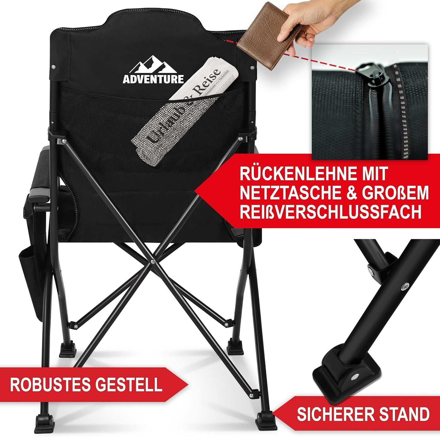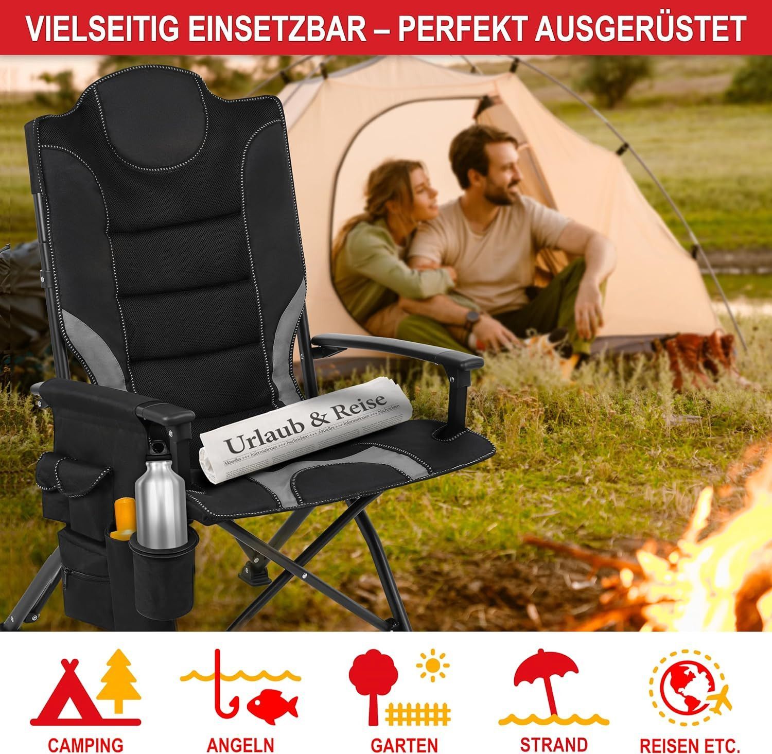 Campingstuhl Der Campingstuhl vereint herausragendes Design, erstklassigen Komfort und höchste Funktionalität. Dieser faltbare Stuhl bietet eine breite Sitzfläche, eine extra hohe gepolsterte Rückenlehne und stabile Armlehnen, die für maximalen Komfort sorgen. Zusätzlich bietet der Stuhl eine Vielza