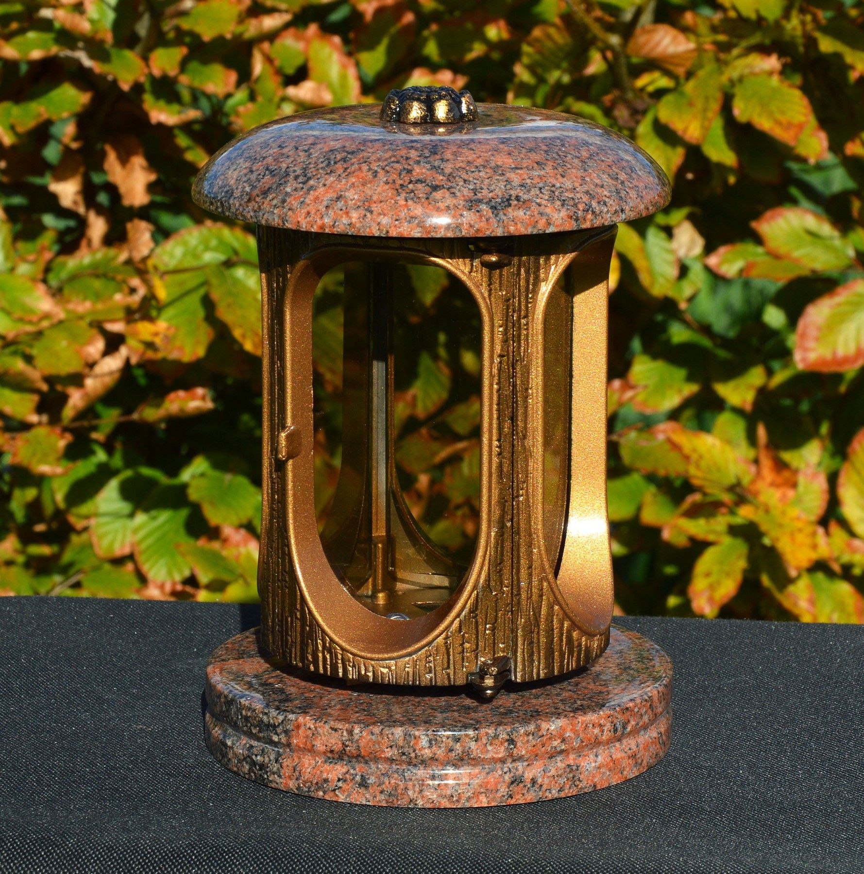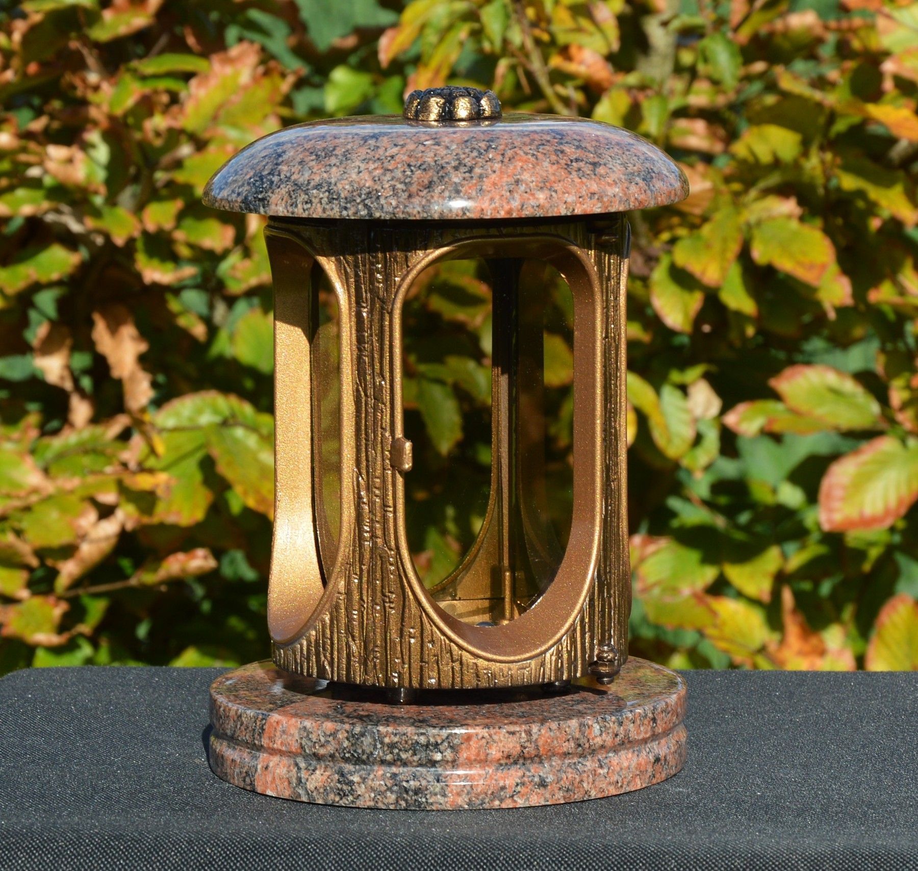 Grablaterne - aus Granit Aurora - klassische Form - Aluminiumgehäuse - mit 4 Scheiben aus Glas - für Kerzen bis. 6 x 12 cm geeignet - ca. 15 x 23 cm