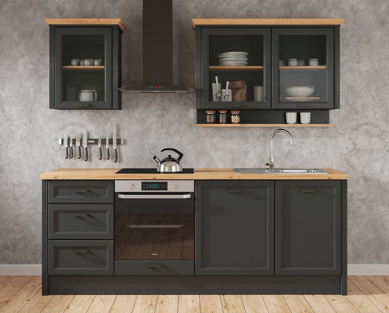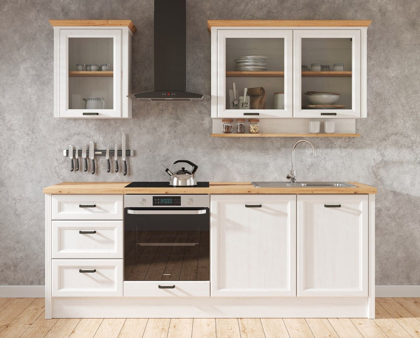 Klassische Küche, Schränke, Küchenzeile 230 cm hell oder grau - ohne Arbeitsplatte